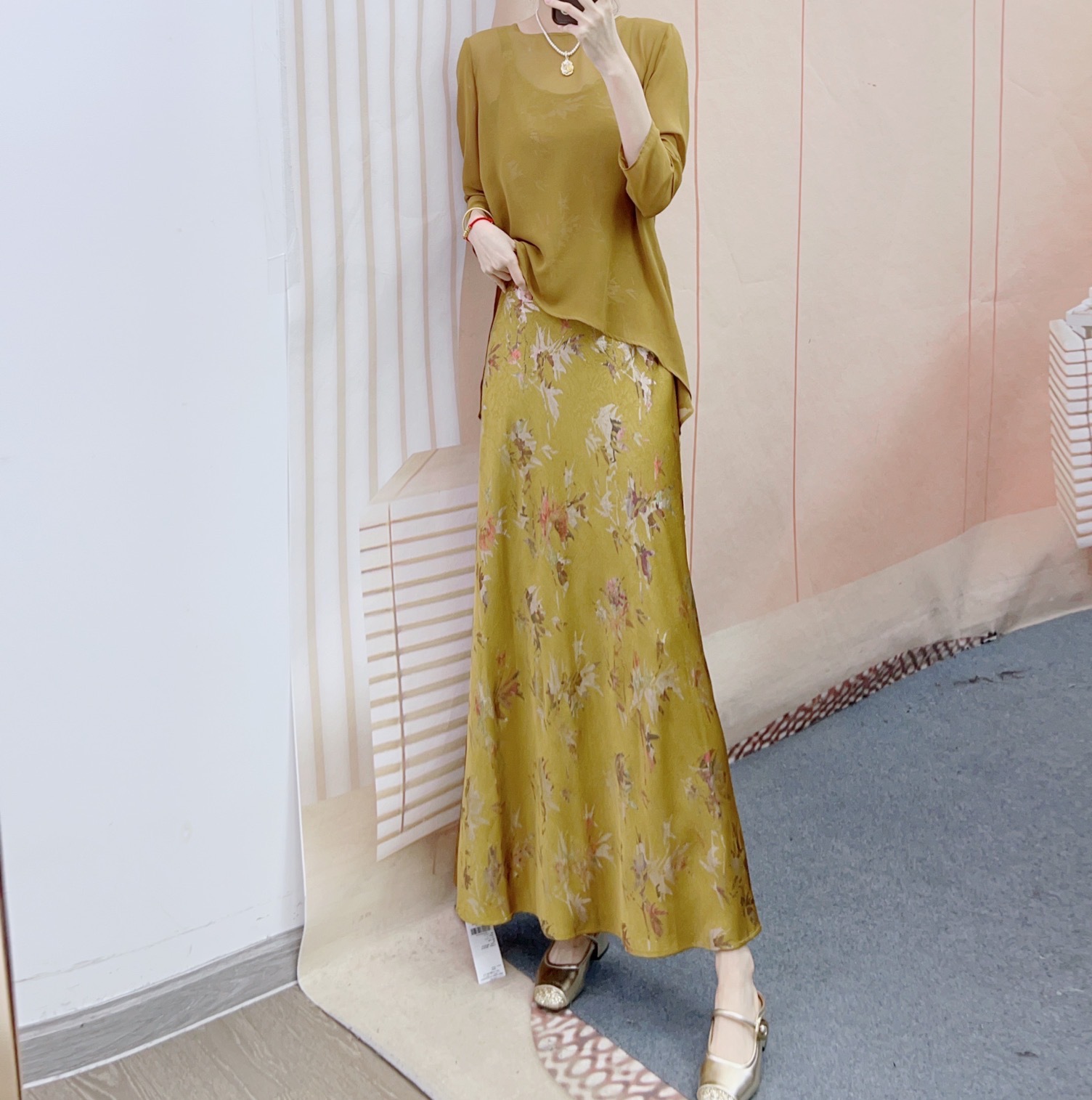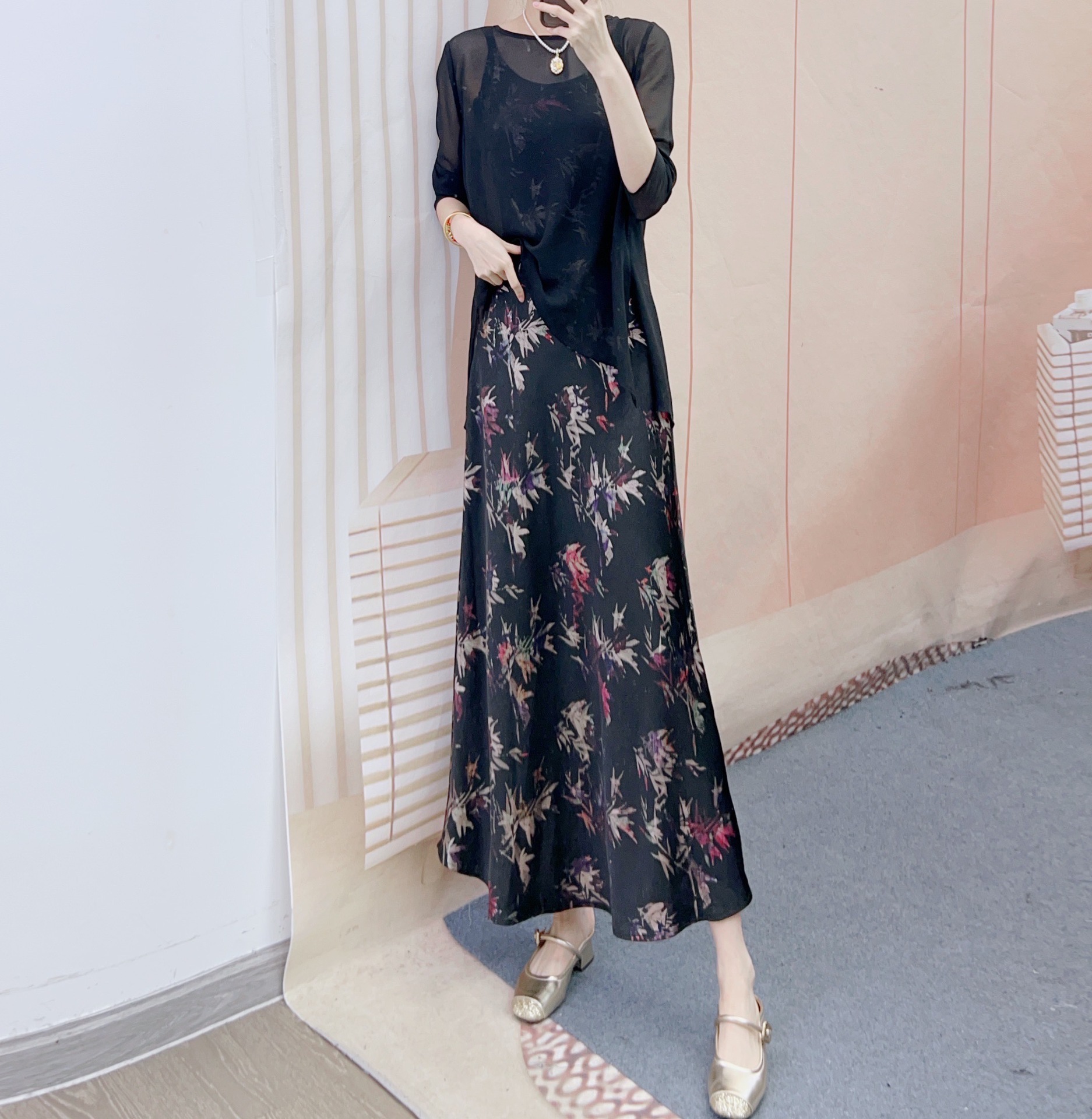 2025 신상품 Hanpai 패션 루즈 블라우스 + 프린트 서스펜더 드레스 투피스 스커트 165