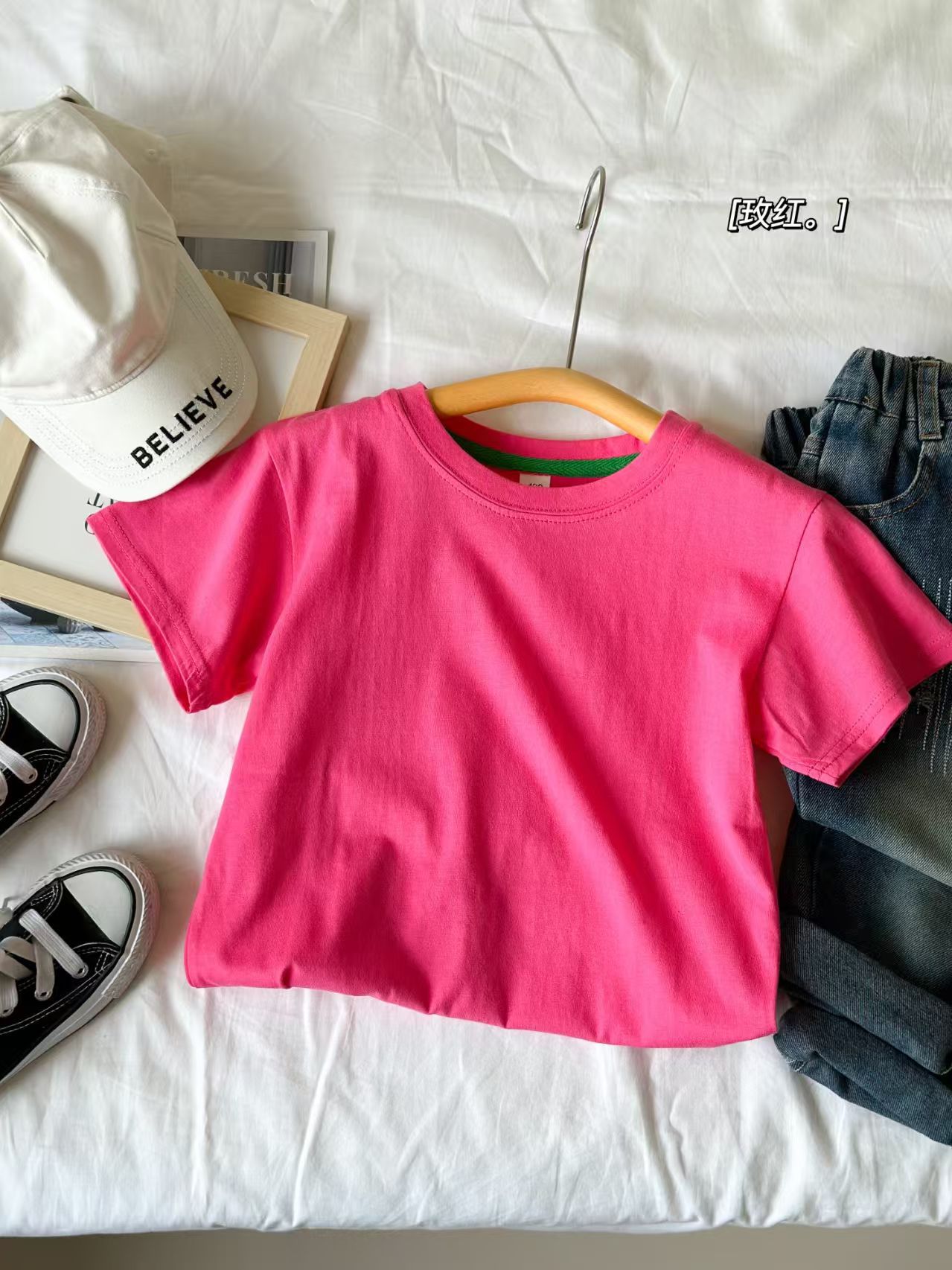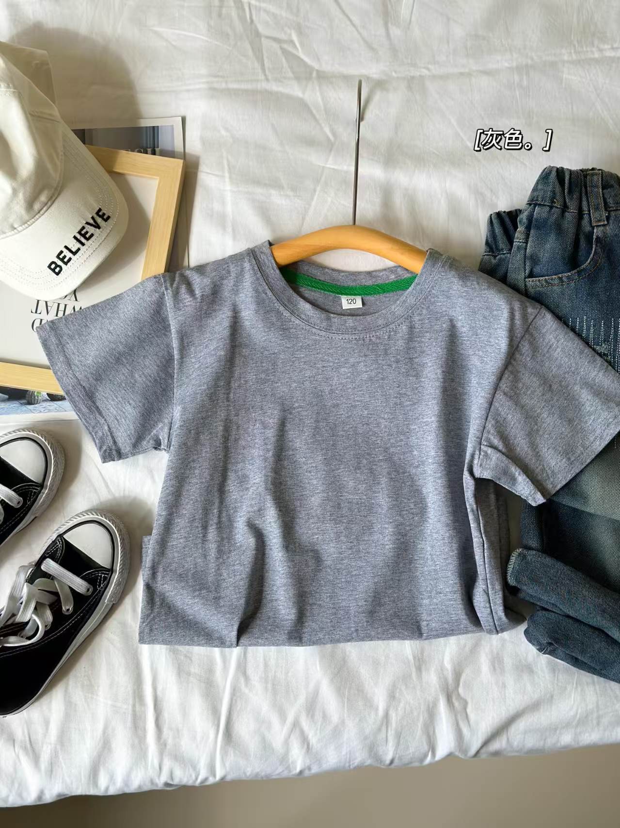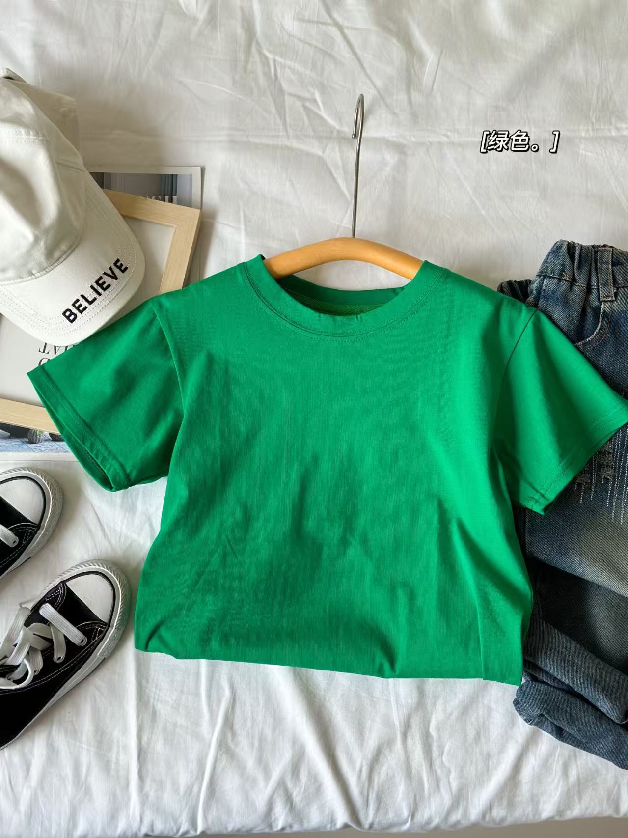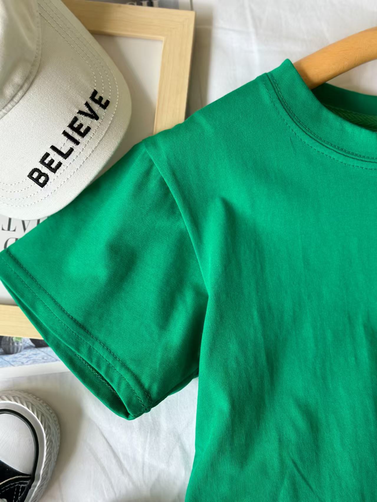 2025 여름 캔디 컬러 어린이 간단한 솔리드 컬러 라운드 넥 순수 코튼 활기찬 남성과 여성의 같은 스타일 티셔츠 탑 도매스토어 가기