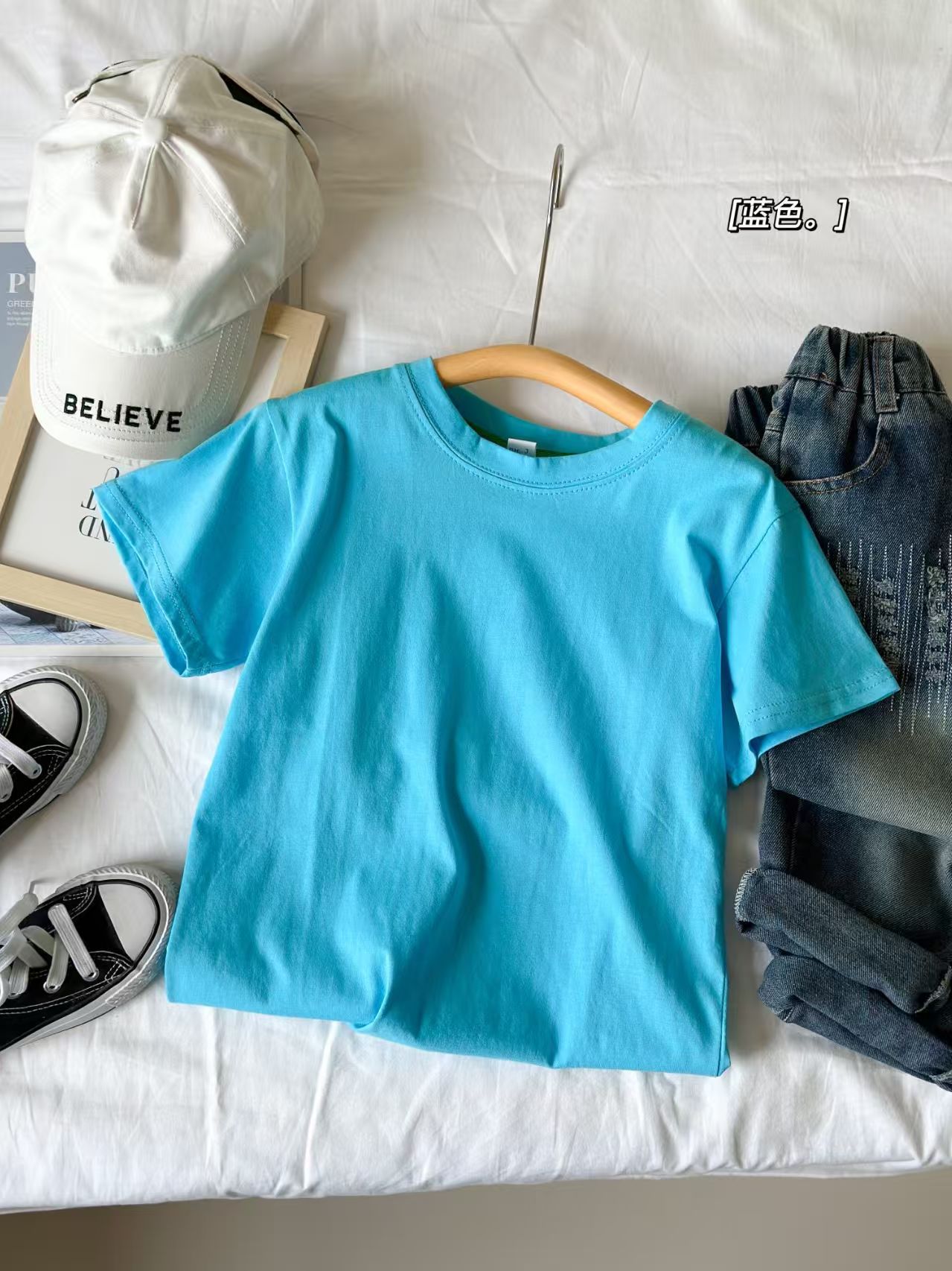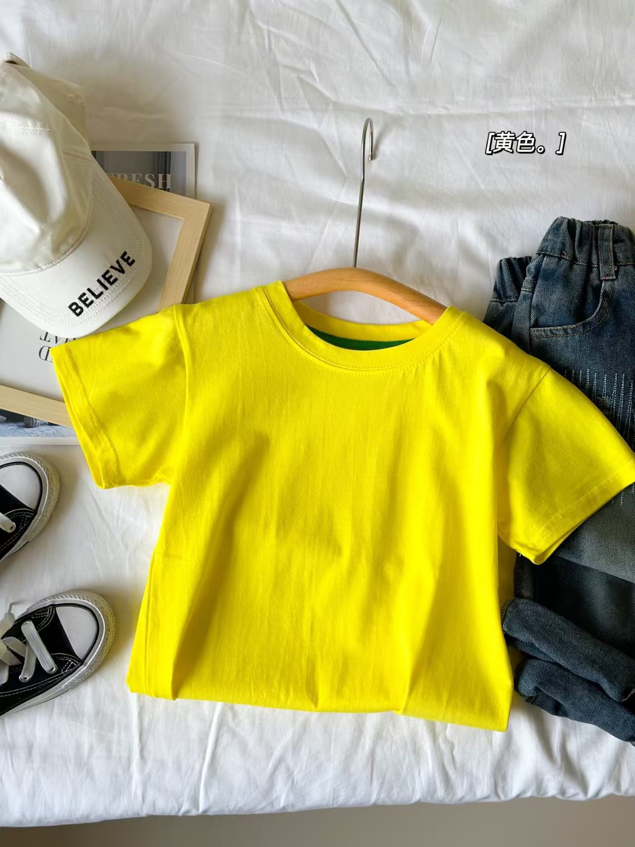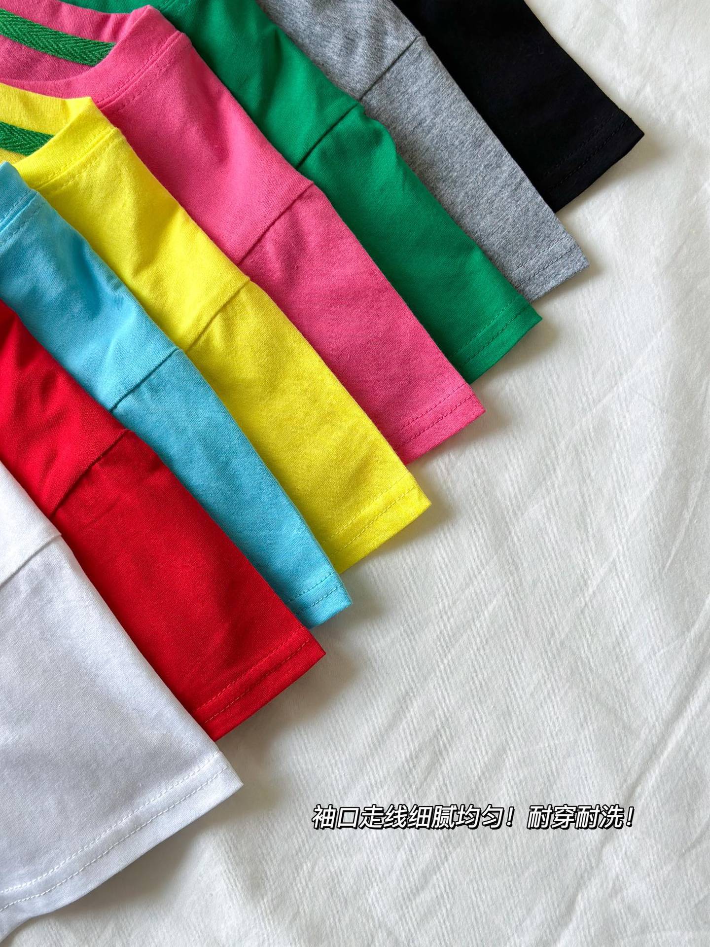 2025 여름 캔디 컬러 어린이 간단한 솔리드 컬러 라운드 넥 순수 코튼 활기찬 남성과 여성의 같은 스타일 티셔츠 탑 도매스토어 가기