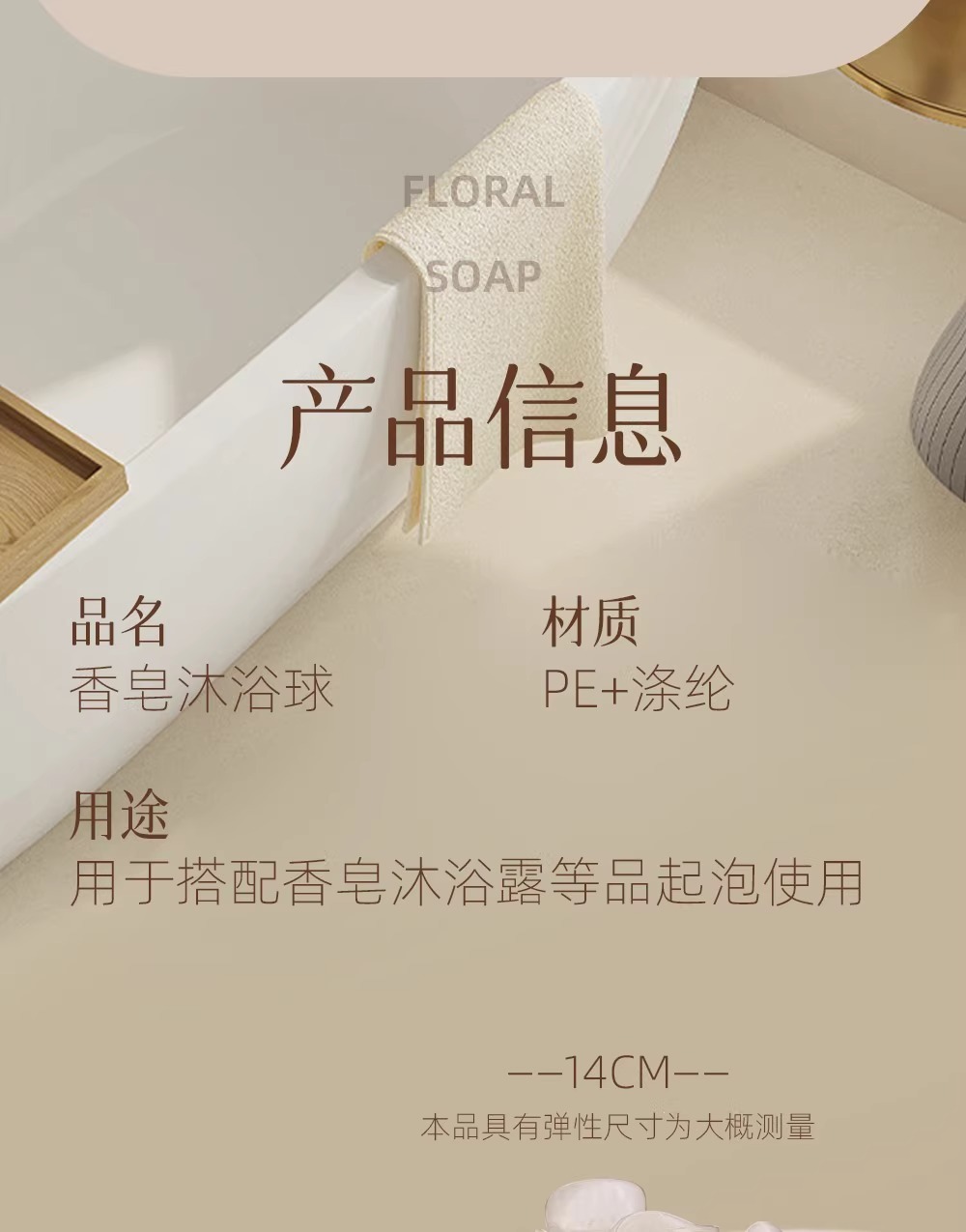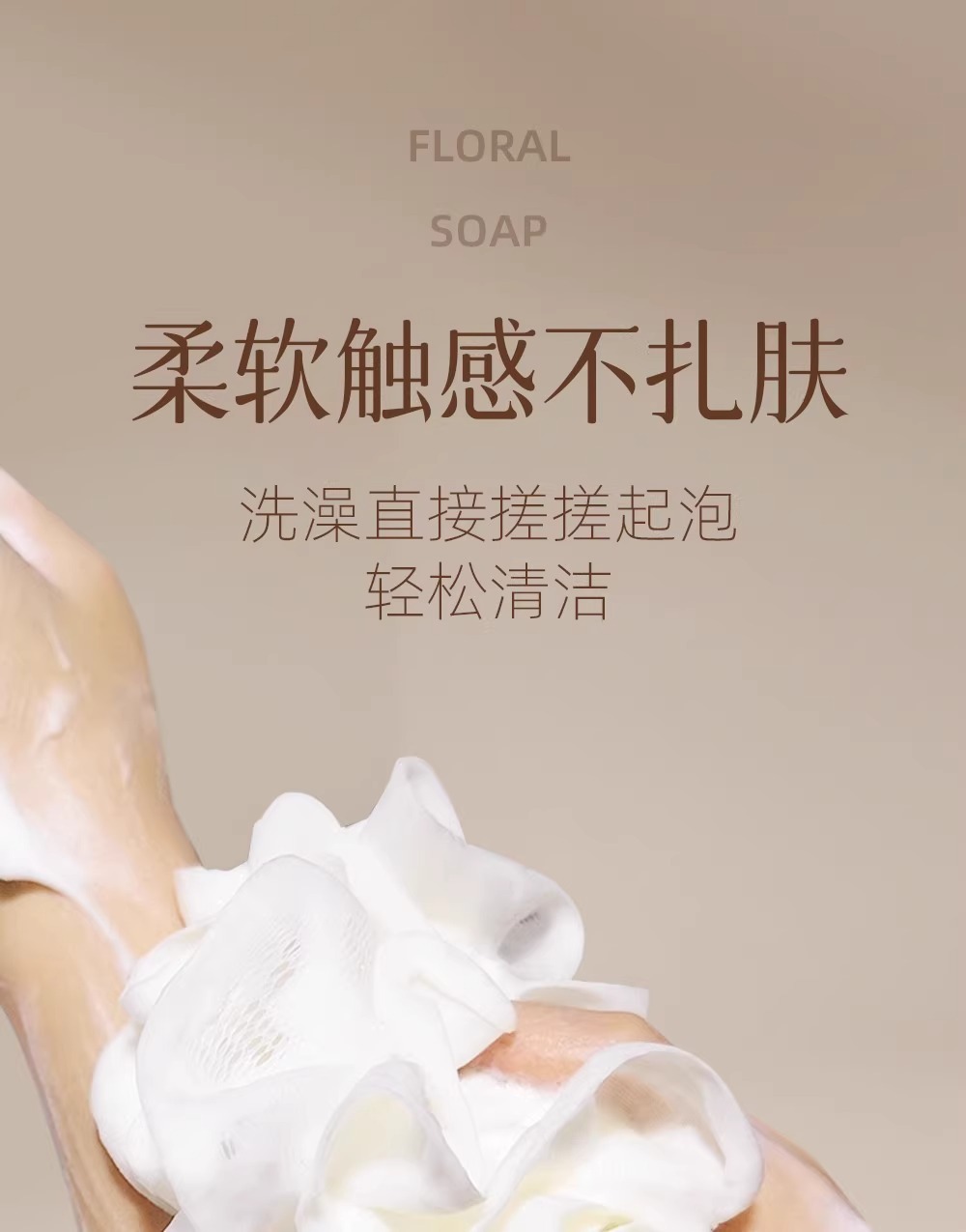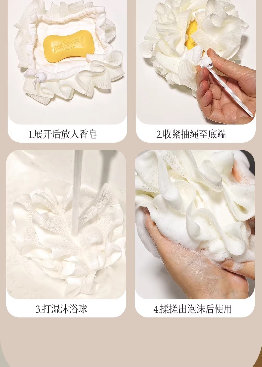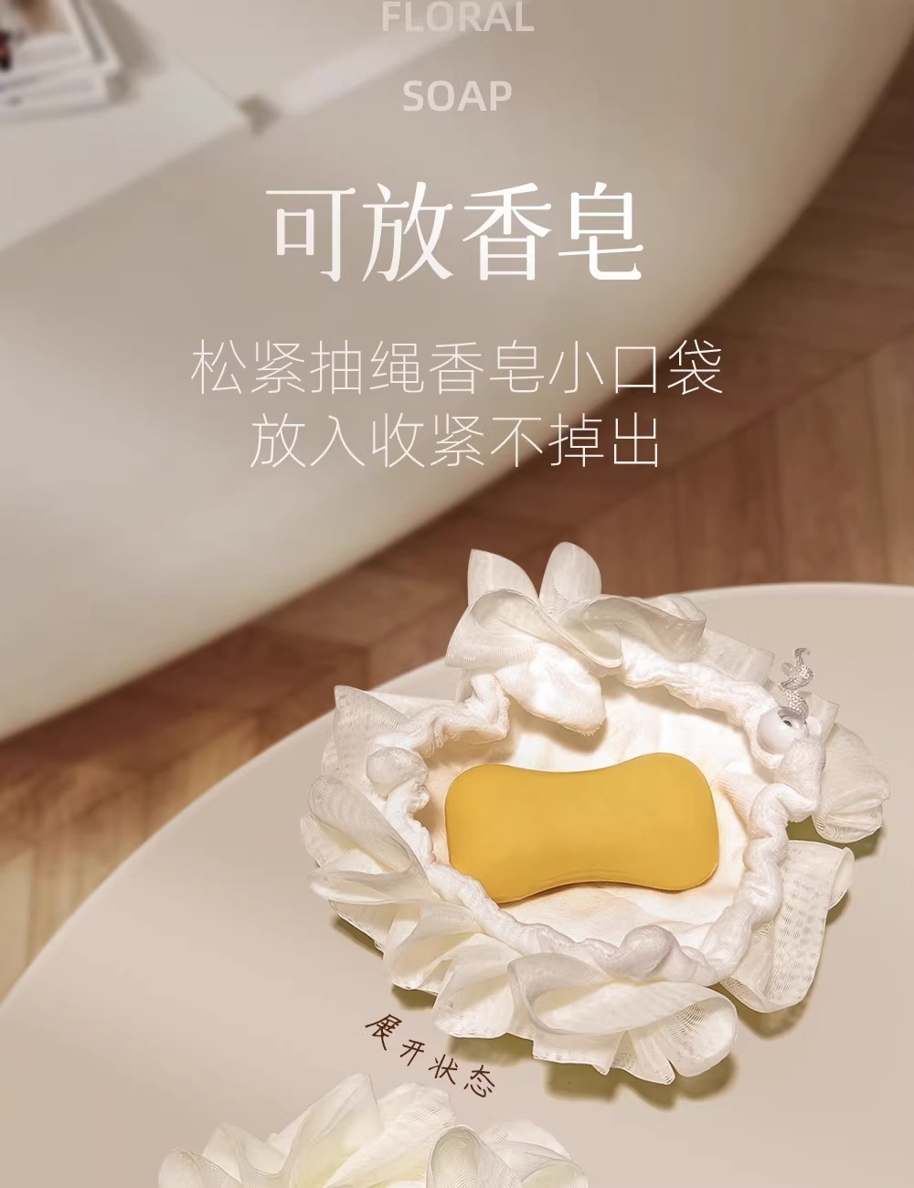 2-in-1 샤워볼은 비누로 감싸서 사용할 수 있으며, 꽃이 흩날리지 않는 샤워볼, 목욕타월, 새로운 샤워용품
