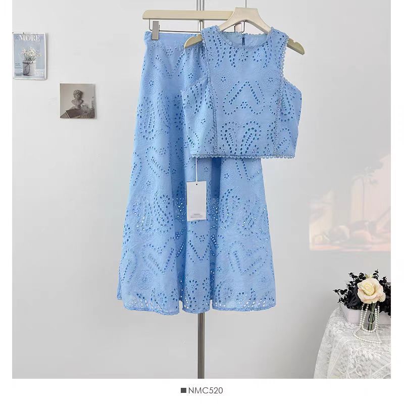 여성을위한 프랑스 복고풍 중공 크로 셰 뜨개질 디자인 정장 여름 민소매 조끼 탑 높은 허리 탄성 대형 스커트스토어 가기