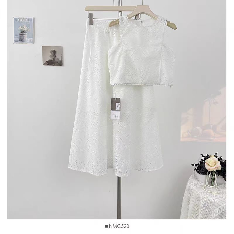 여성을위한 프랑스 복고풍 중공 크로 셰 뜨개질 디자인 정장 여름 민소매 조끼 탑 높은 허리 탄성 대형 스커트
