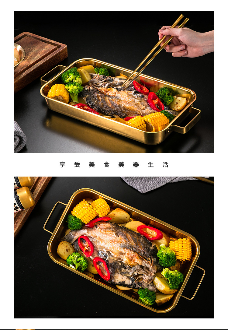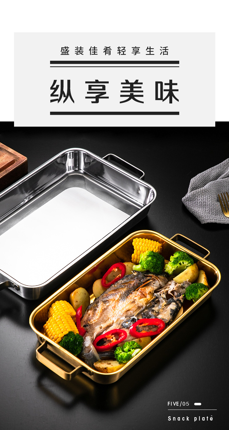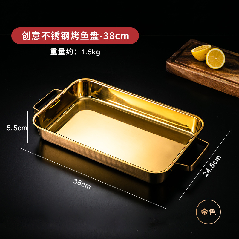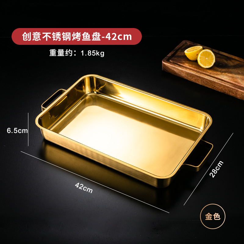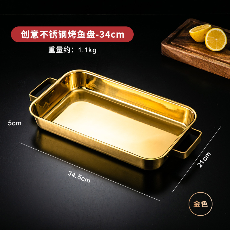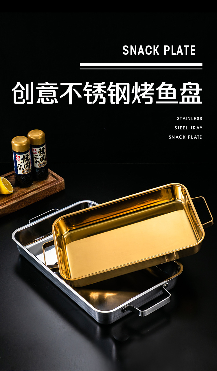 한국 스테인레스 스틸 생선 구이 접시 직사각형 양이 베이킹 팬 트레이 인덕션 오븐용 골드 플랫 플레이트스토어 가기