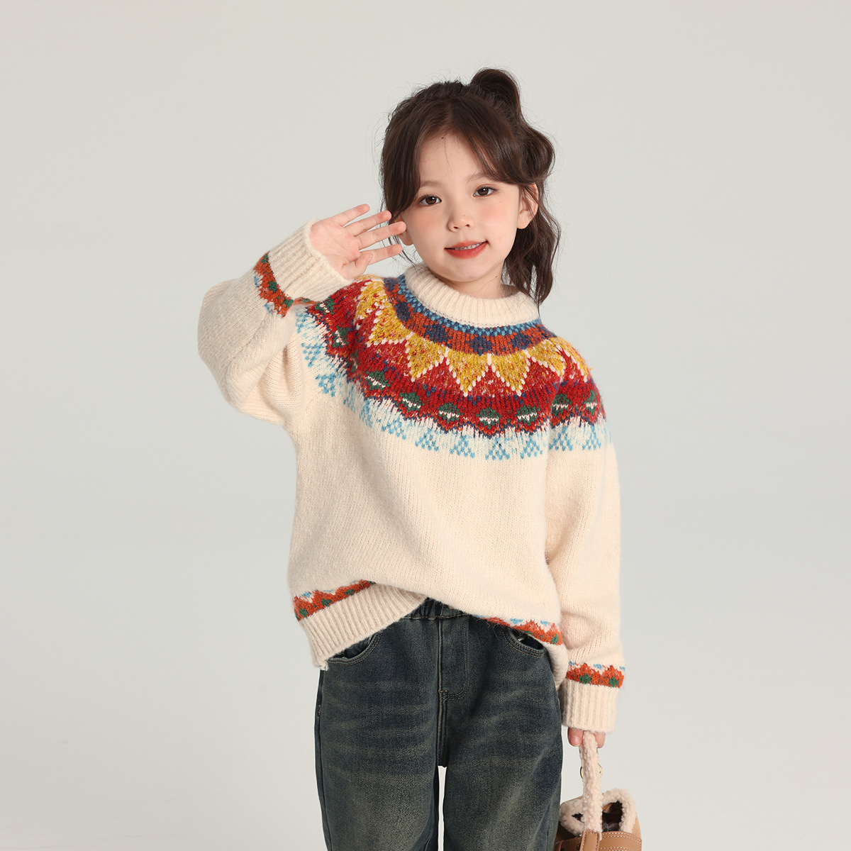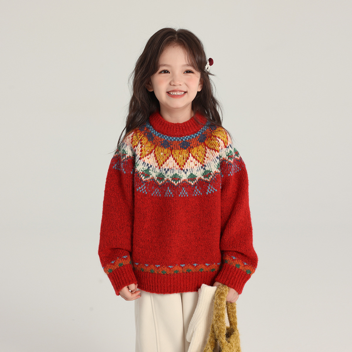 Pudding Haru 가을 겨울 아동용 스웨터 보풀 방지 원단 소녀 따뜻한 니트 두꺼운 스웨터 페어 아일 대비 색상