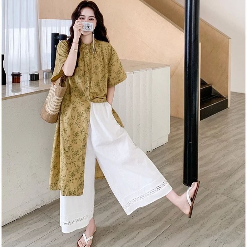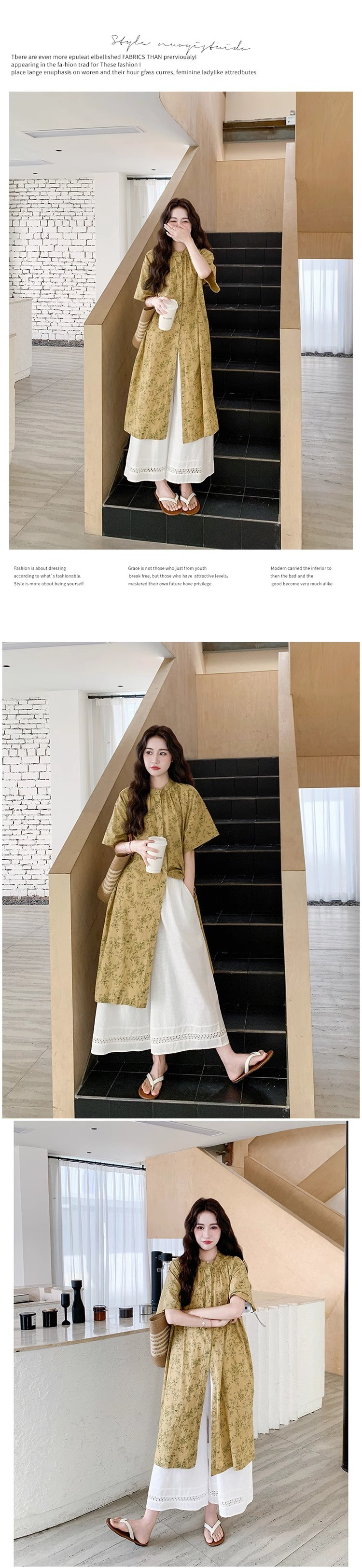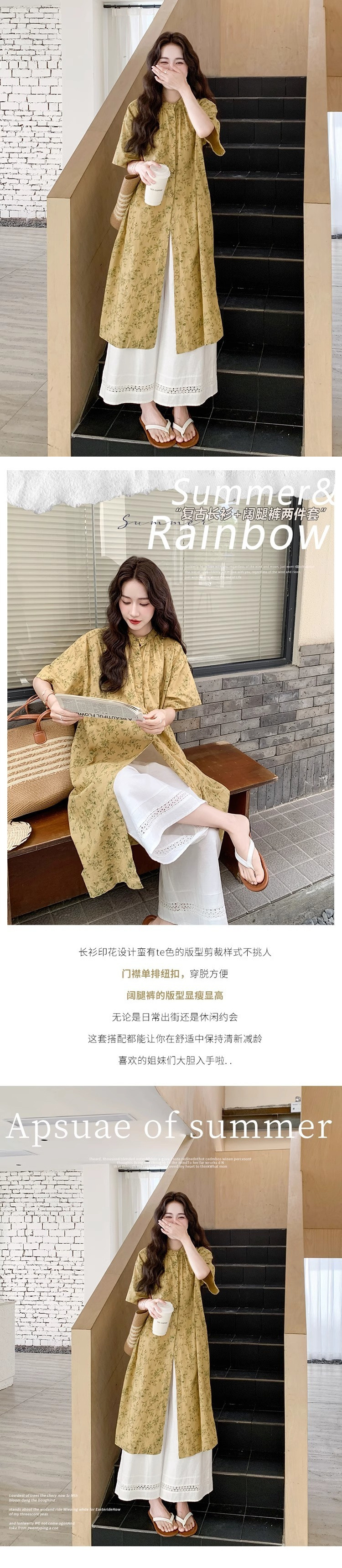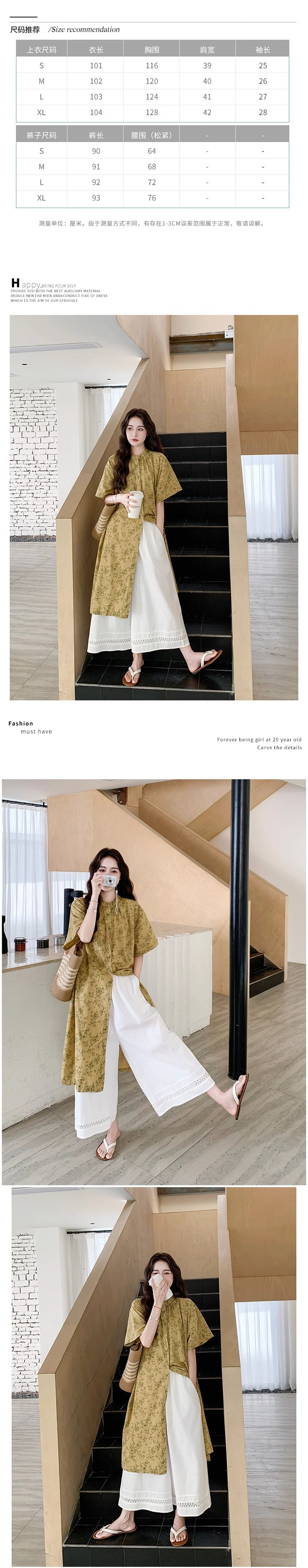 여성을위한 복고풍 새로운 중국 스타일 꽃 셔츠 드레스 정장 2025 여름 새로운 게으른 스타일 넓은 다리 바지 투피스 세트스토어 가기
