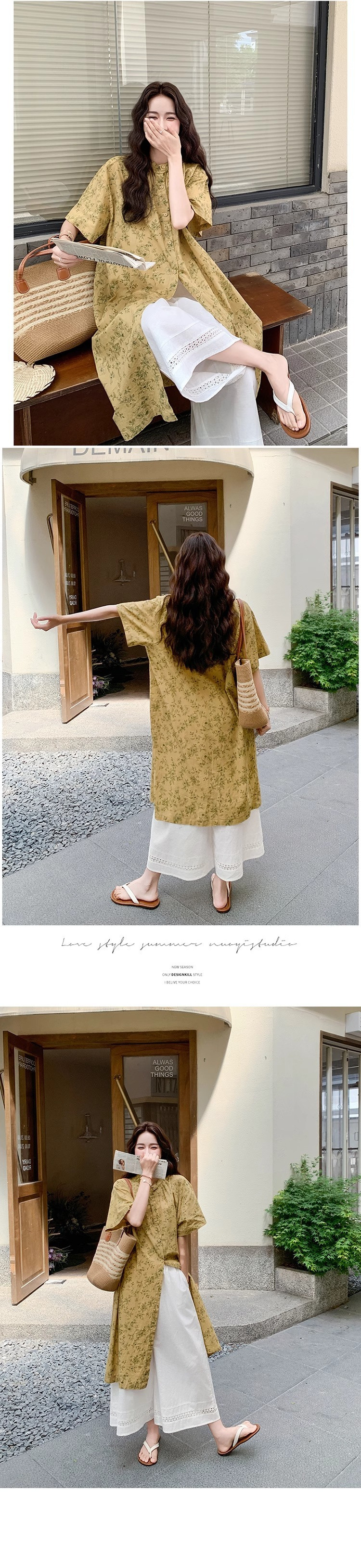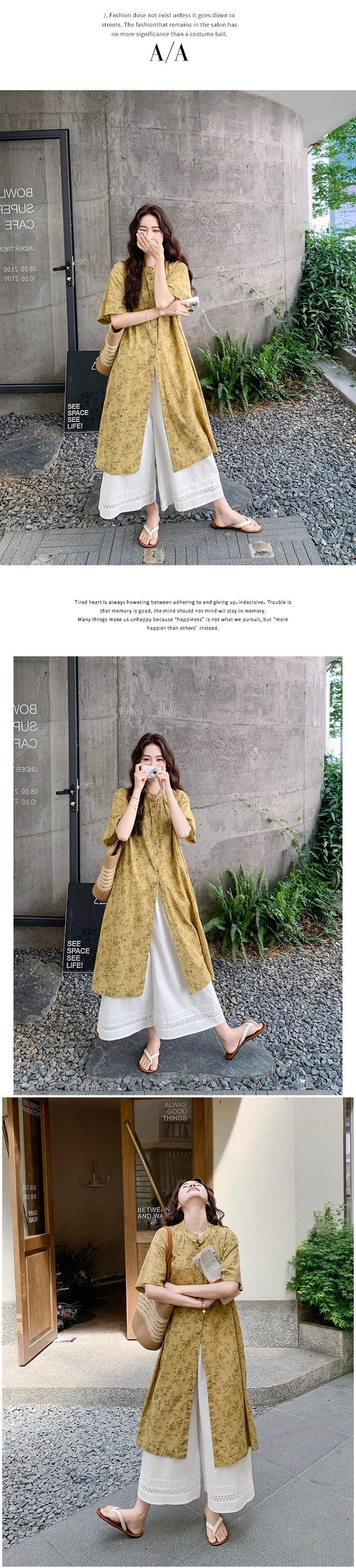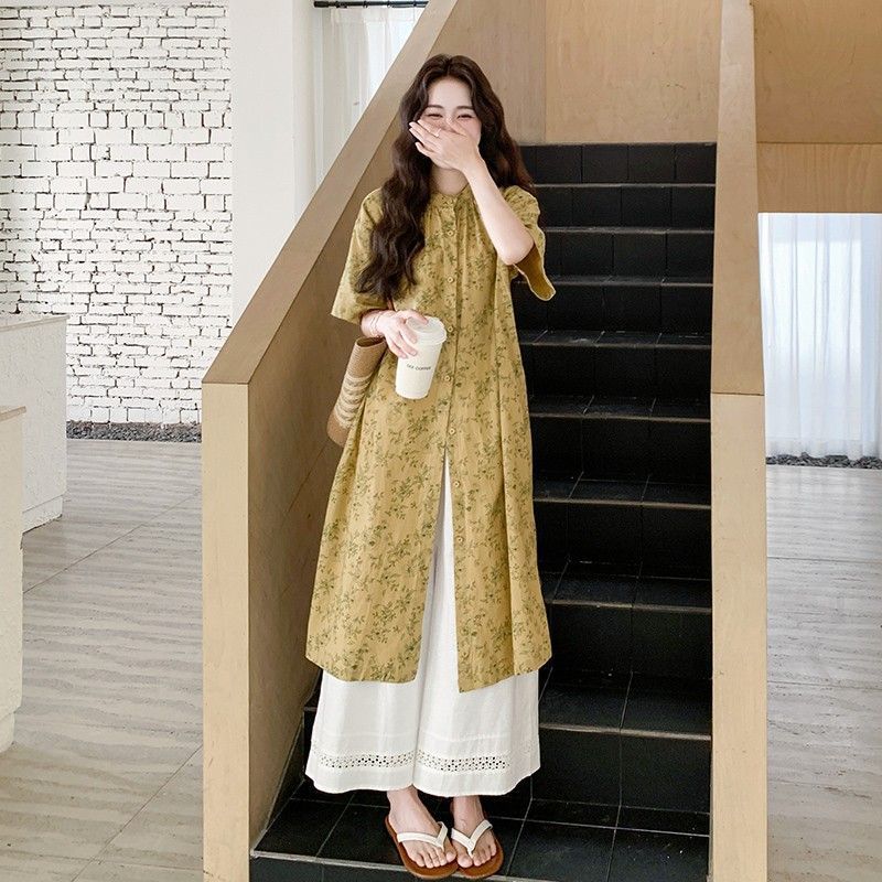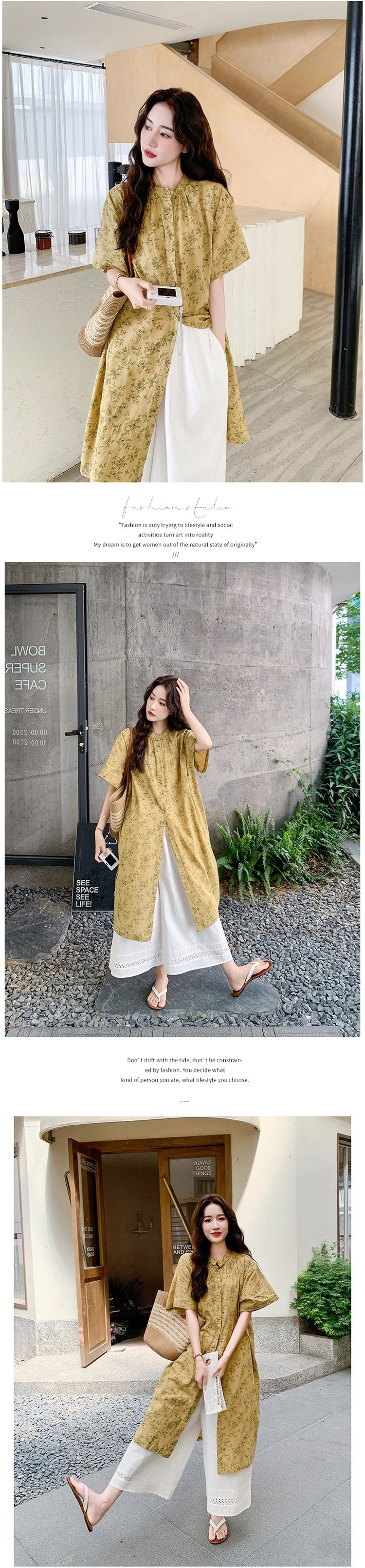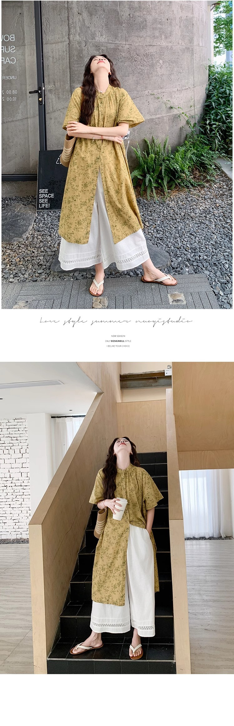 여성을위한 복고풍 새로운 중국 스타일 꽃 셔츠 드레스 정장 2025 여름 새로운 게으른 스타일 넓은 다리 바지 투피스 세트스토어 가기