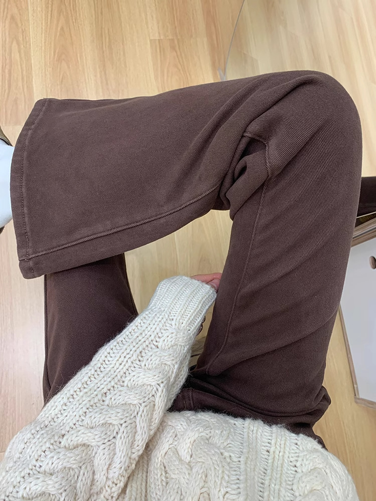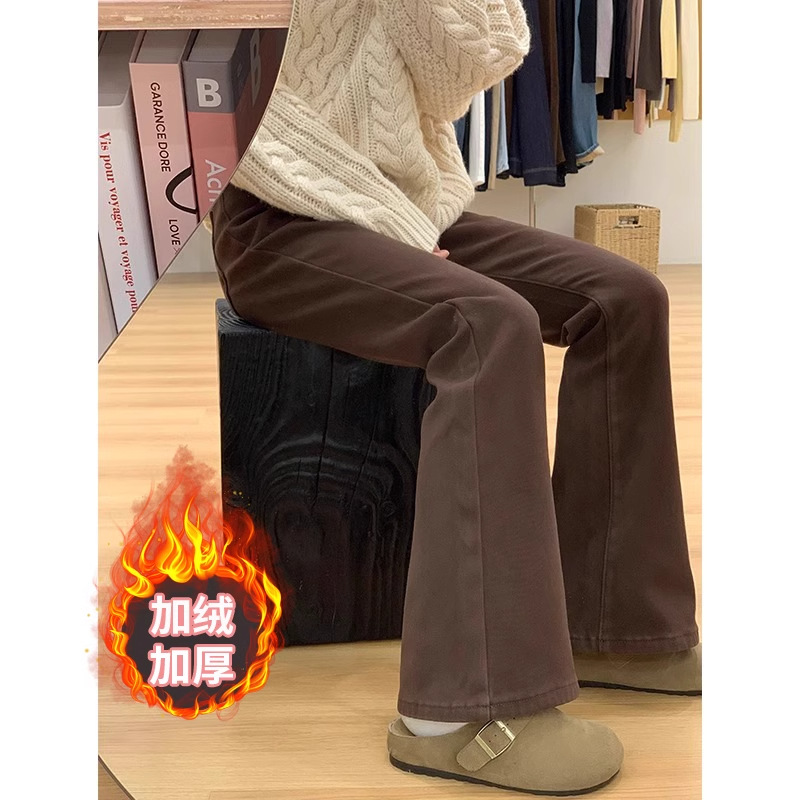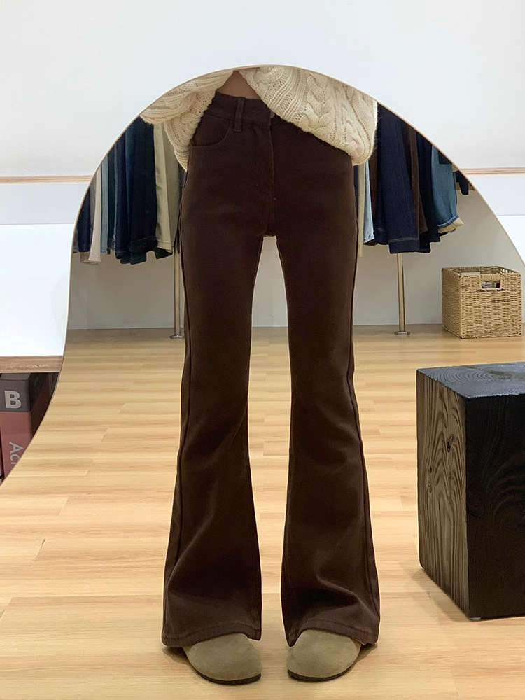 여성용 브라운 마이크로 플레어 청바지 플러스 사이즈 뚱뚱한 mm 복고풍 배꼽 모양의 하이 웨이스트 탄성 슬리밍 말굽 플레어 바지스토어 가기