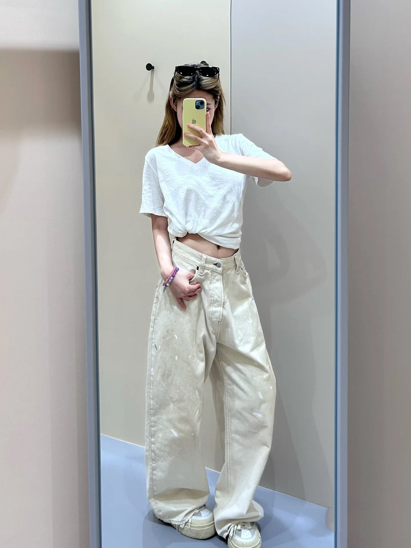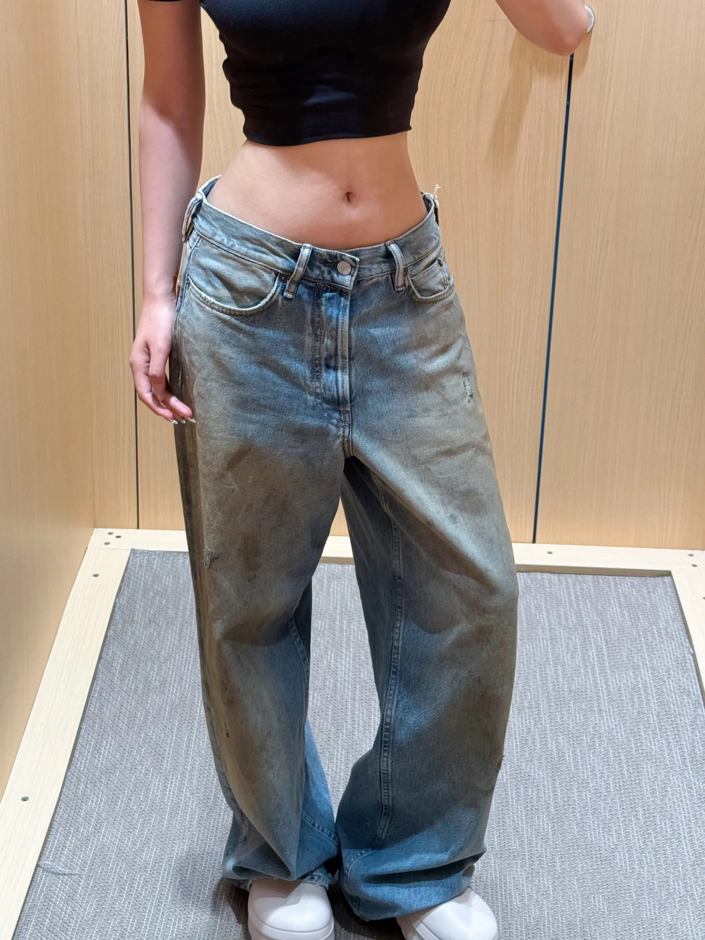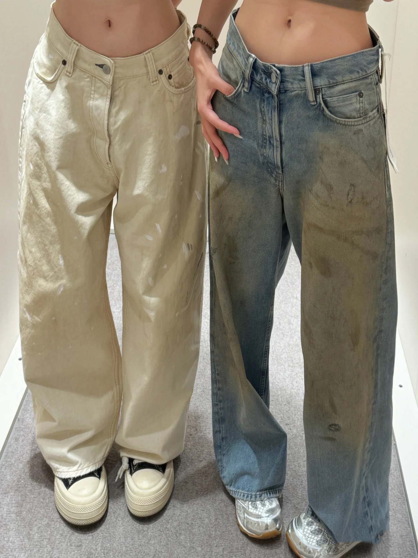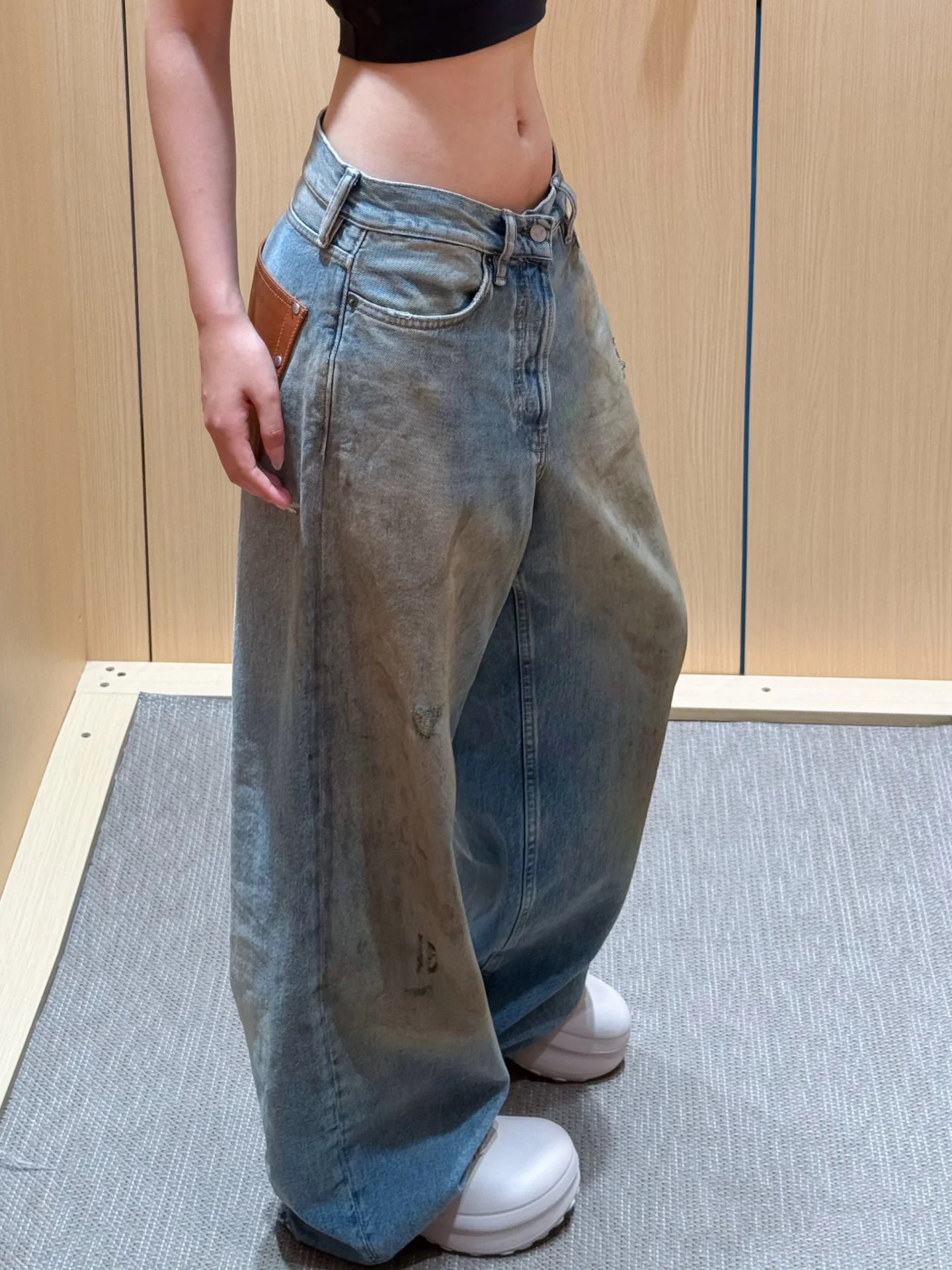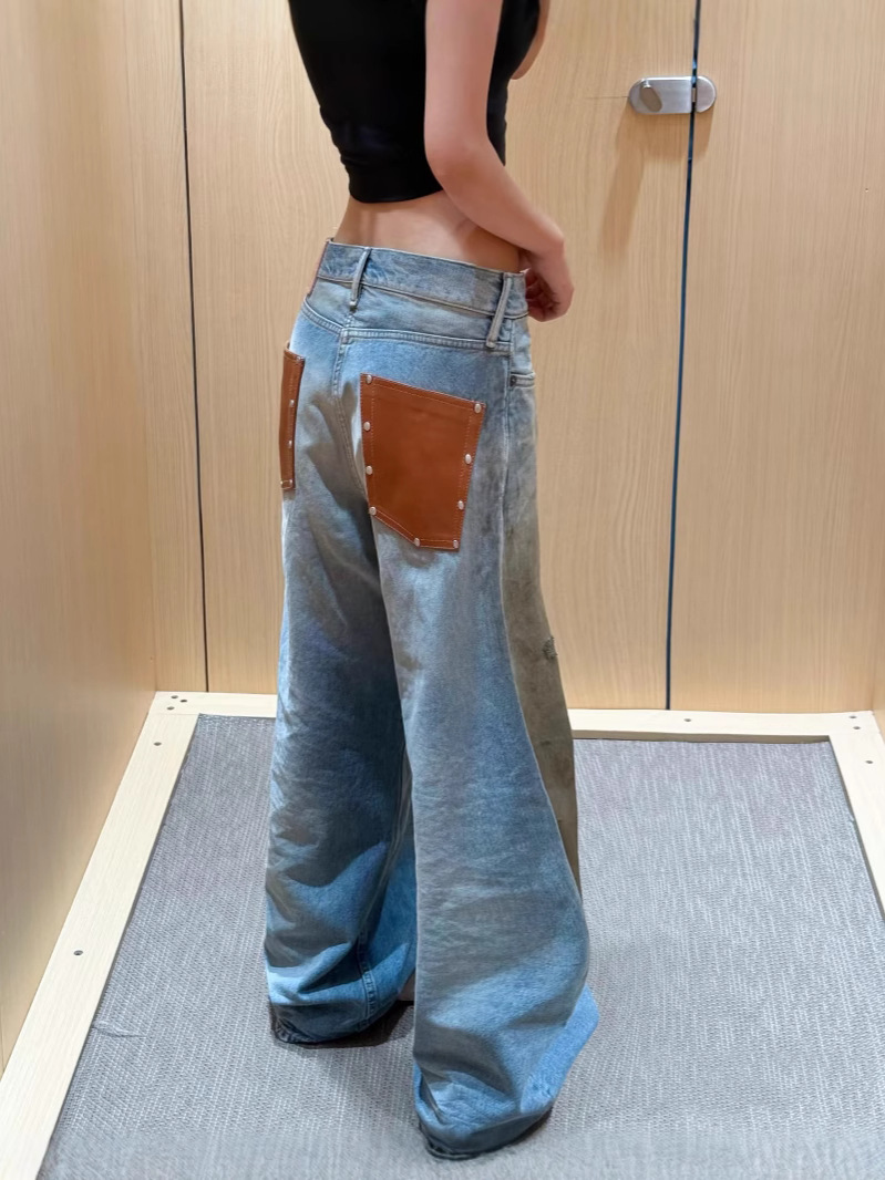 Nanyou 25 뉴 스트리트 레트로 디스트레스드 하이웨이스트 가죽 스플라이싱 스터드 주름진 루즈 와이드 레그 더티 청바지 여성용스토어 가기