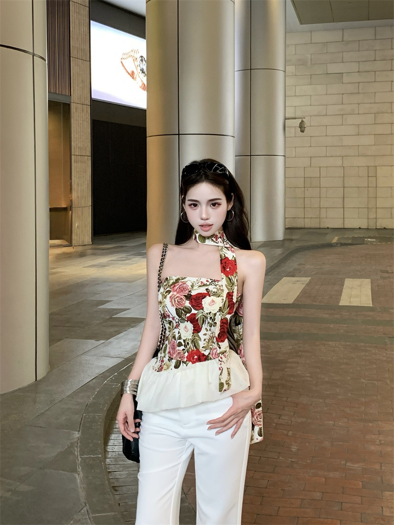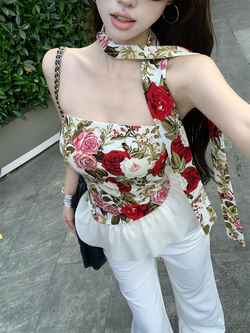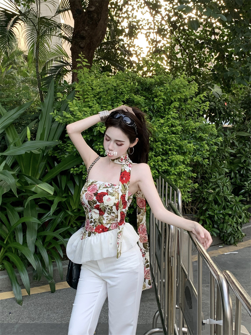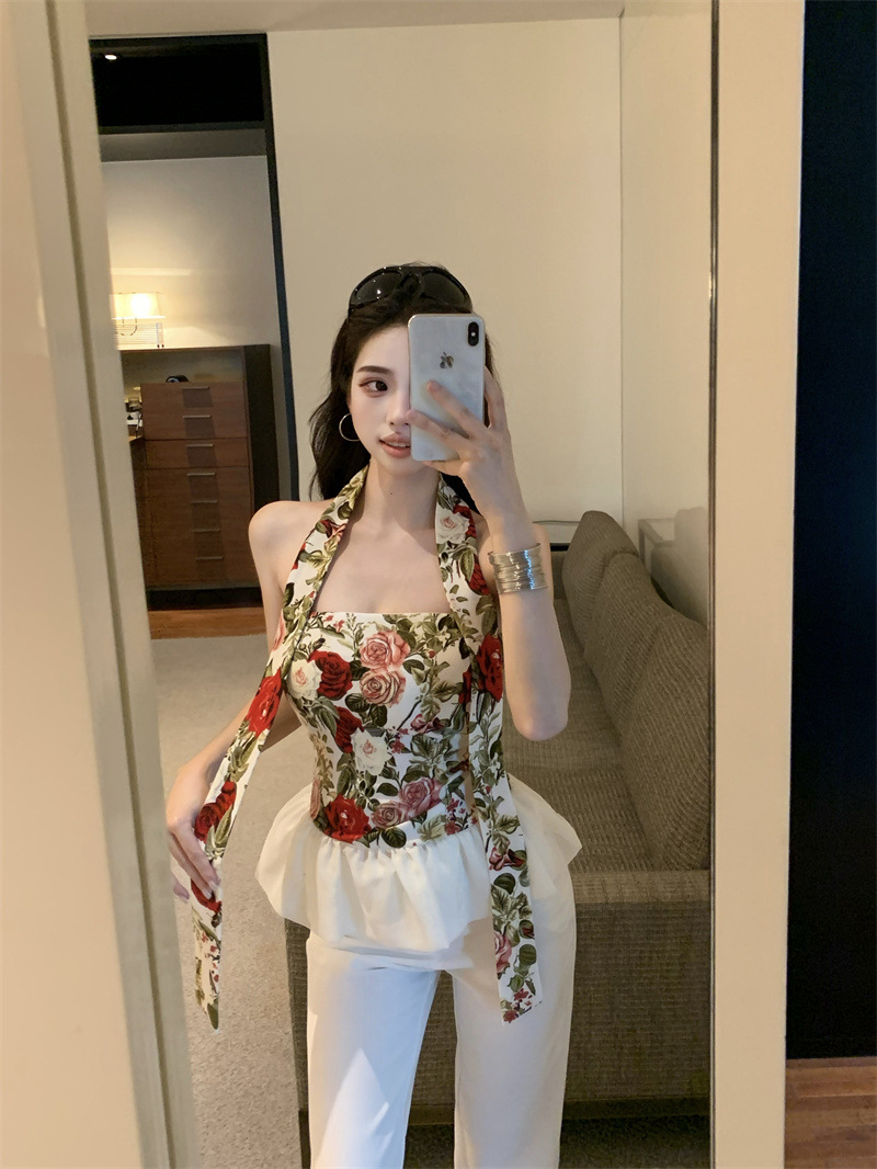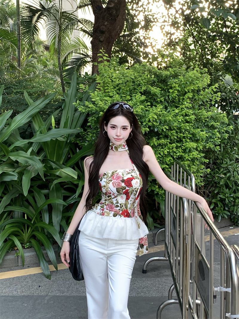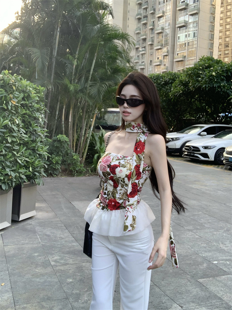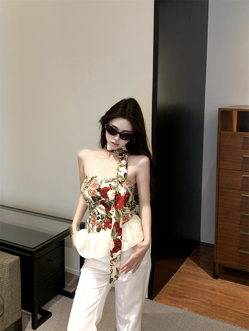 여름용 러플 프린트 리본 백리스 튜브탑 여성용 슬림핏 민소매 가슴 감싸는 퓨어 러브 쇼트 탑 아우터스토어 가기