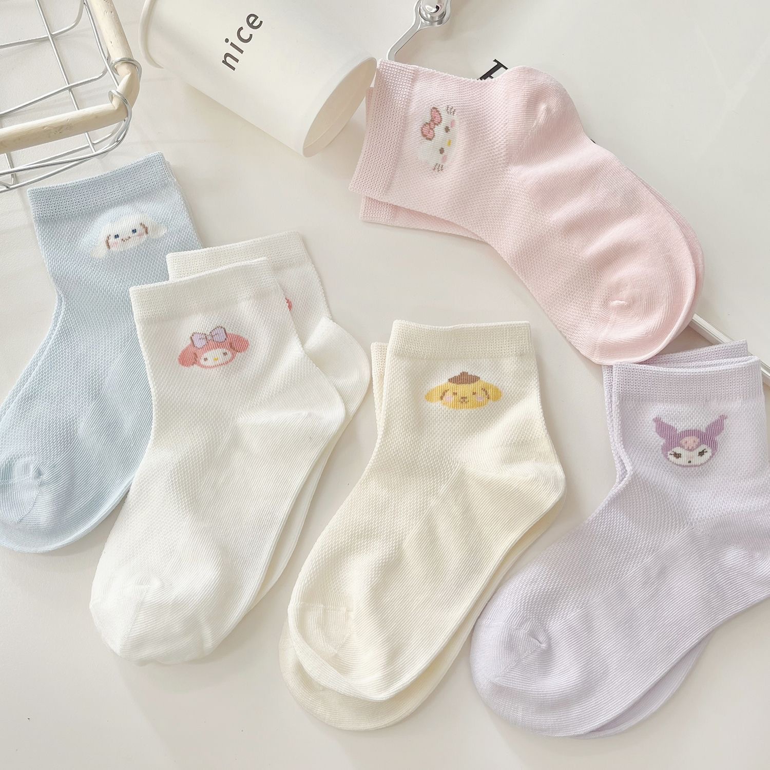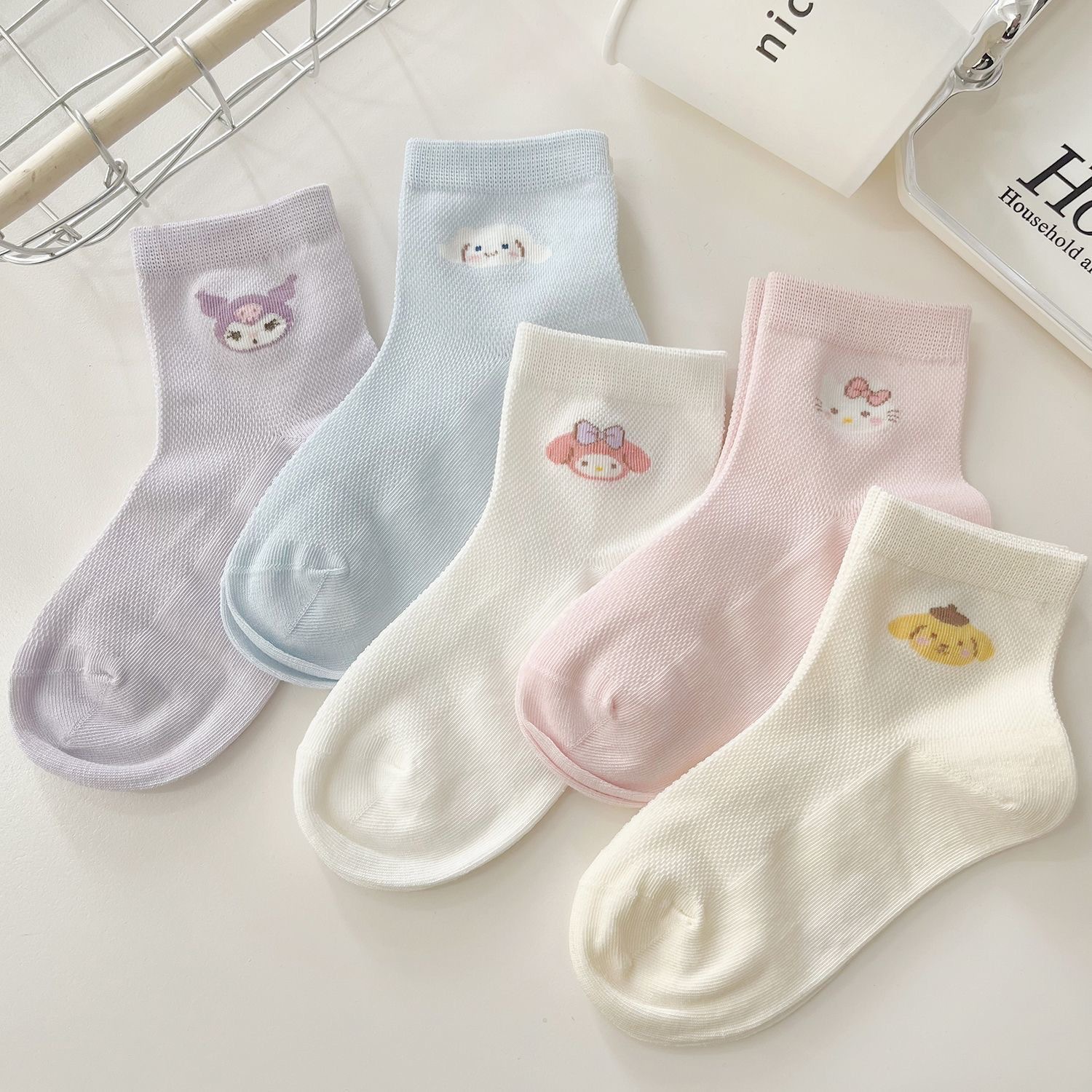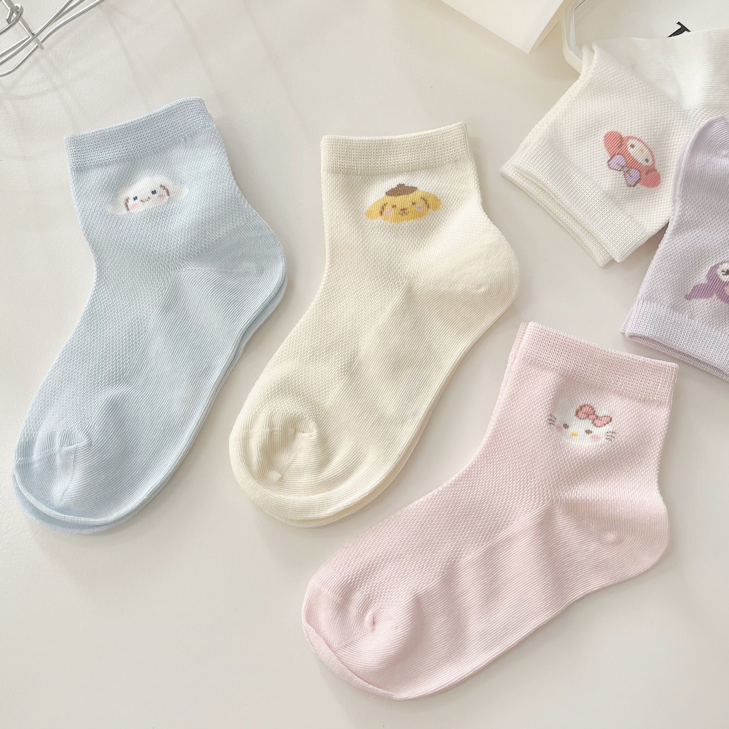 Sanrio 어린이 양말 만화 패턴 귀여운 소녀 양말 여름 메쉬 통기성 땀 흡수 피부 친화적 인 아기 양말
