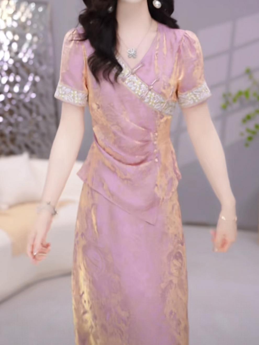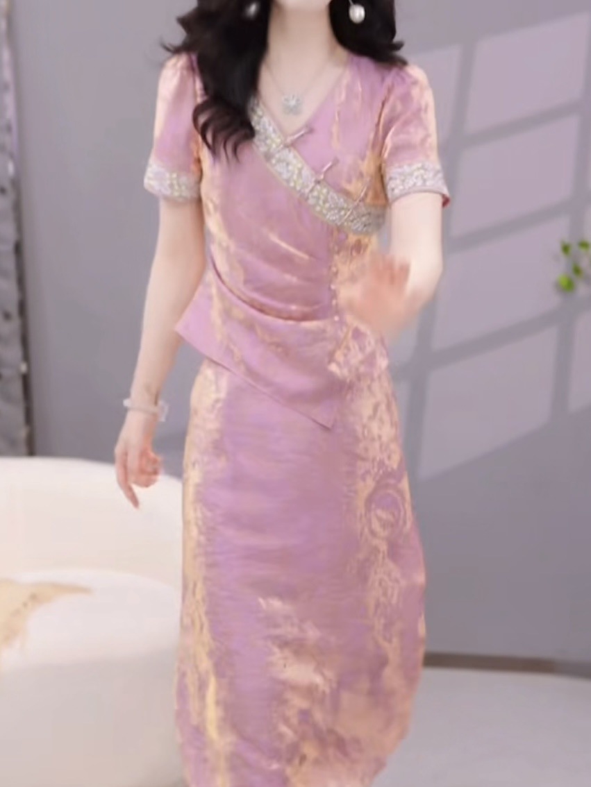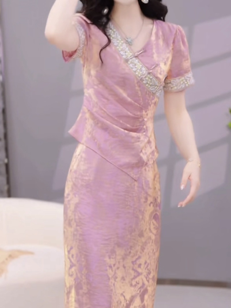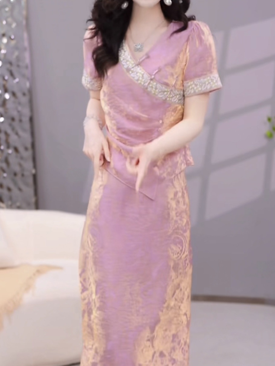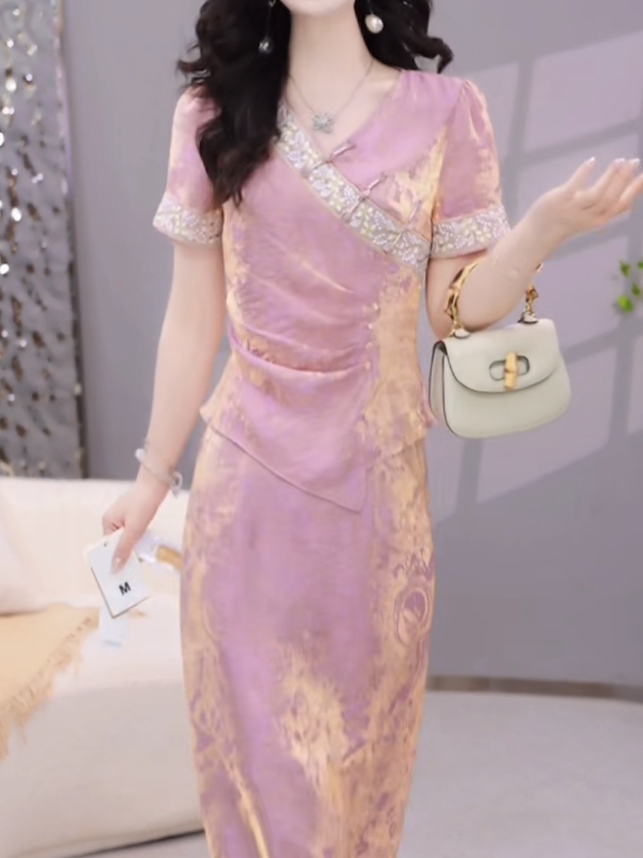 여성용 중국식 아이스 실크 드레스 2피스 세트, 배를 덮는 2025년 여름 신작 꽃무늬 셔츠, 살을 덮고 슬림해 보이는 슈트 스커트스토어 가기
