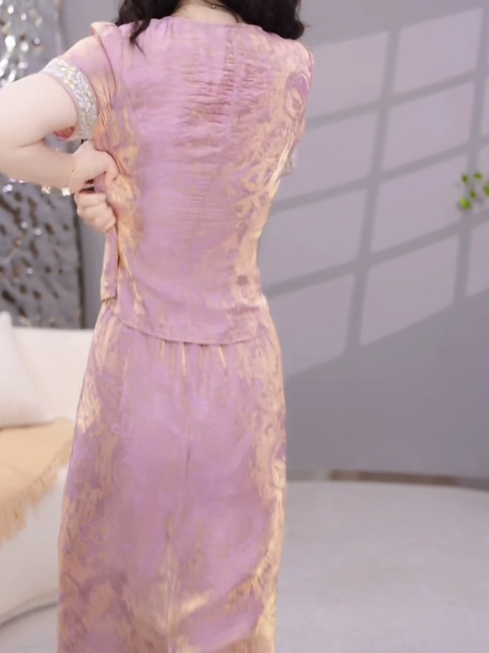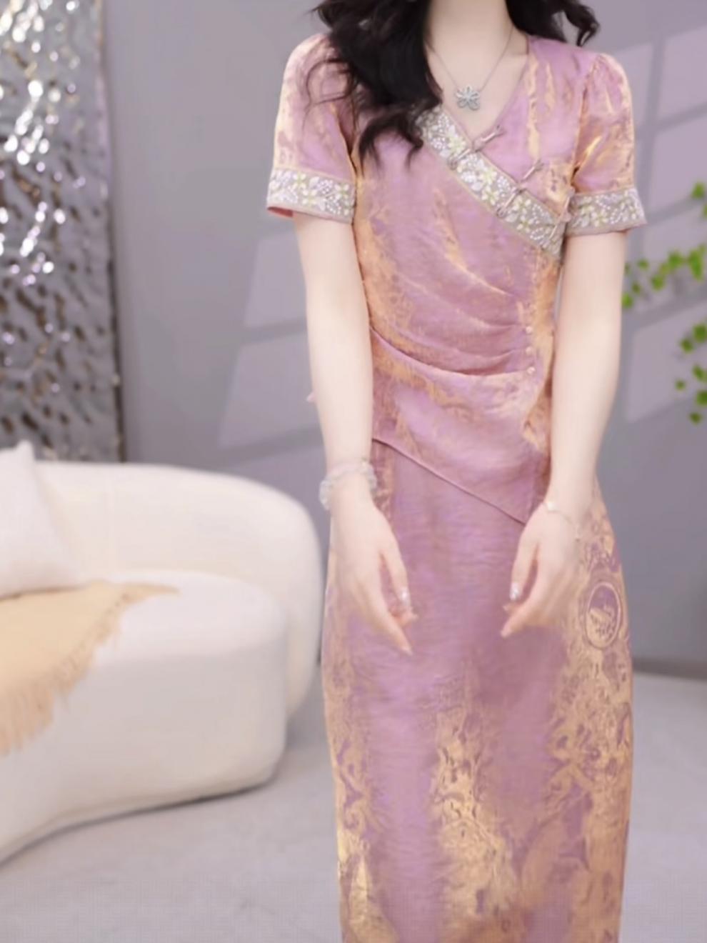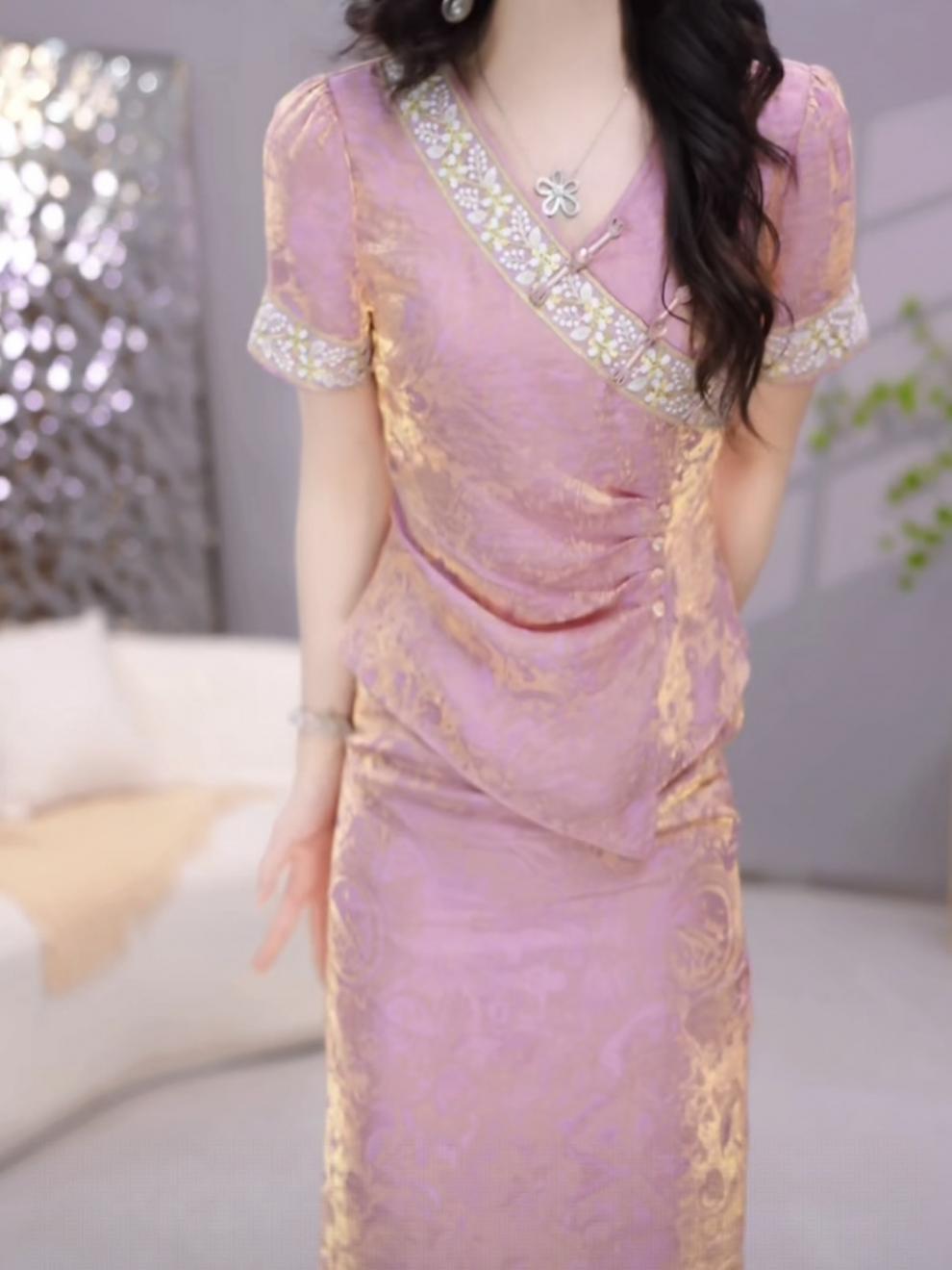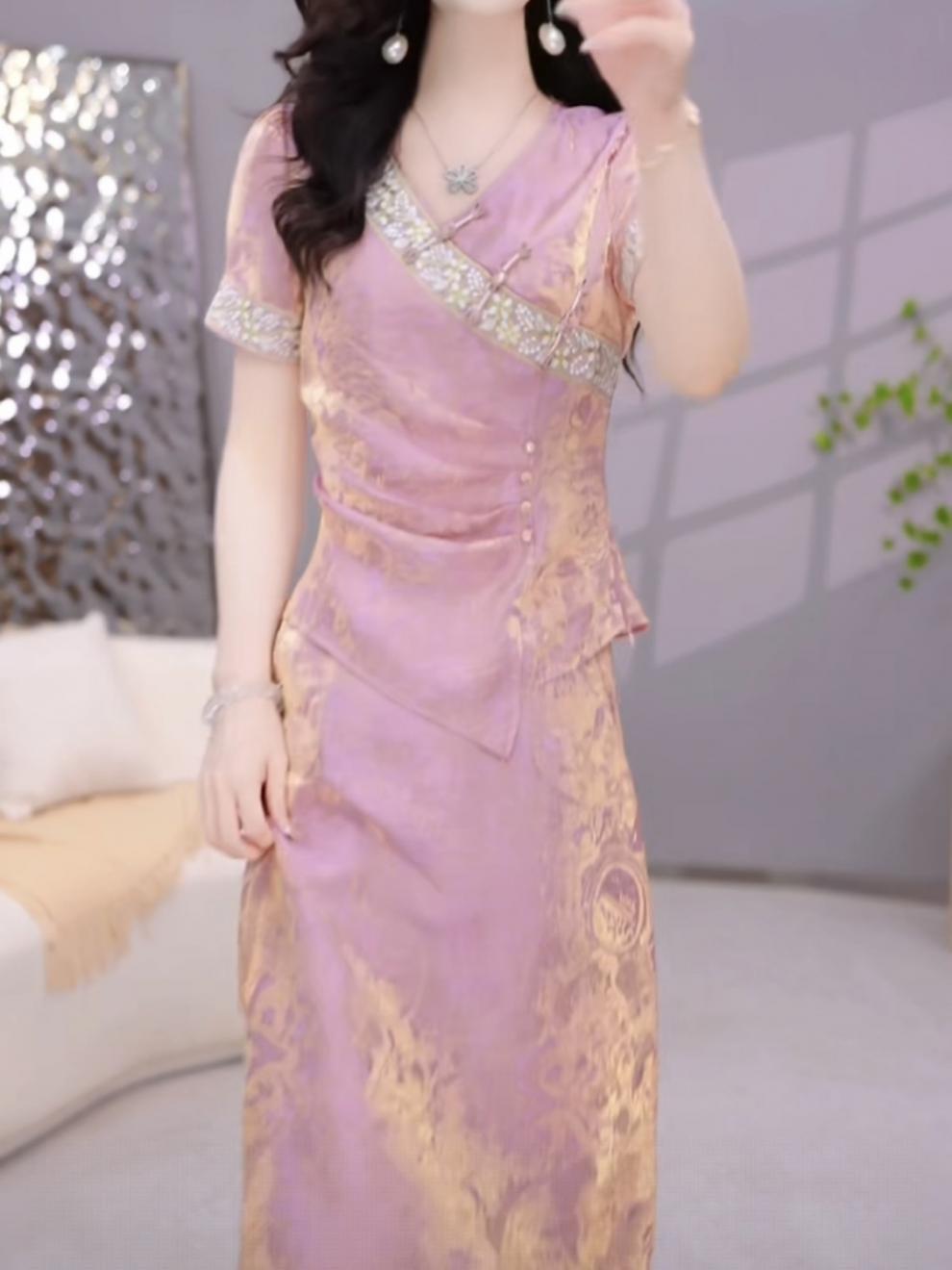 여성용 중국식 아이스 실크 드레스 2피스 세트, 배를 덮는 2025년 여름 신작 꽃무늬 셔츠, 살을 덮고 슬림해 보이는 슈트 스커트스토어 가기