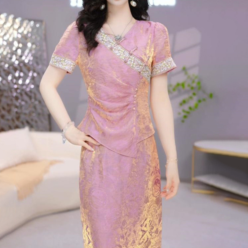 여성용 중국식 아이스 실크 드레스 2피스 세트, 배를 덮는 2025년 여름 신작 꽃무늬 셔츠, 살을 덮고 슬림해 보이는 슈트 스커트