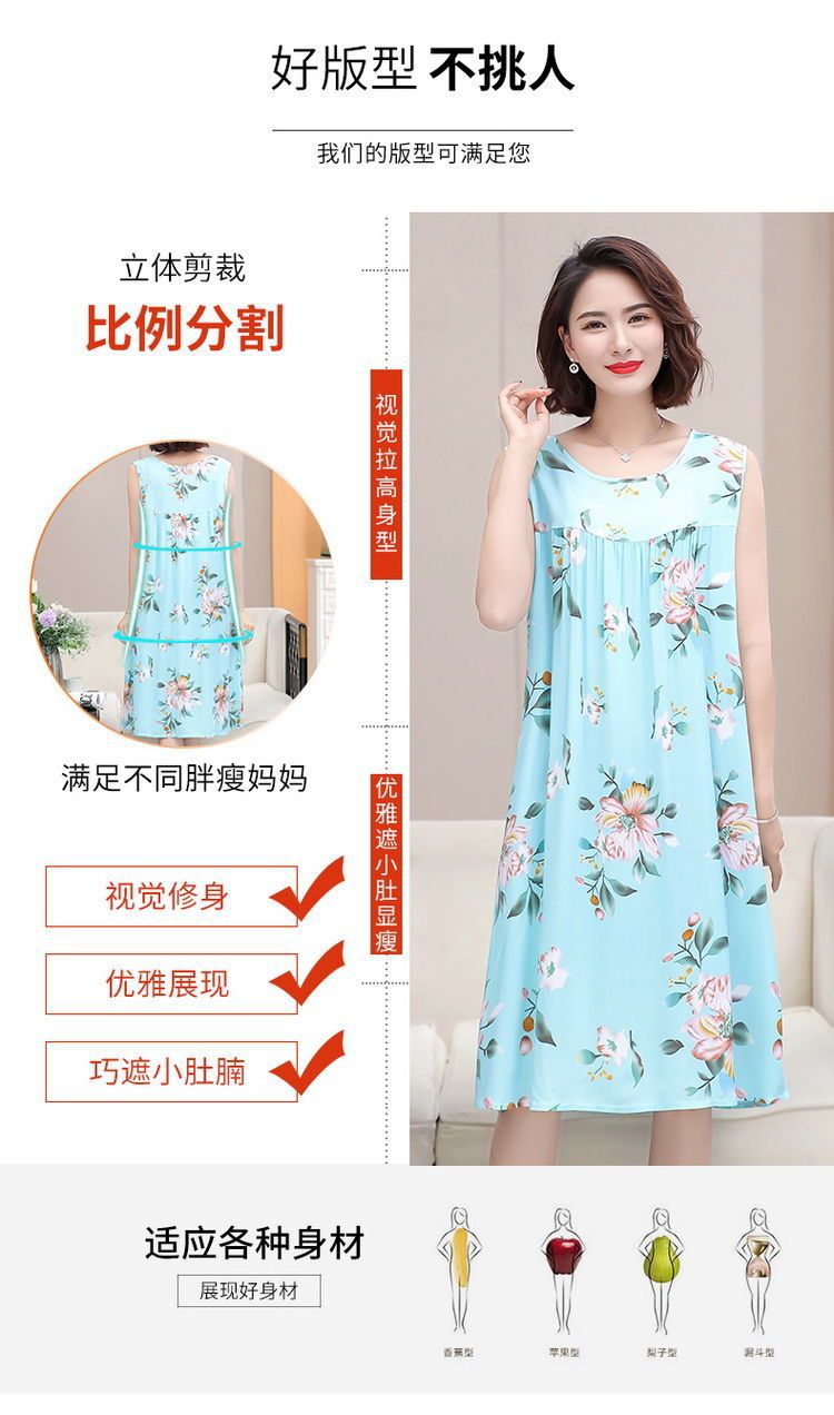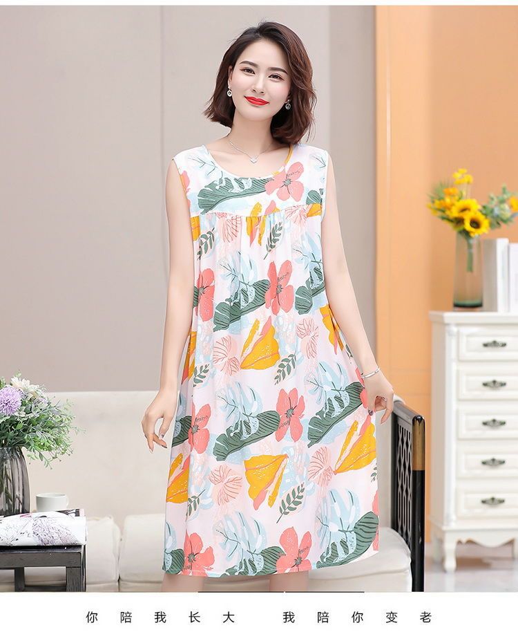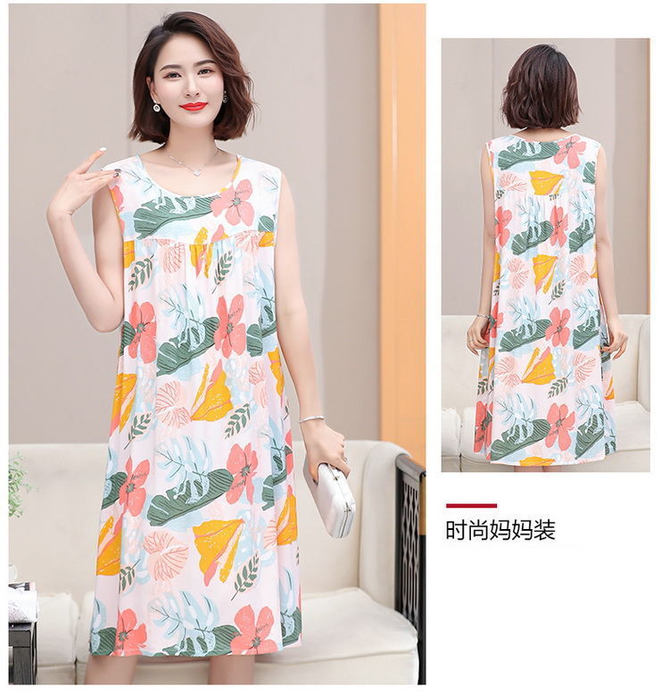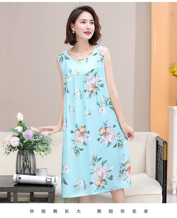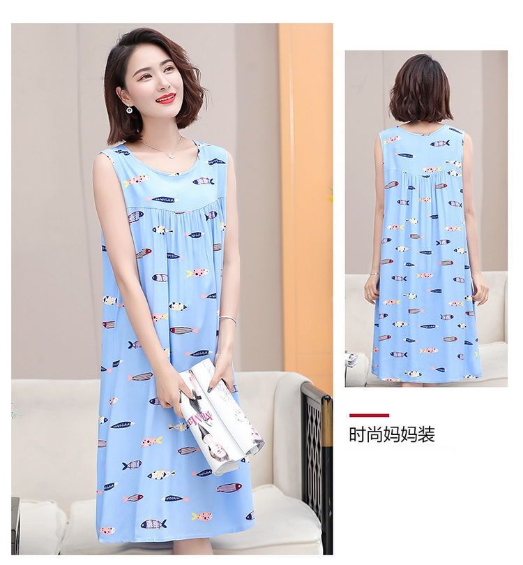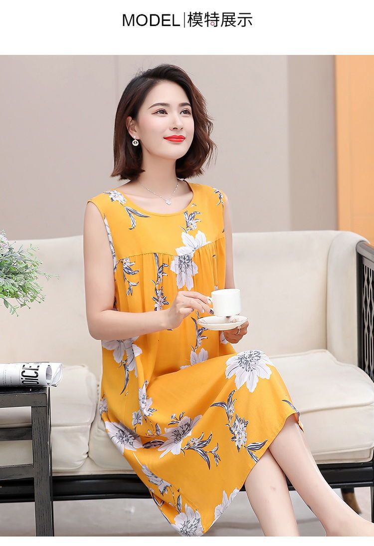 여성을위한 면 실크 잠옷 잠옷 여름 느슨한 대형 중간 길이 스커트 인공 면화 홈웨어 민소매 드레스스토어 가기