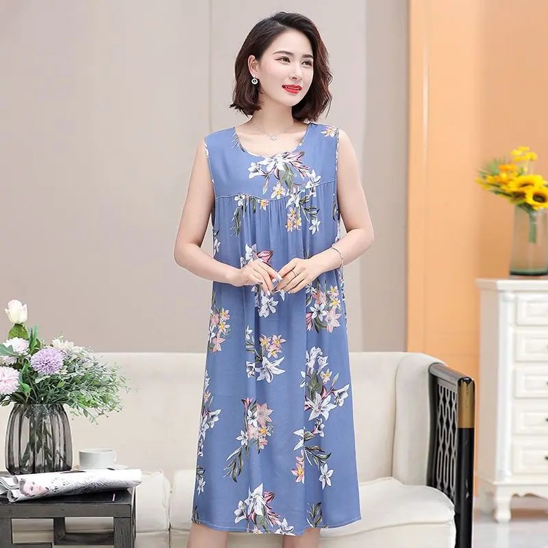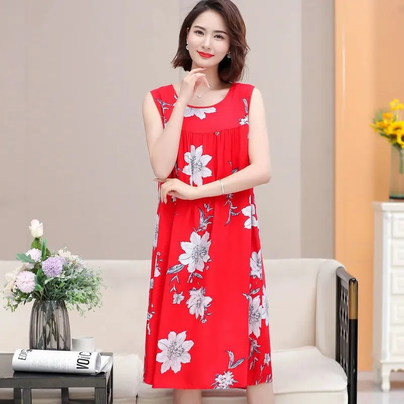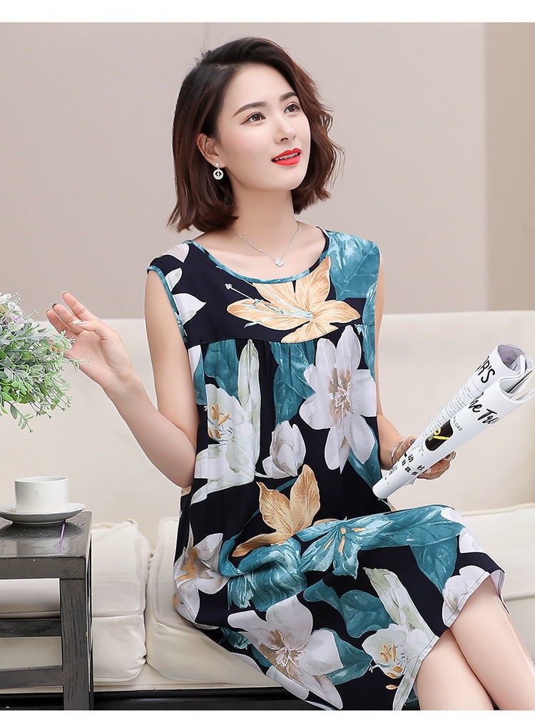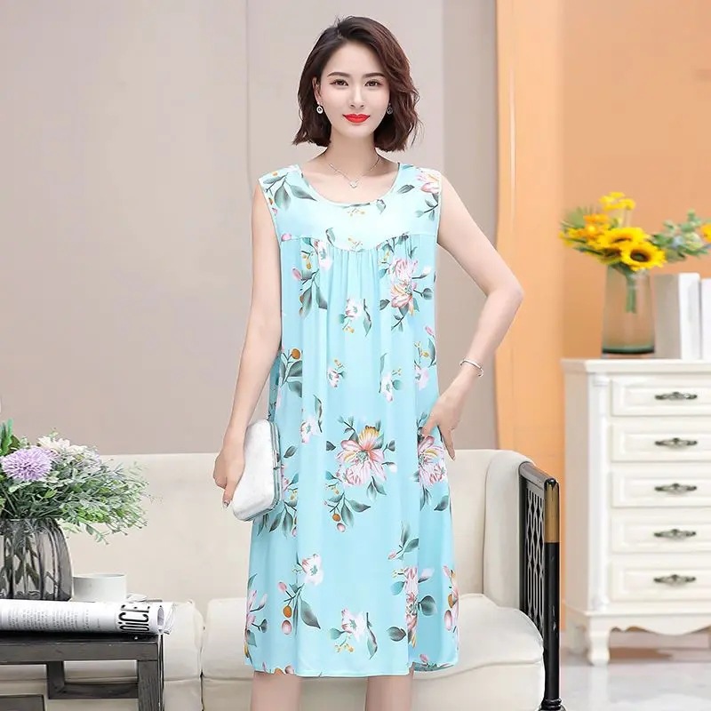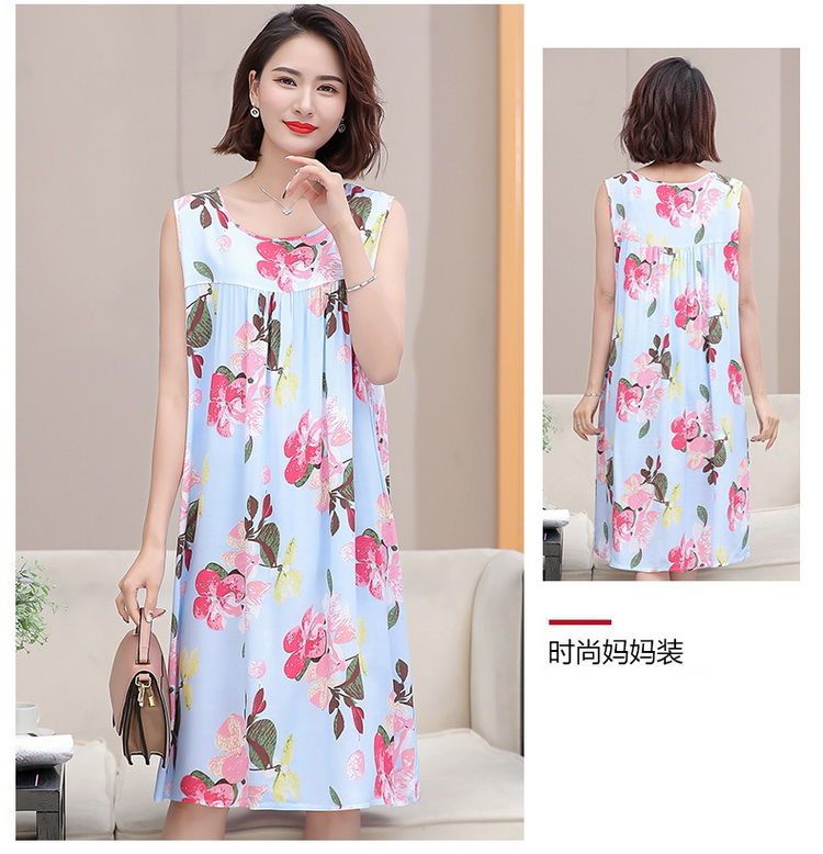 여성을위한 면 실크 잠옷 잠옷 여름 느슨한 대형 중간 길이 스커트 인공 면화 홈웨어 민소매 드레스