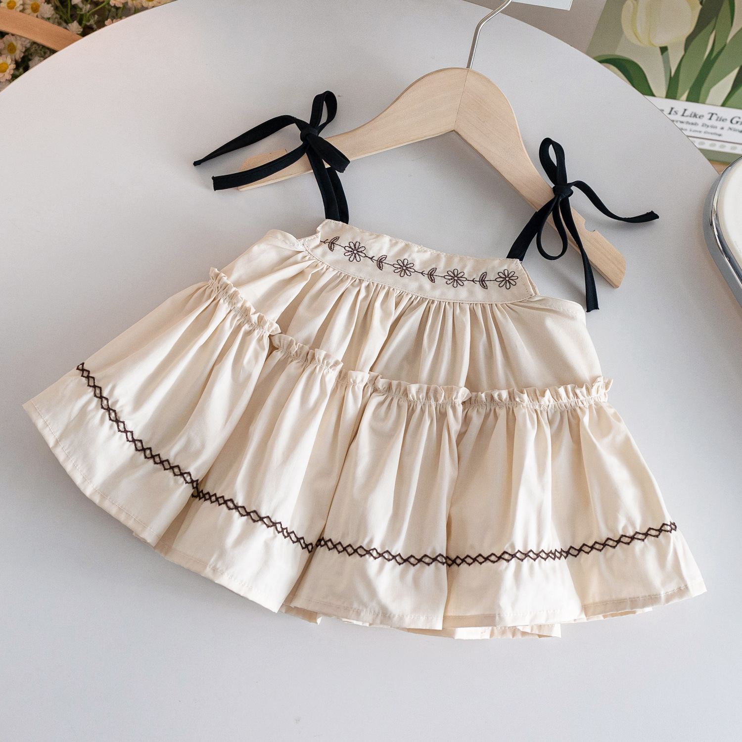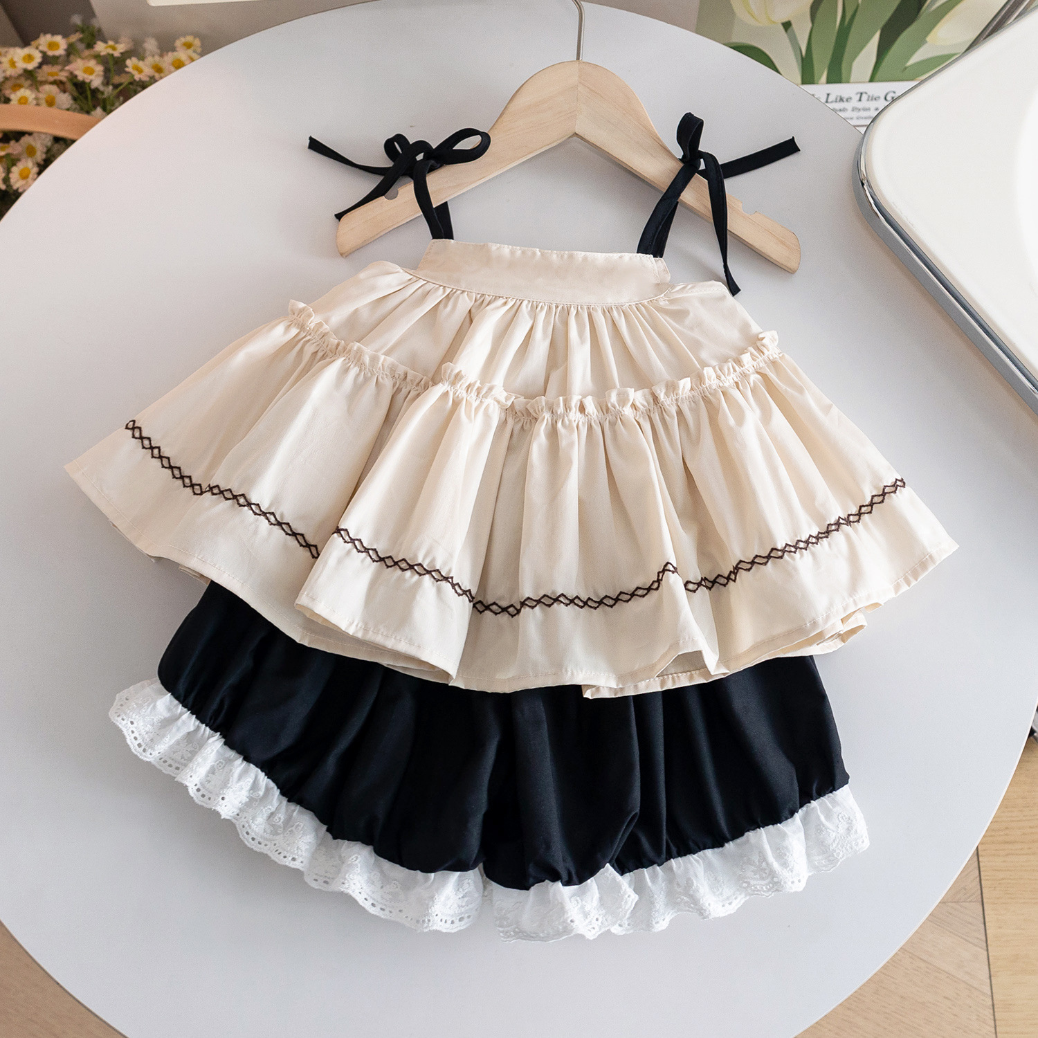 2025 여아 여름 정장, 패셔너블하고 인기 있는 여아 자수 서스펜더 탑 레이스 반바지 투피스 세트