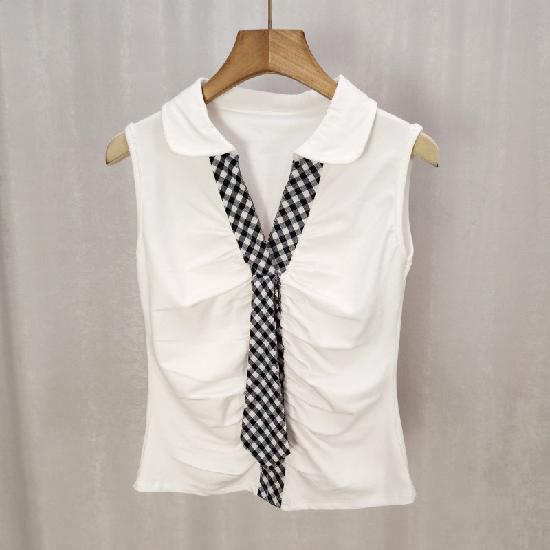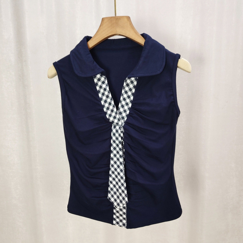 여름 한국 스타일 스위트 컬리지 스타일 폴로 민소매 조끼 여성 슬림 플리츠 디자인 타이 틈새 짧은 탑