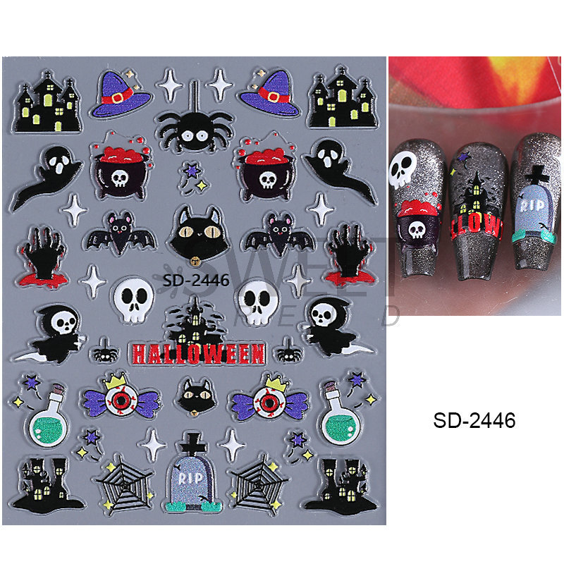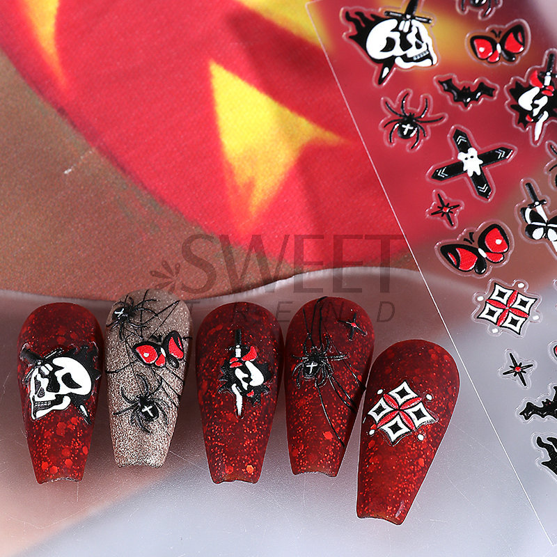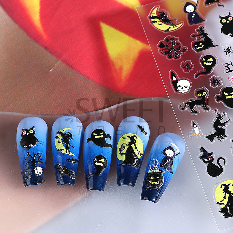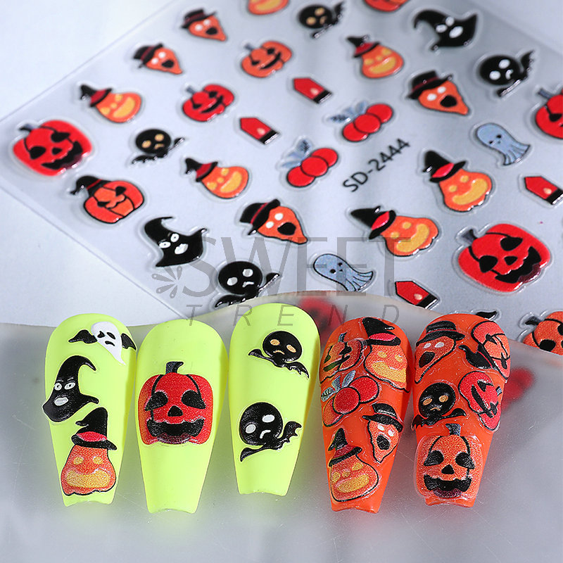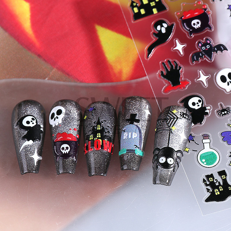 새로운 할로윈 양각 네일 아트 스티커 3D 만화 해골 호박 유령 얼굴 귀여운 네일 데칼 크로스보더
