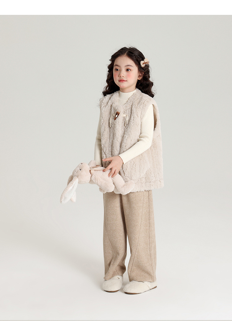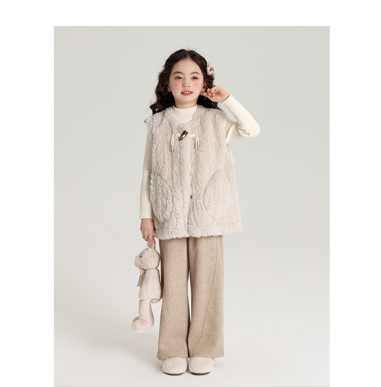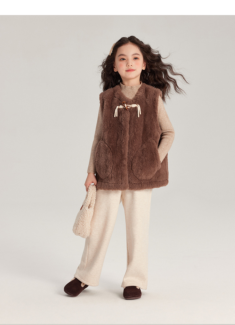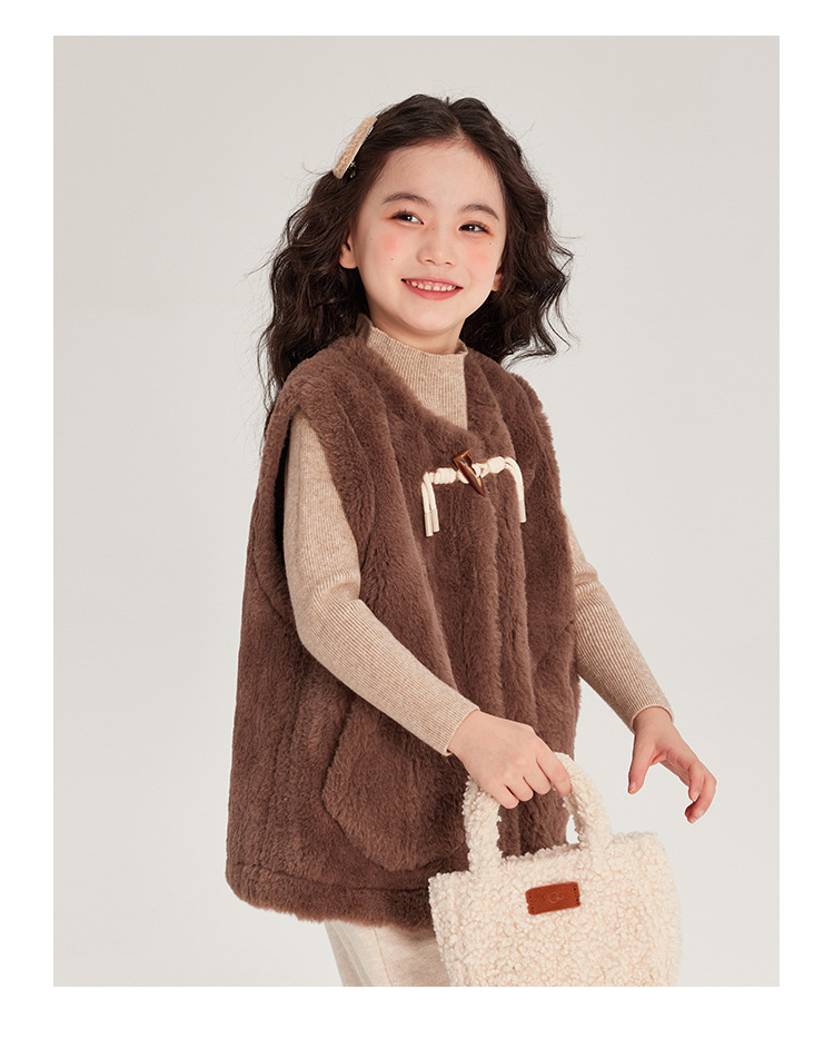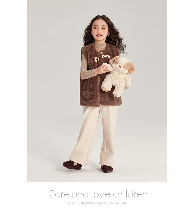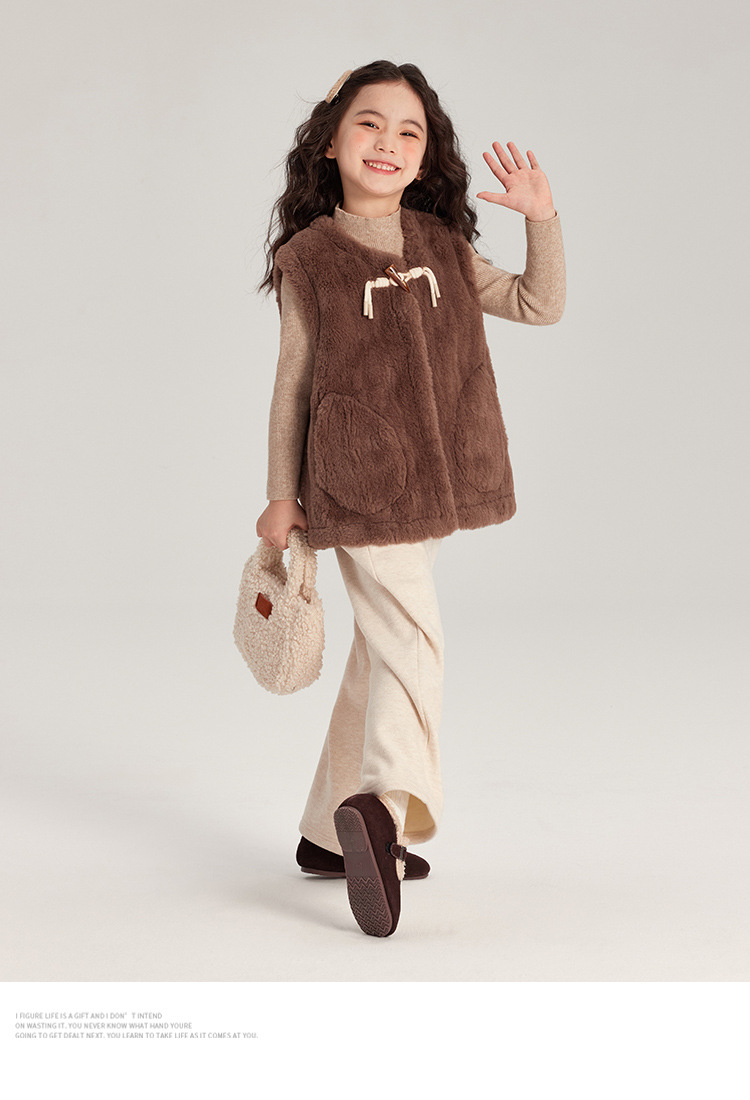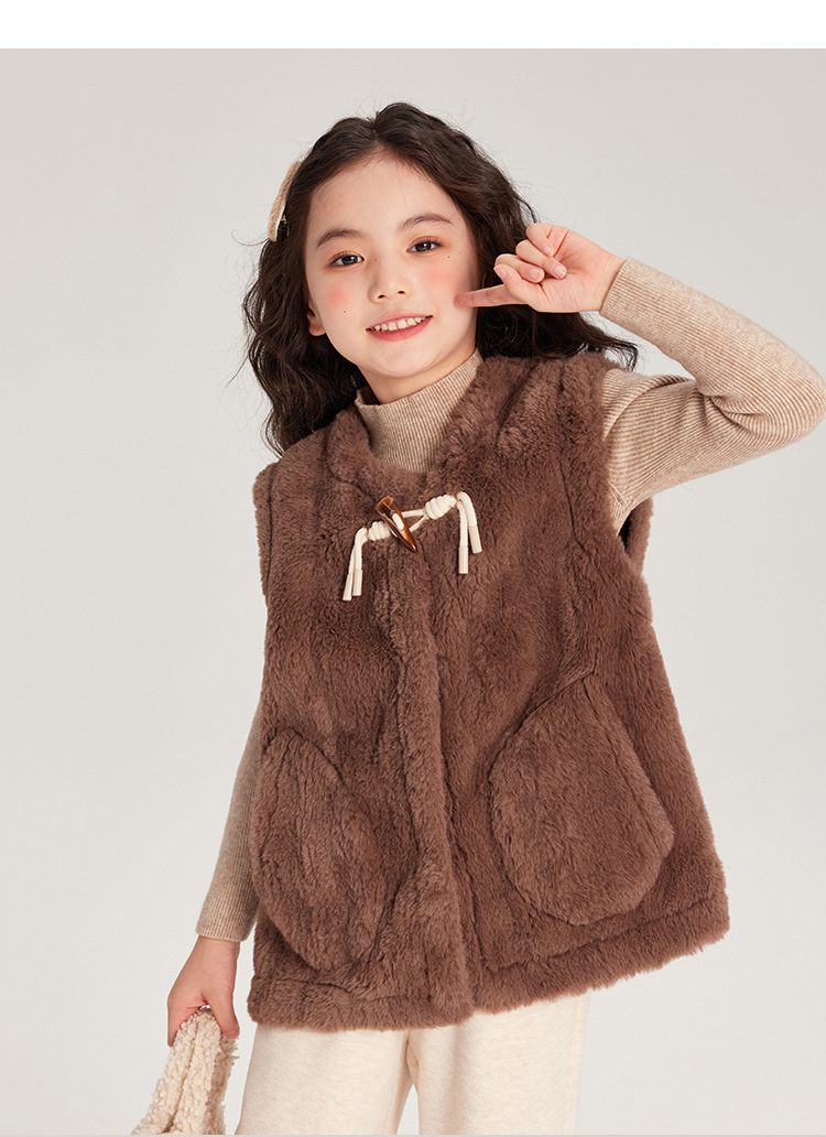 Pudding Haru 가을 겨울 신작 어린이 플러시 조끼, 피부 친화적이고 편안한 양각 버튼 소녀 조끼, 양쪽에 큰 주머니