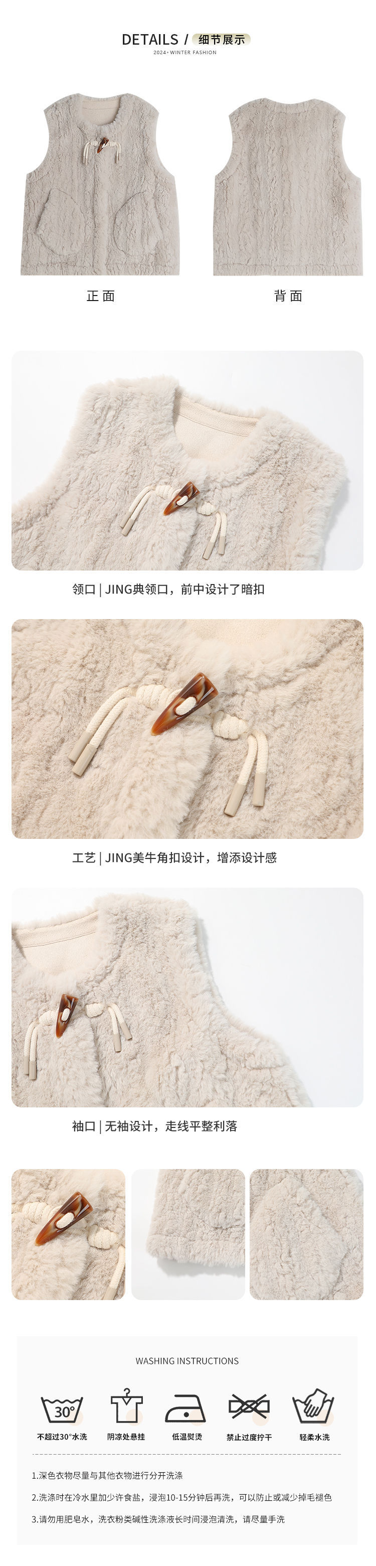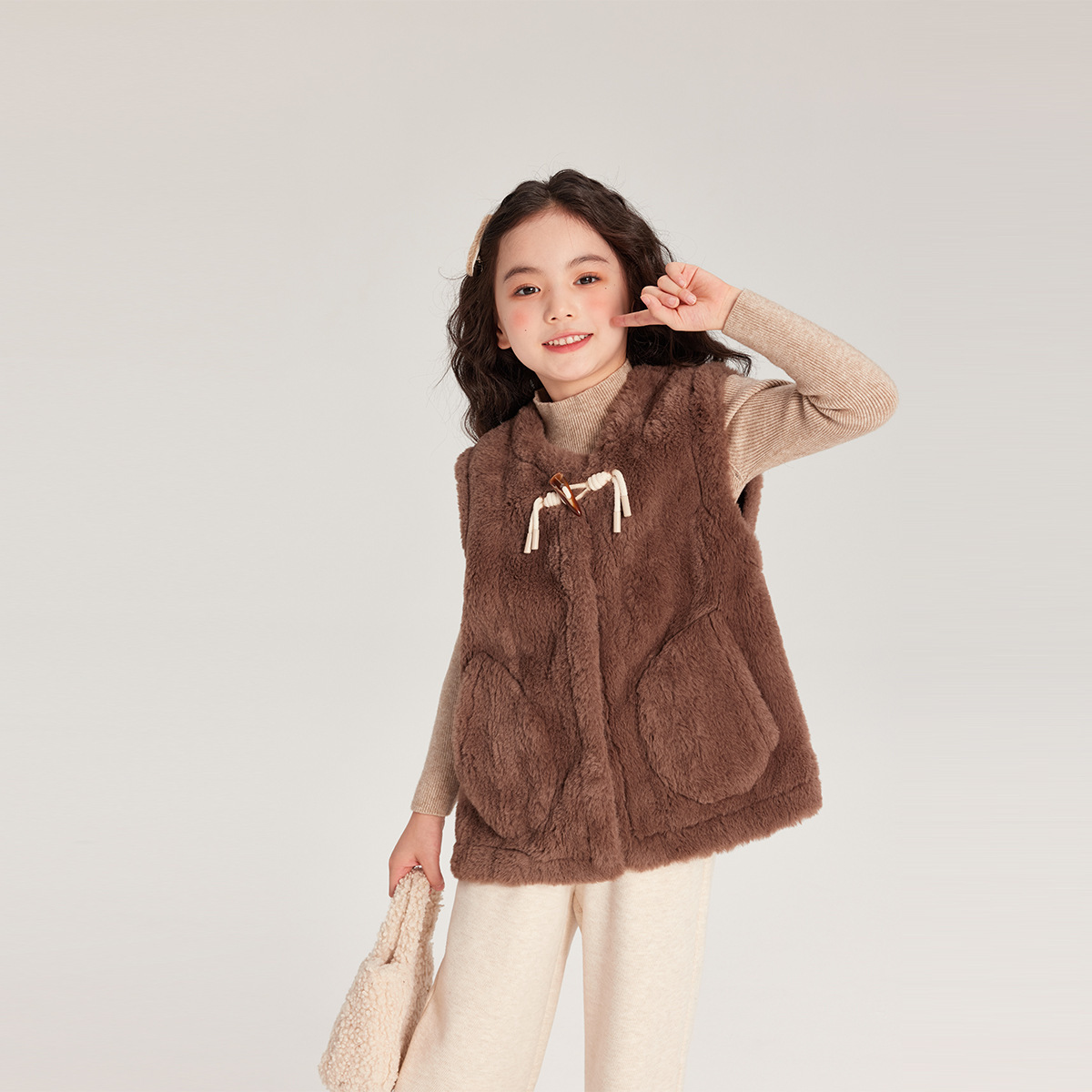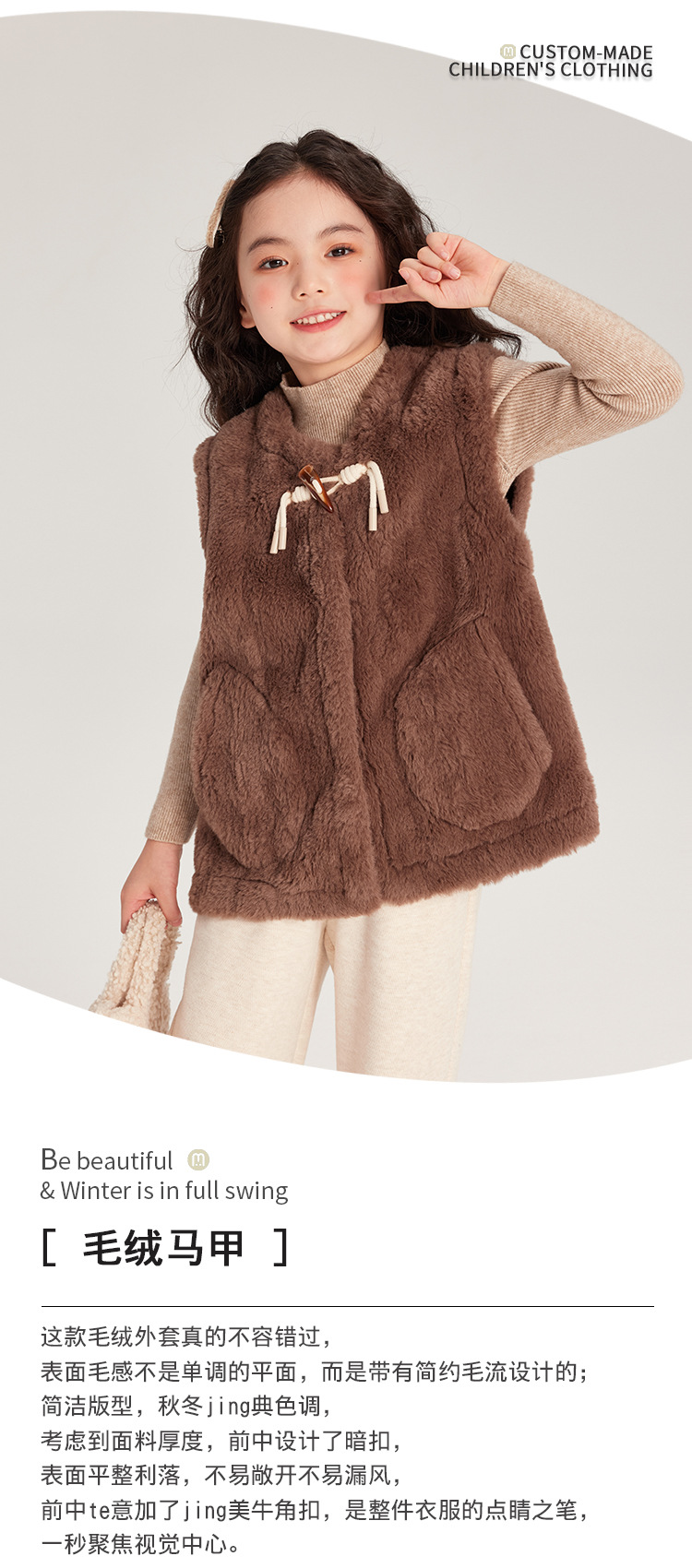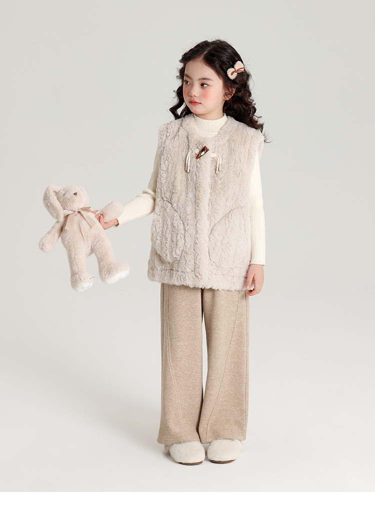 Pudding Haru 가을 겨울 신작 어린이 플러시 조끼, 피부 친화적이고 편안한 양각 버튼 소녀 조끼, 양쪽에 큰 주머니