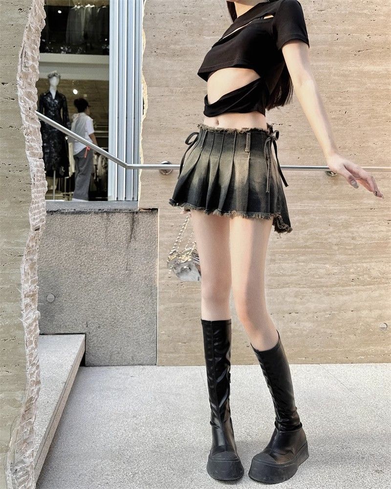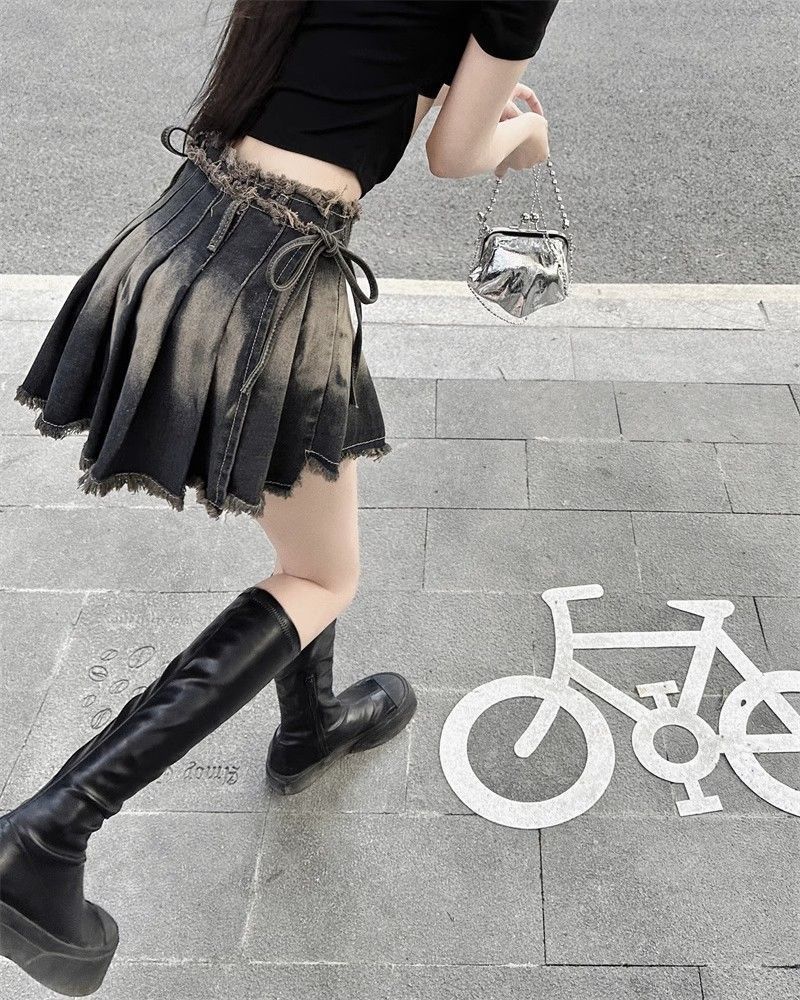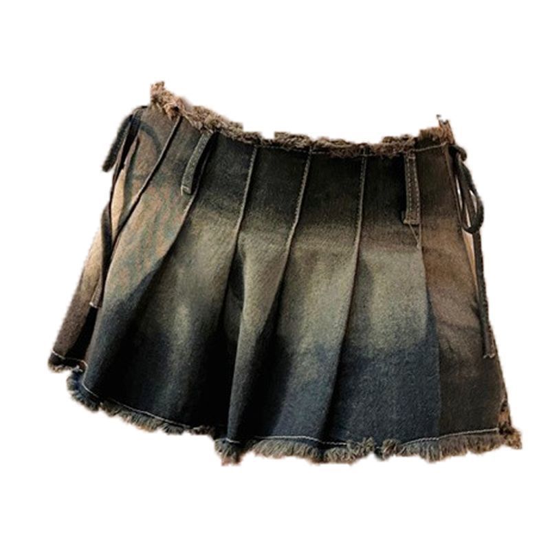 핫걸의 달콤한 스트리트 데님 미니 스커트 여성용 다용도 하이 웨이스트 슬리밍 디자인 불규칙한 플리츠 스커트스토어 가기