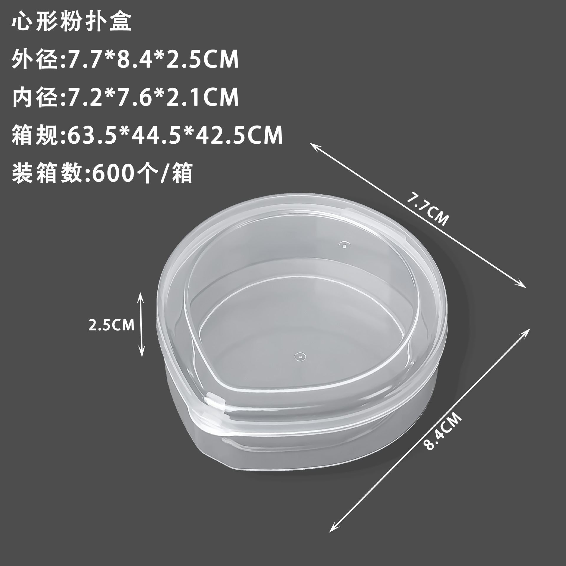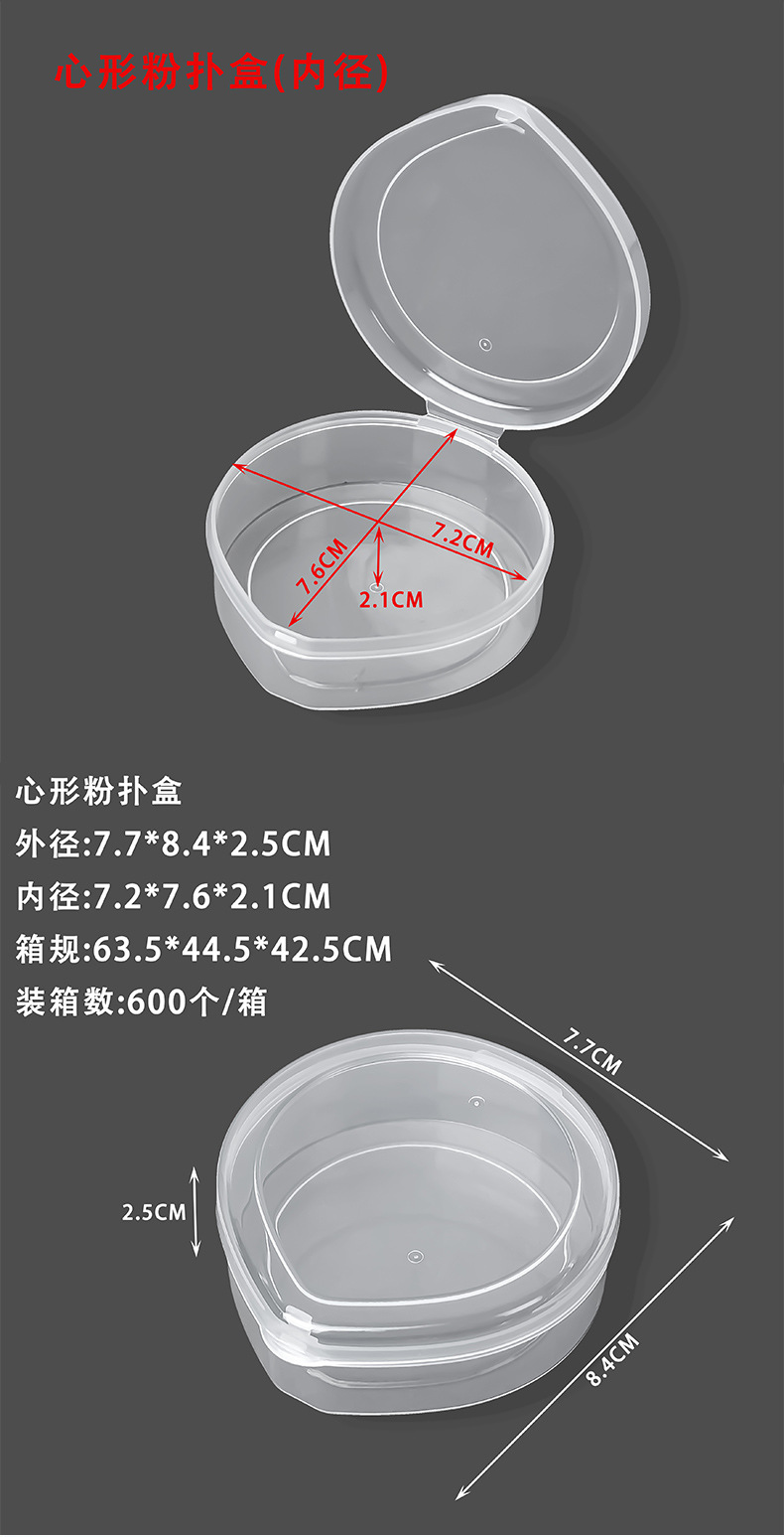 心形粉扑盒 外径:7.7*8.4*2.5CM 内径:7.2*7.6*2.1CM