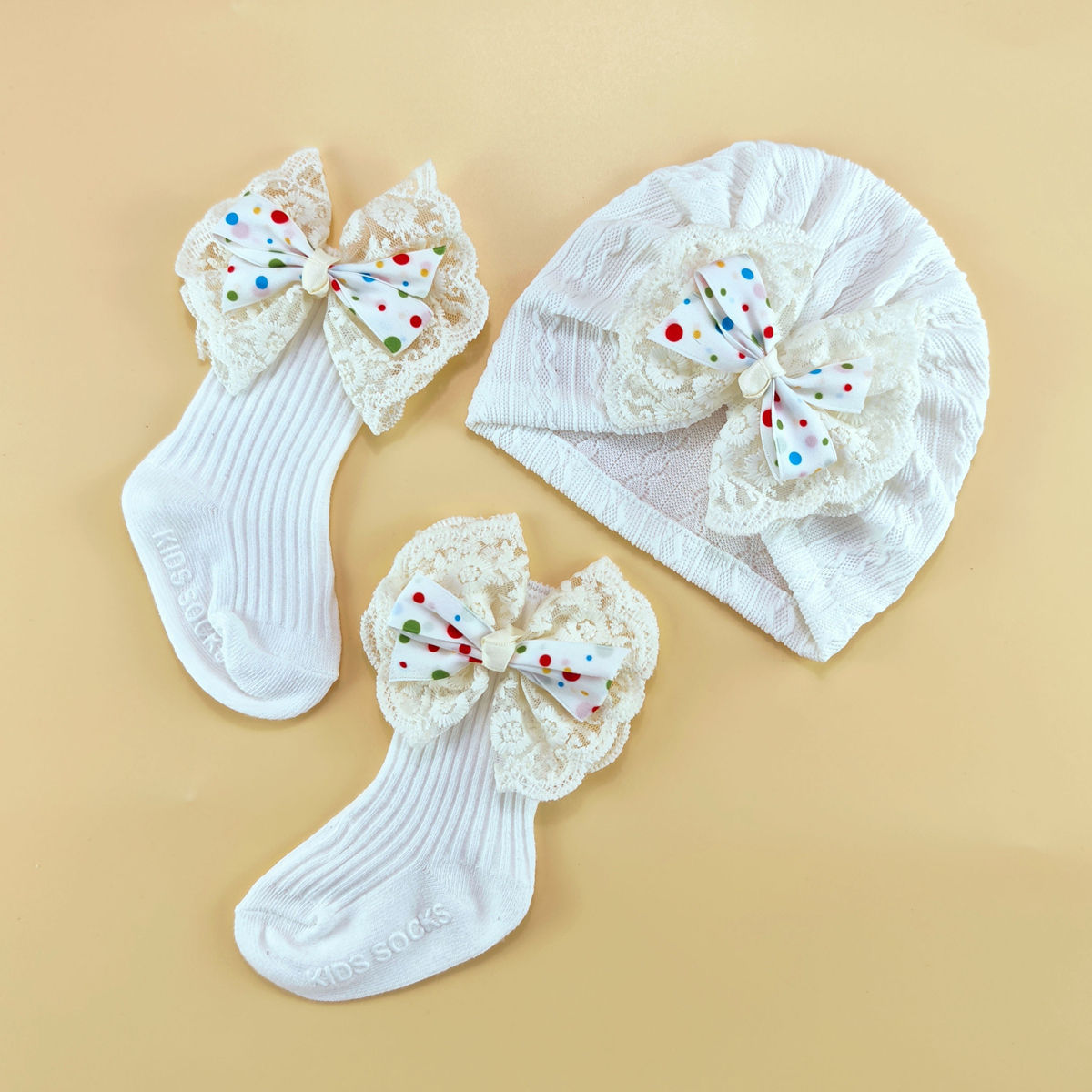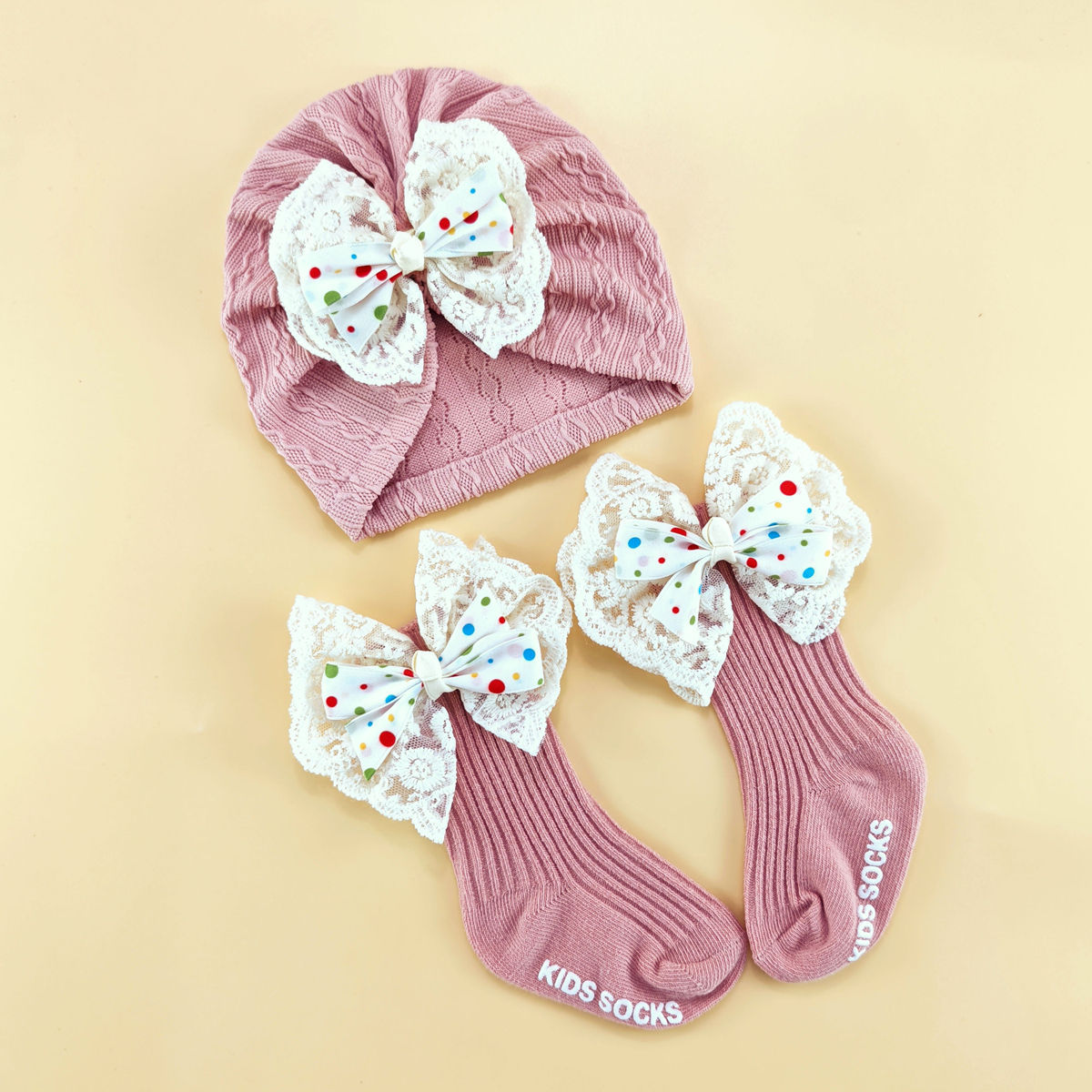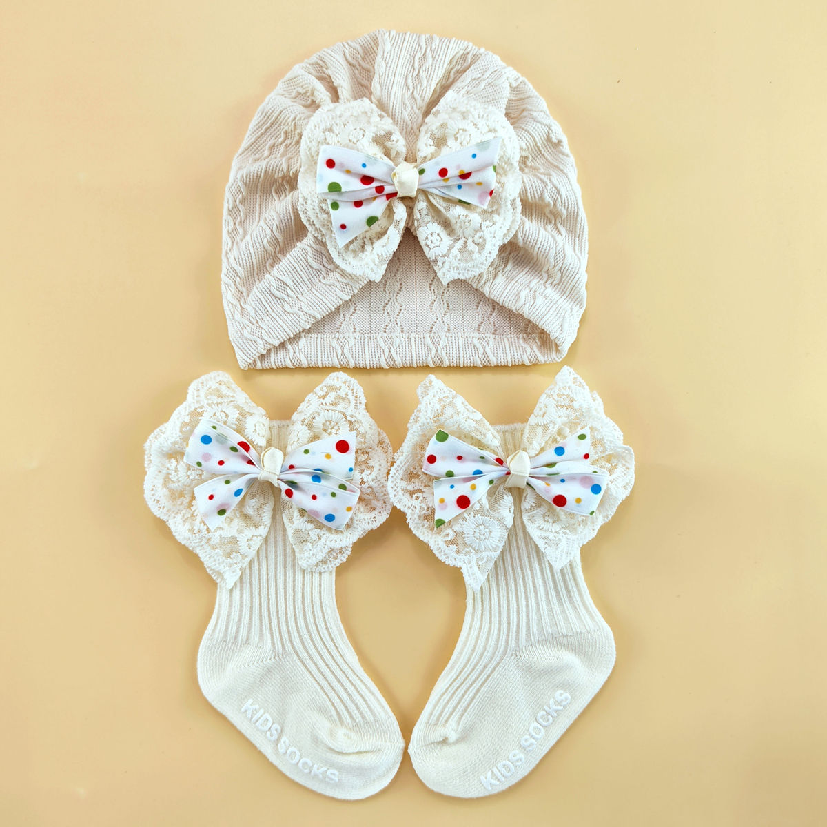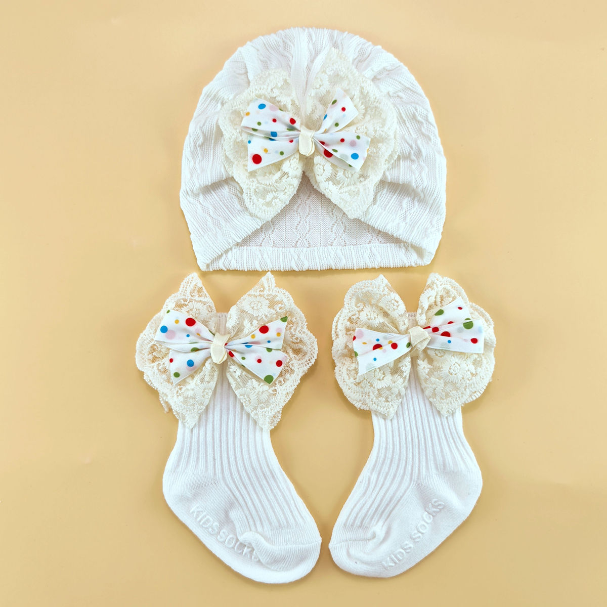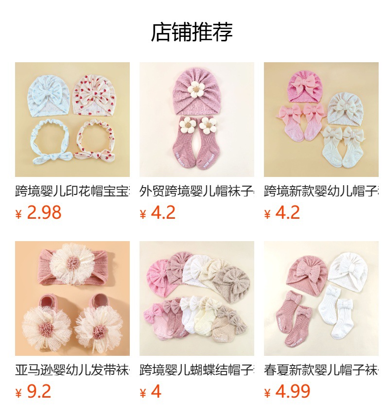 外贸婴儿帽0-6个月护囟门帽子弹性提花头巾帽袜子套装新生儿胎帽