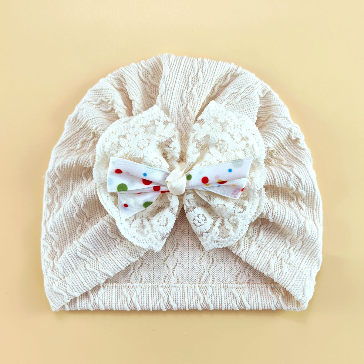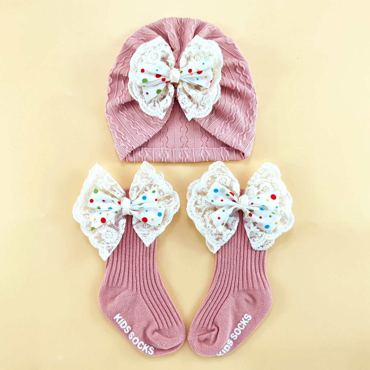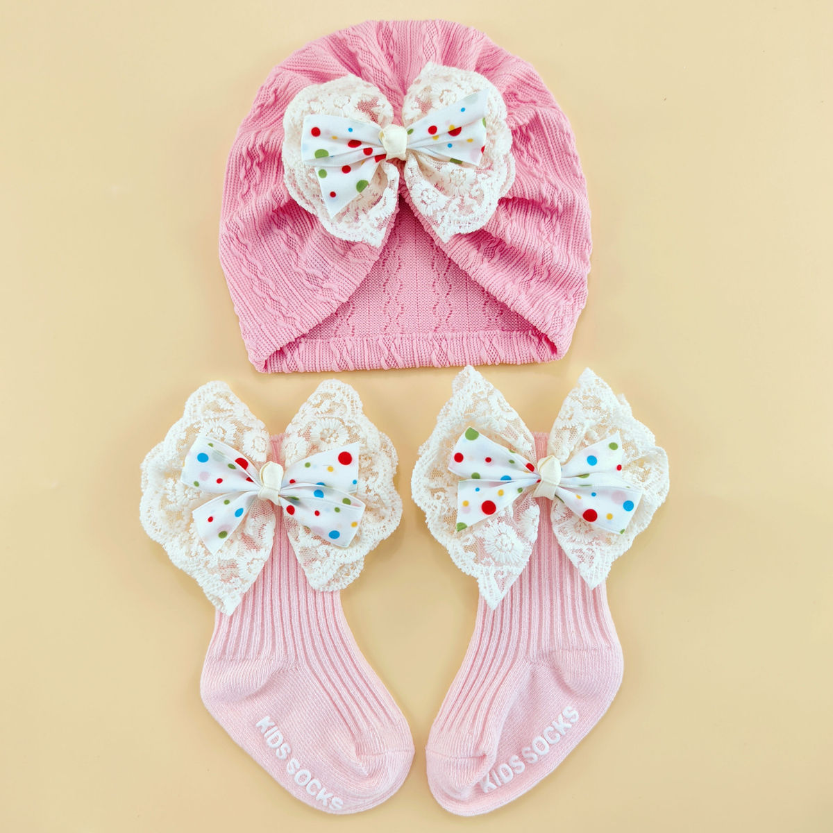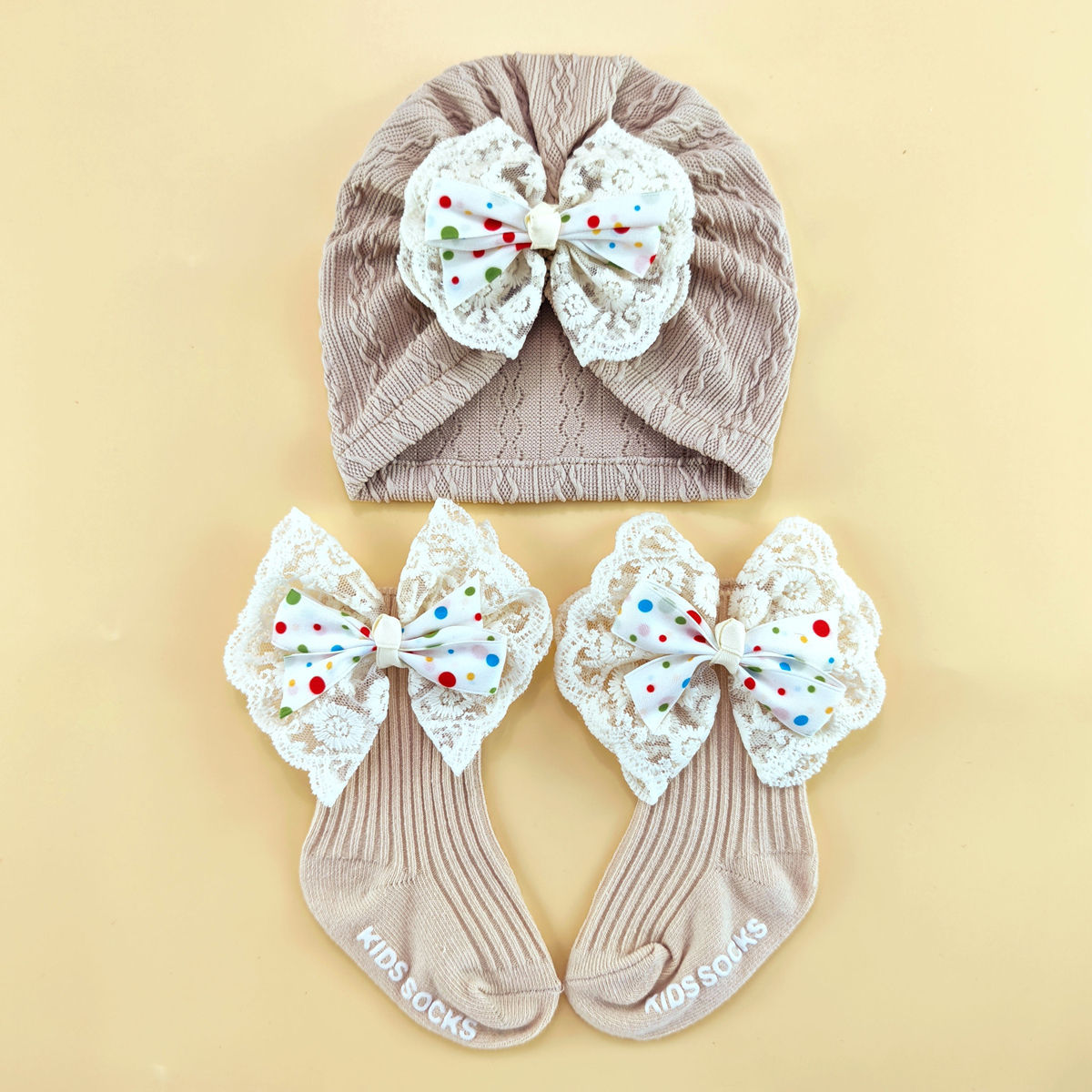 外贸婴儿帽0-6个月护囟门帽子弹性提花头巾帽袜子套装新生儿胎帽