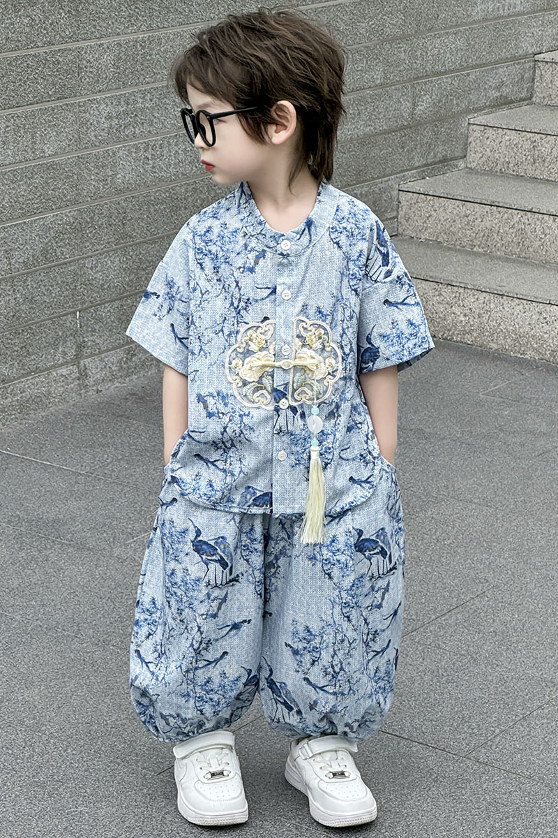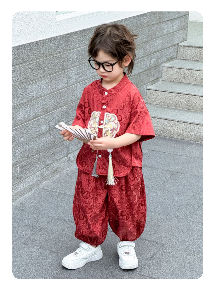 소년과 소녀 2025 여름 정장 여름 새로운 중국 스타일 국가 스타일 반팔 어린이 투피스 세트 자수 고대 스타일 정장스토어 가기