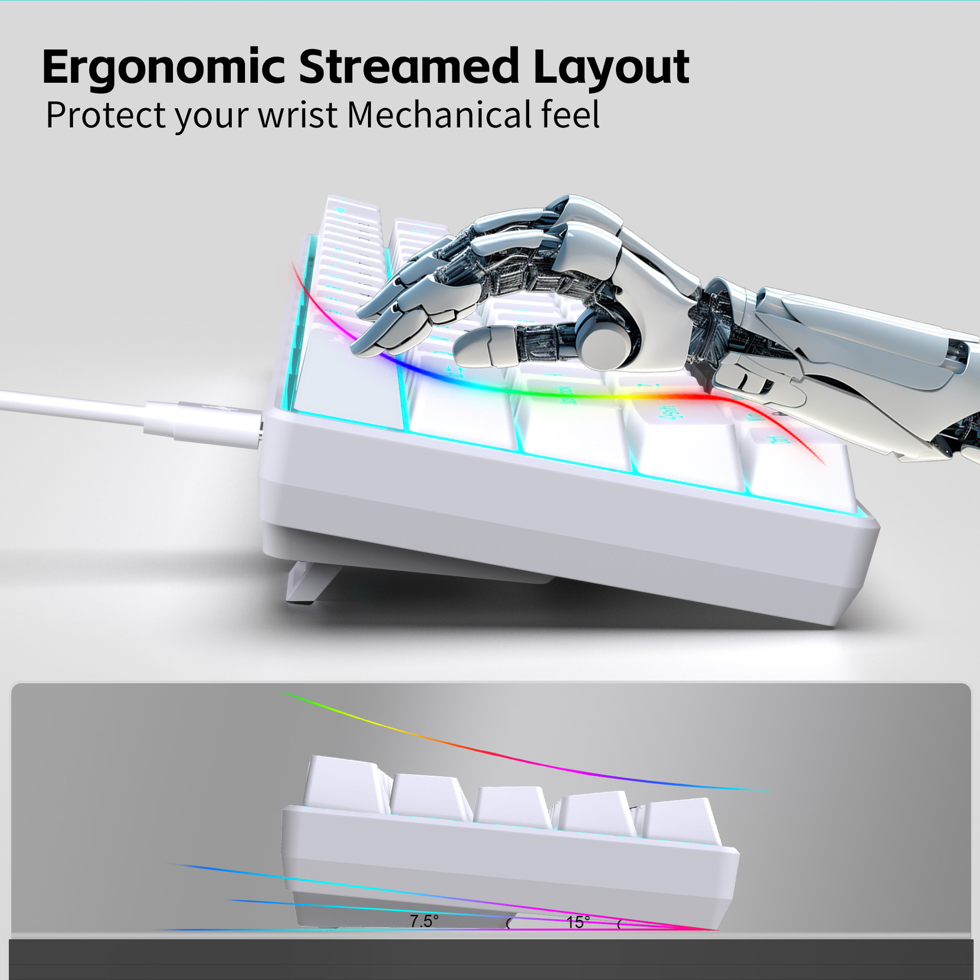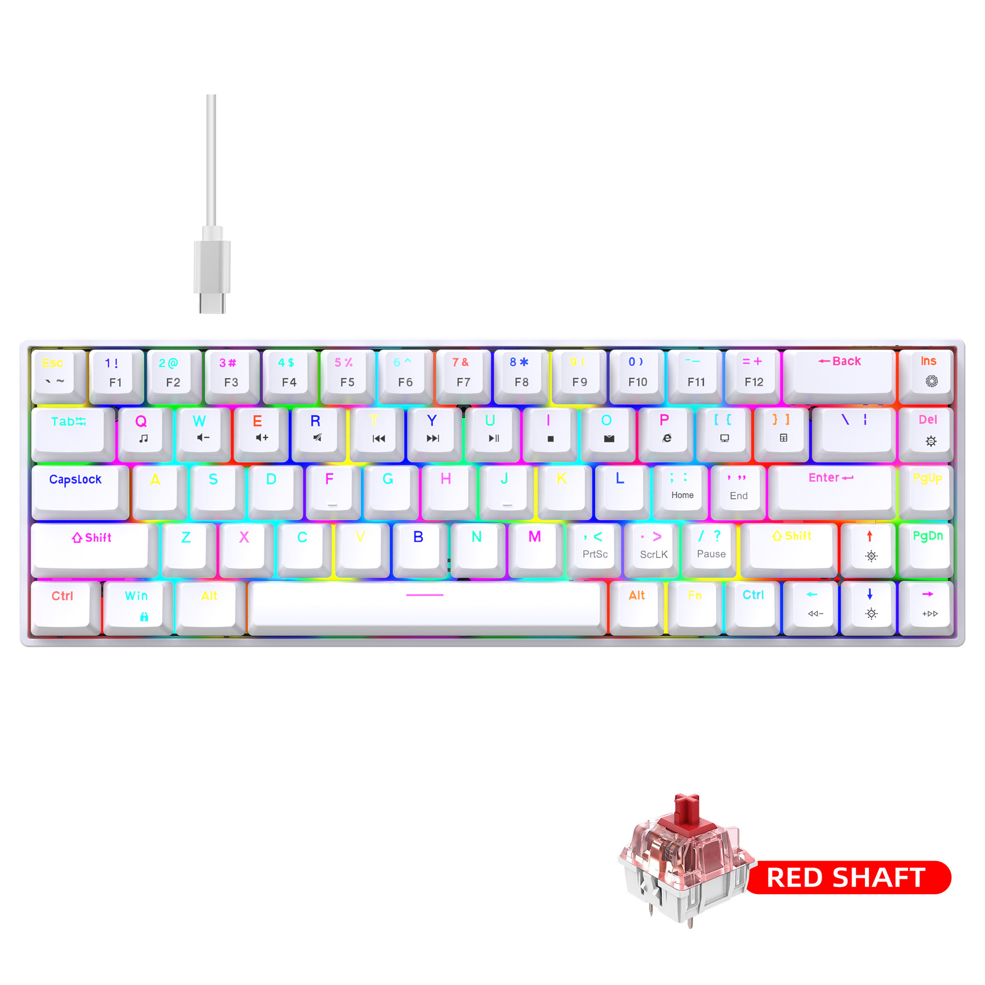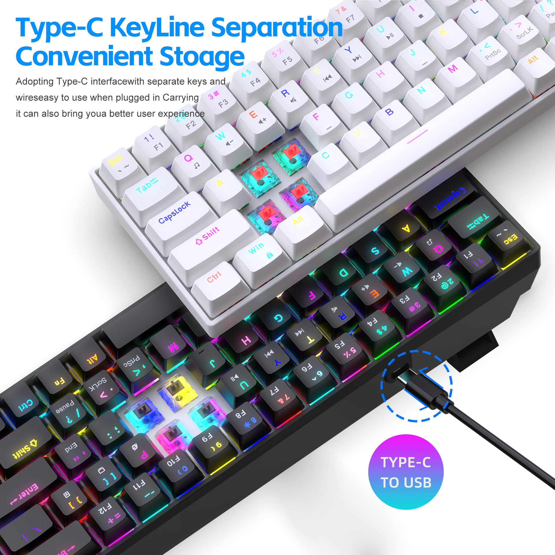 3. Detachable cable design and long data cable: The 68-key keyboard adopts a detachable cable design, allowing users to arrange the cables according to their preferences for a neater desktop space. It also comes with a 1.75-meter long data cable, facilitating connections to desktop computers, laptops, and other devices.
