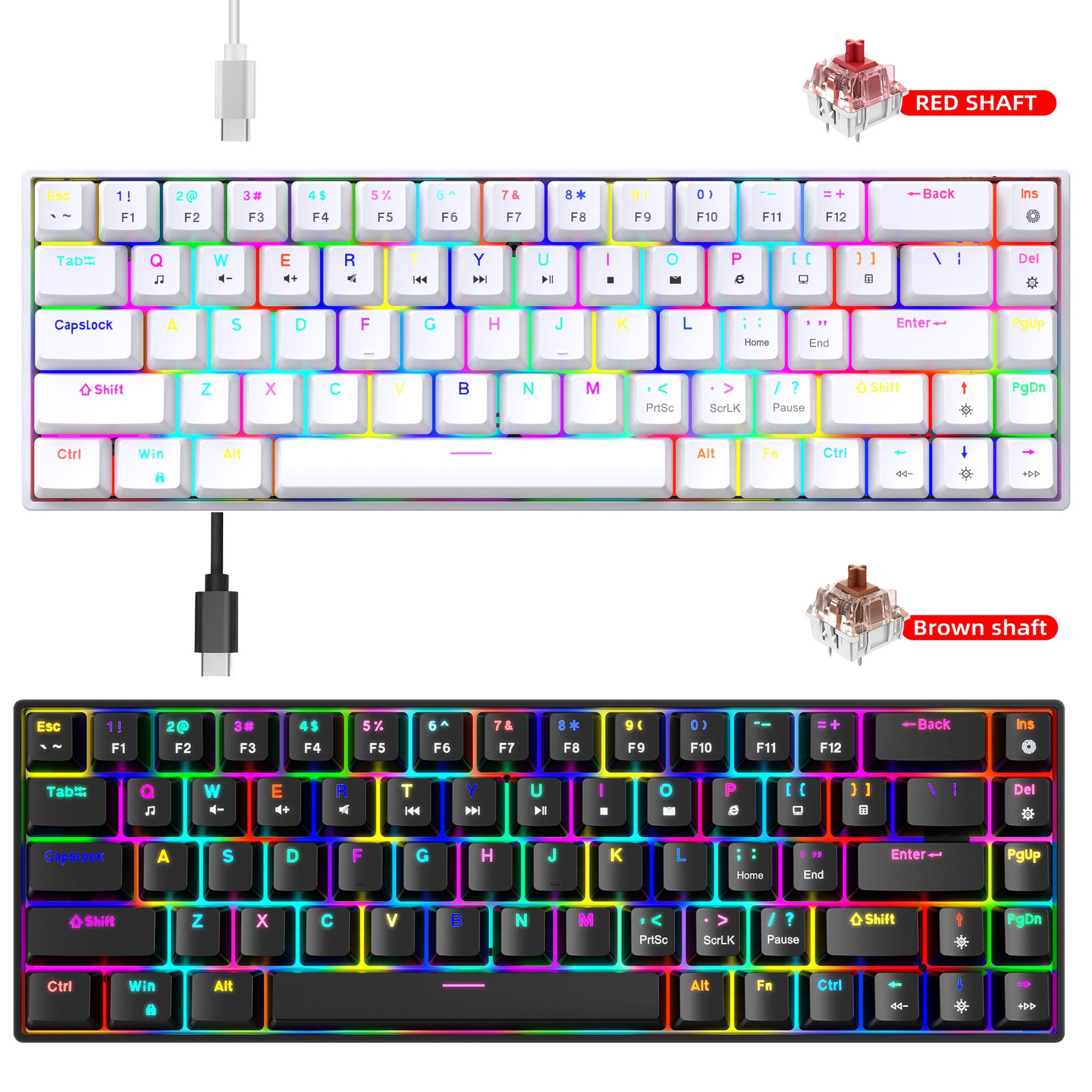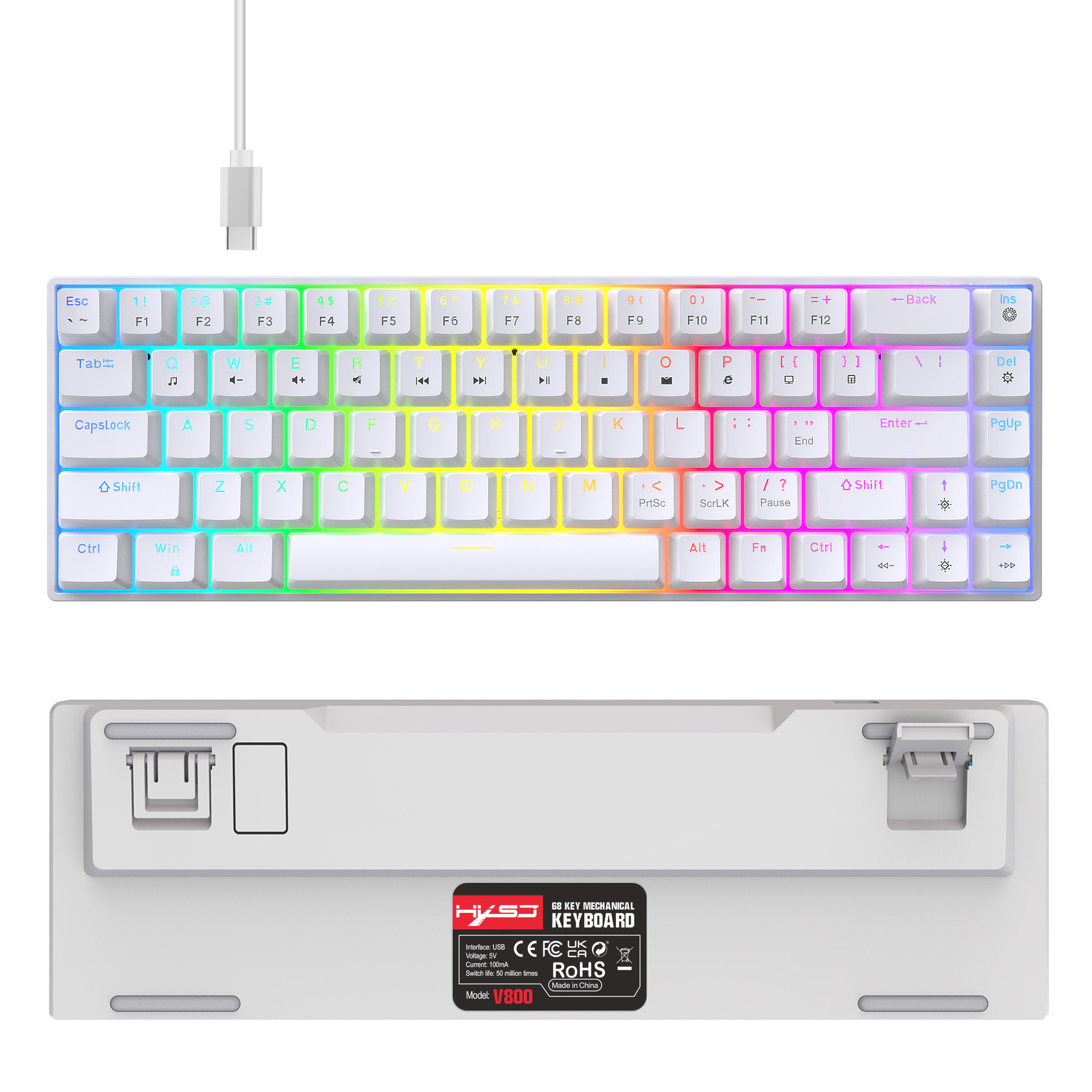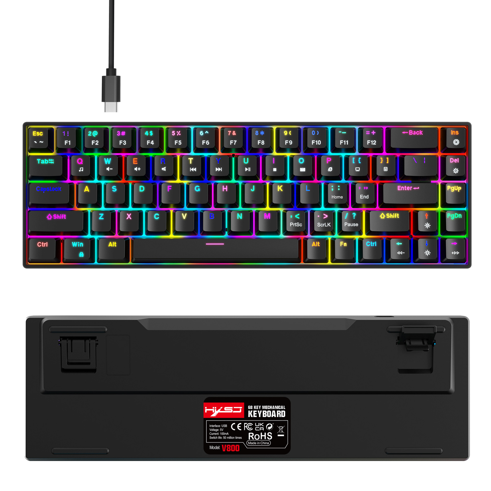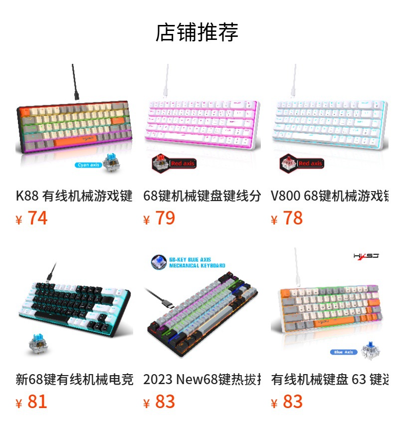 1.V800RGB backlight hot-swappable switches and ergonomic design: This 68-key keyboard features hot-swappable switches, allowing users to replace them according to their preferences, with options for red switches and brown switches. Additionally, it incorporates an ergonomic design to provide a more comfortable typing experience and reduce hand fatigue.