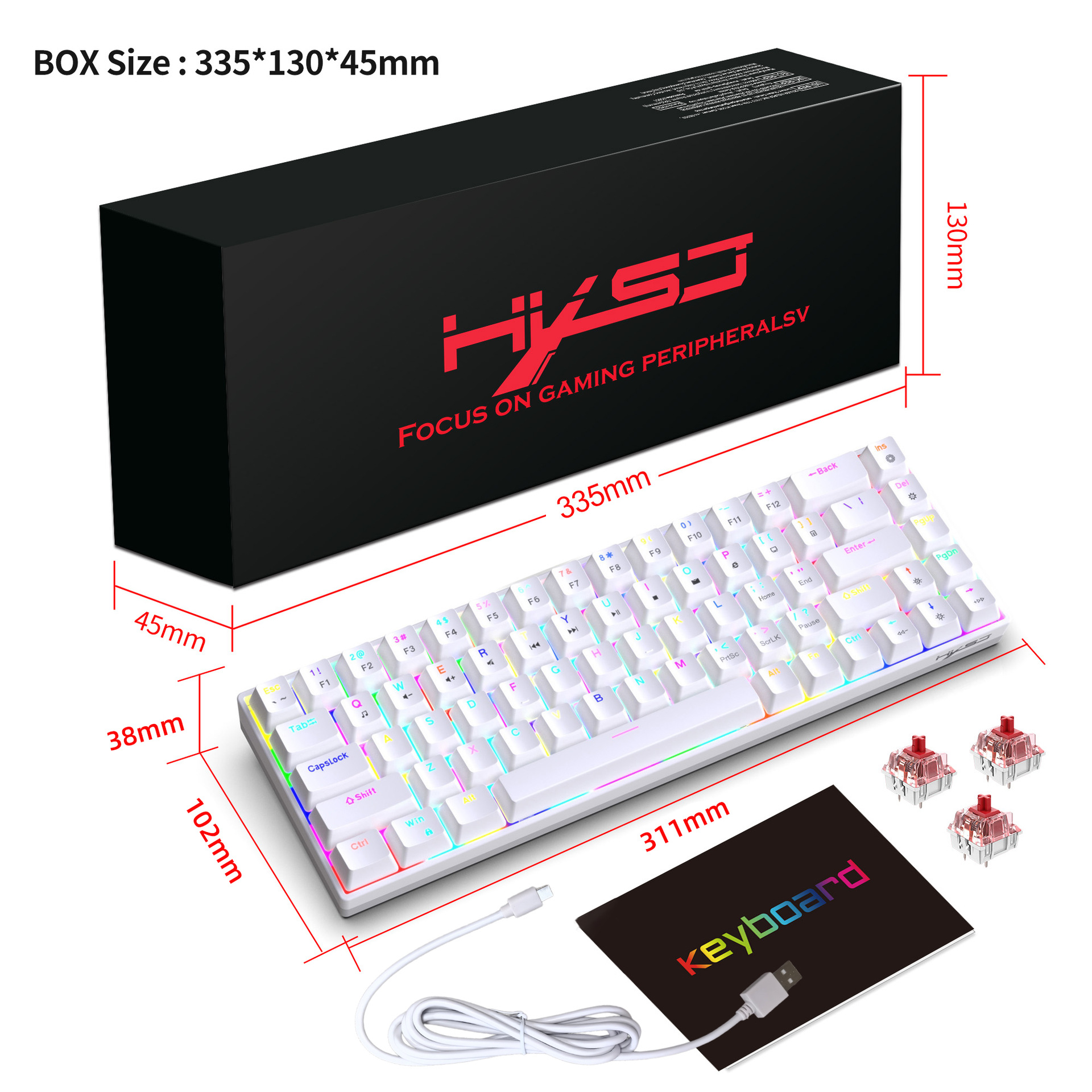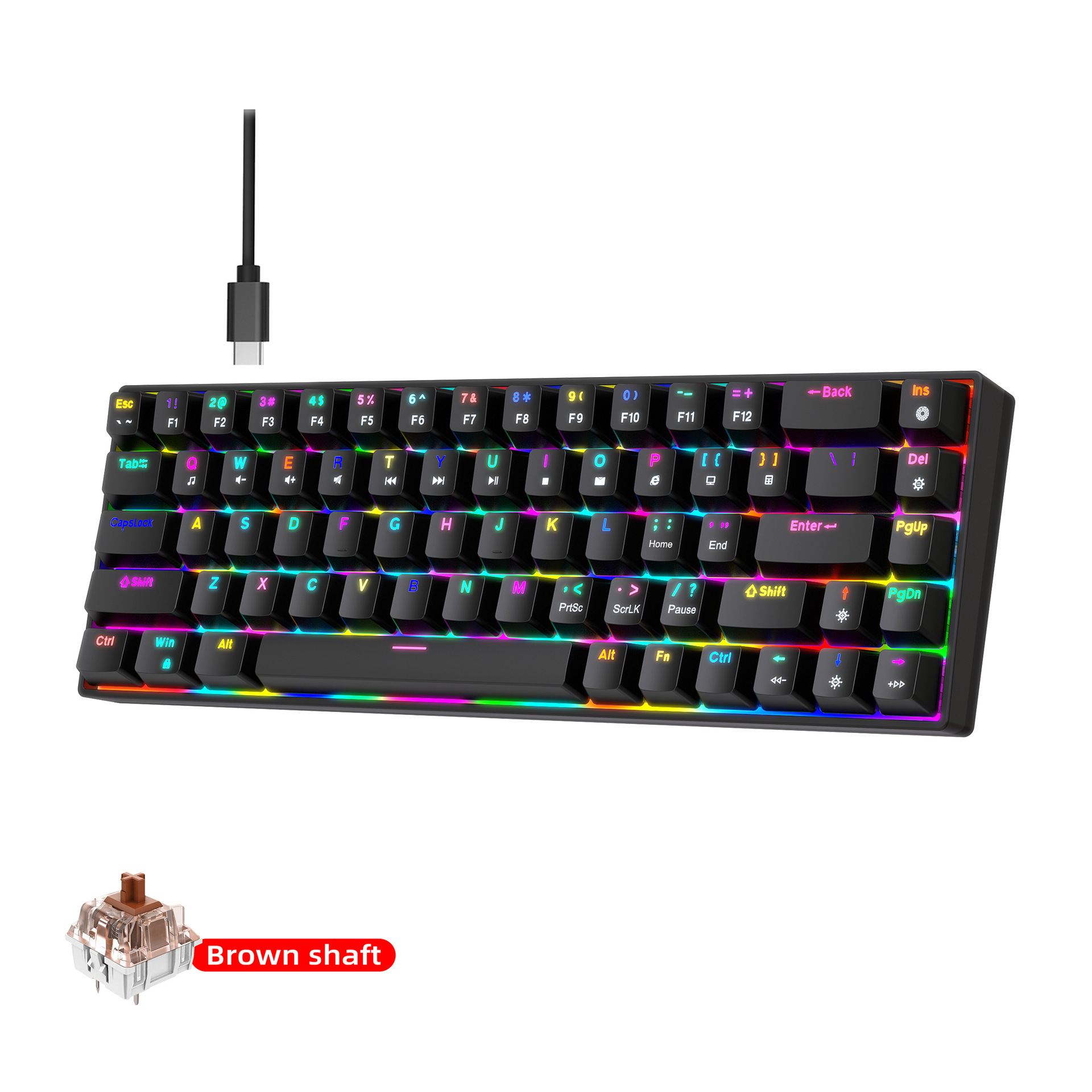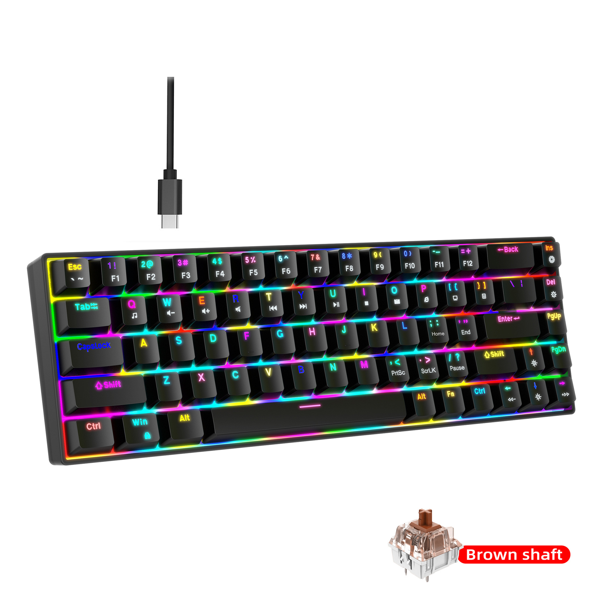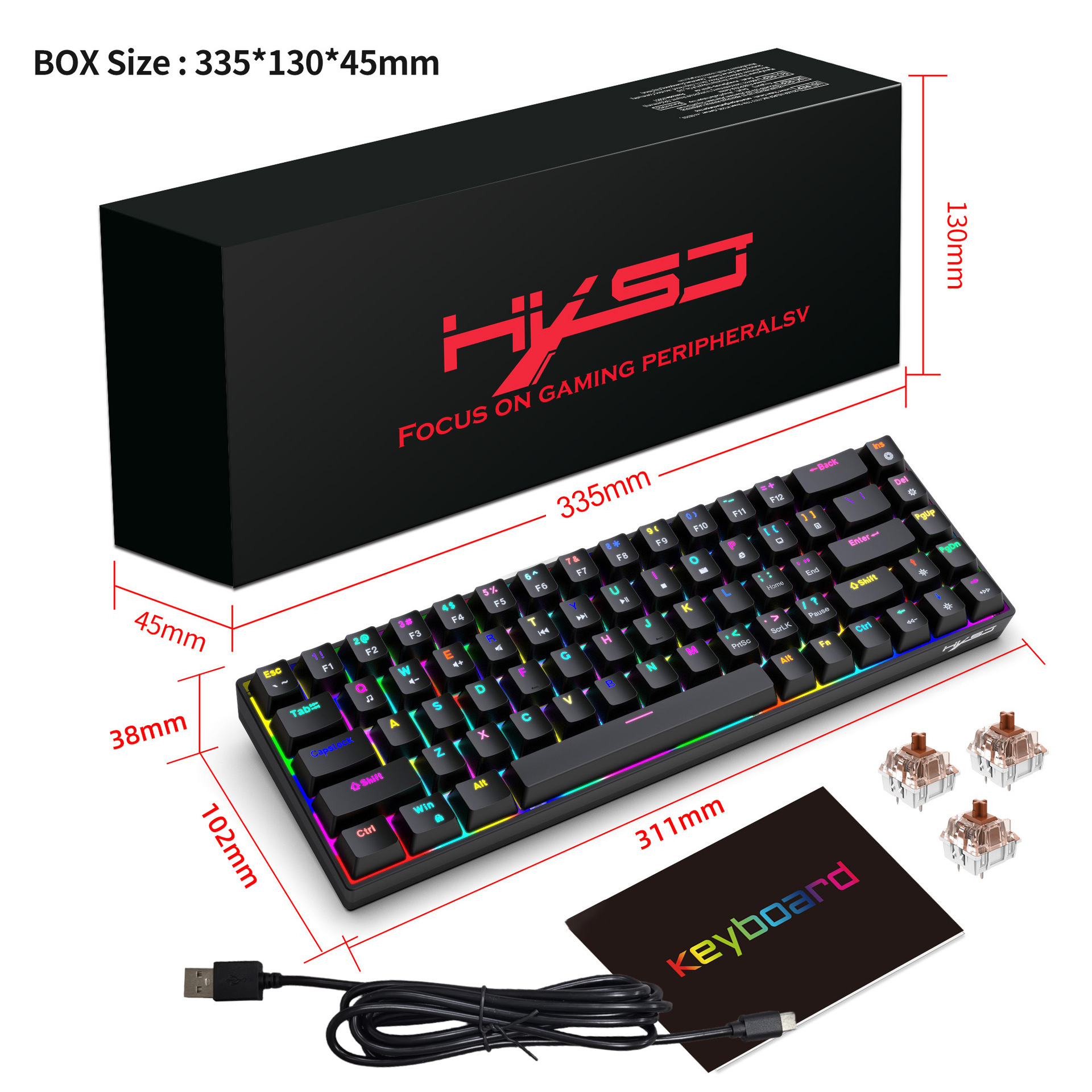 1.V800RGB backlight hot-swappable switches and ergonomic design: This 68-key keyboard features hot-swappable switches, allowing users to replace them according to their preferences, with options for red switches and brown switches. Additionally, it incorporates an ergonomic design to provide a more comfortable typing experience and reduce hand fatigue.