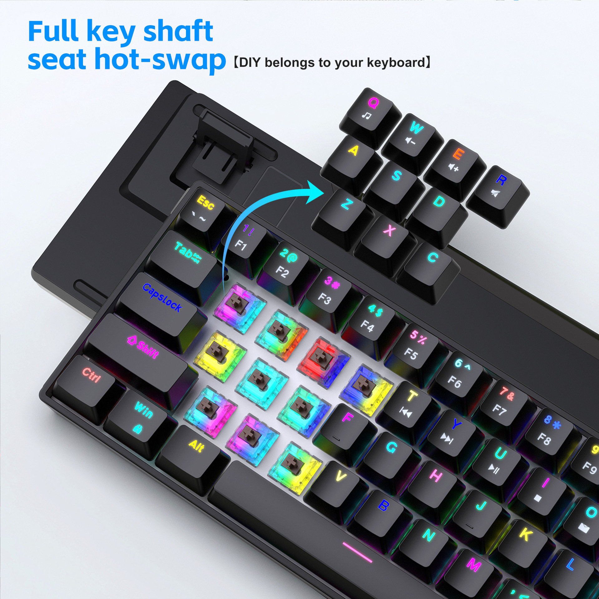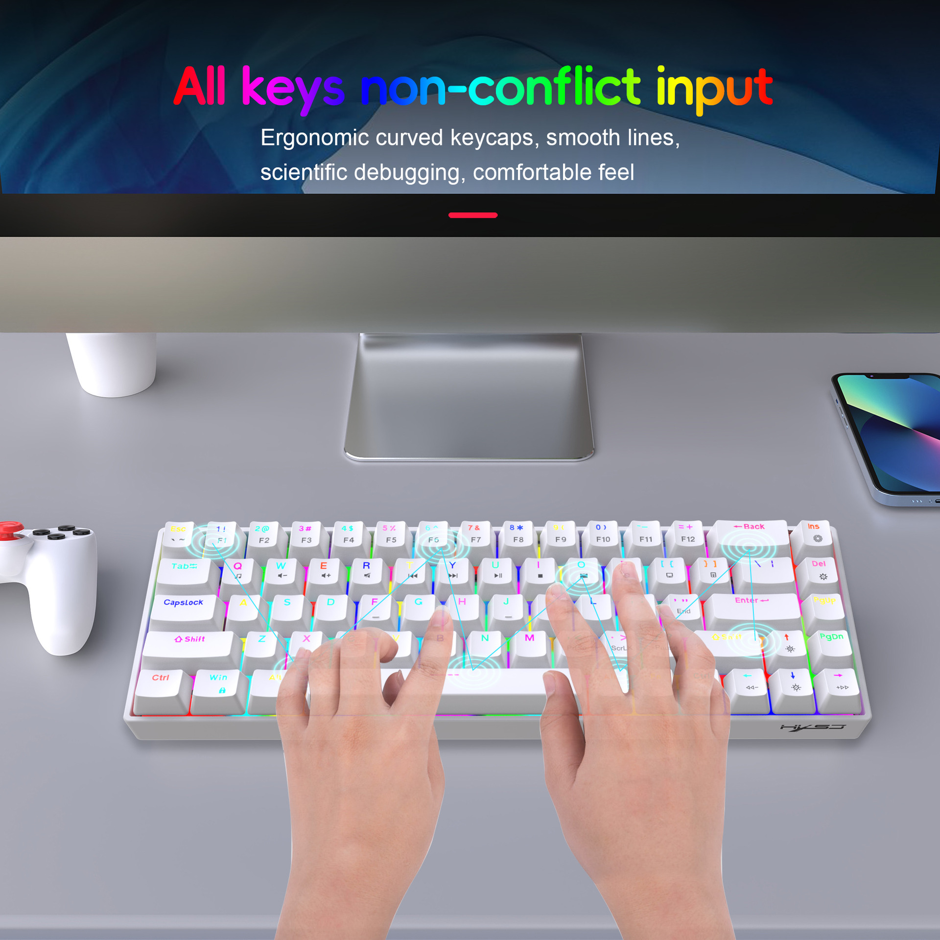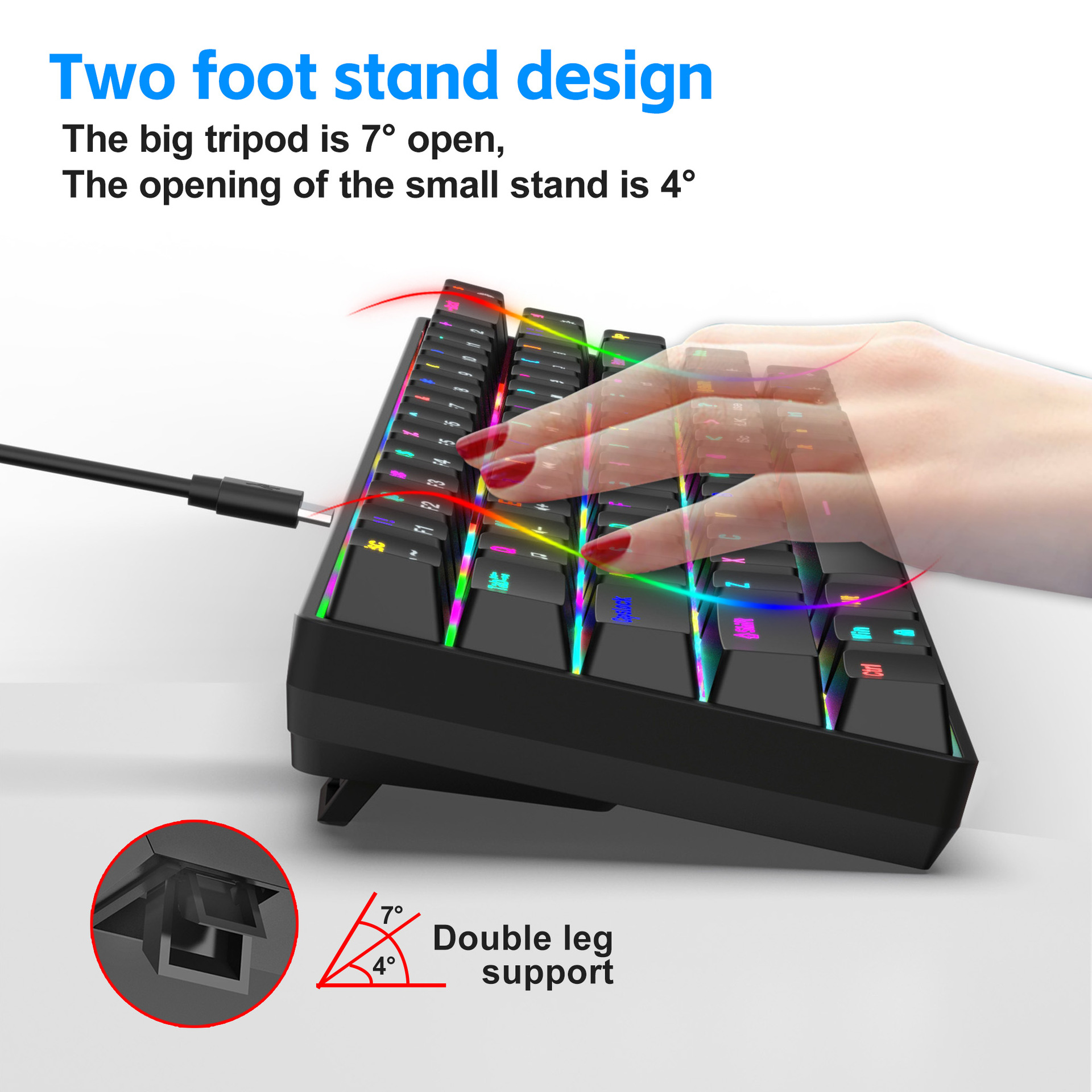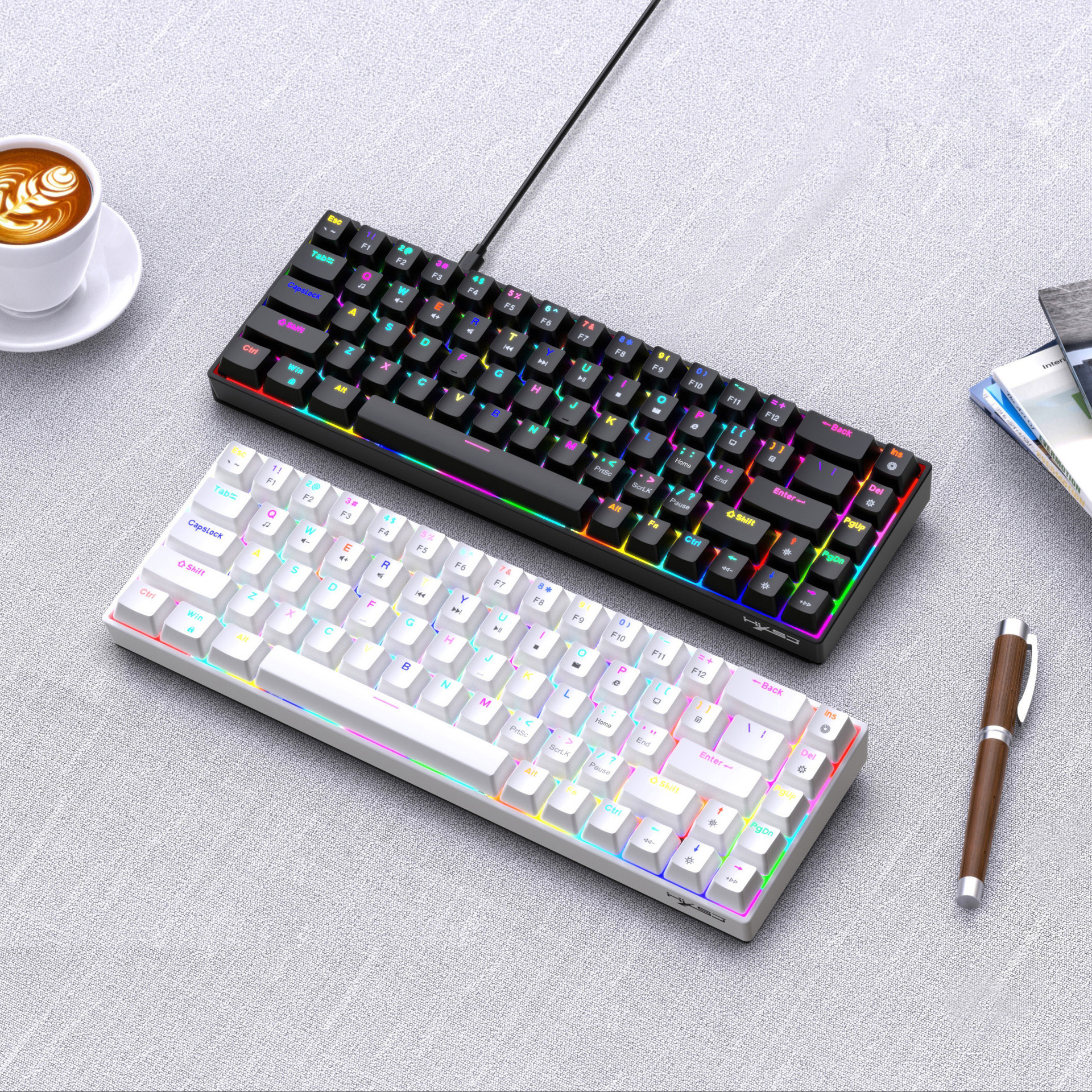 1.V800RGB backlight hot-swappable switches and ergonomic design: This 68-key keyboard features hot-swappable switches, allowing users to replace them according to their preferences, with options for red switches and brown switches. Additionally, it incorporates an ergonomic design to provide a more comfortable typing experience and reduce hand fatigue.