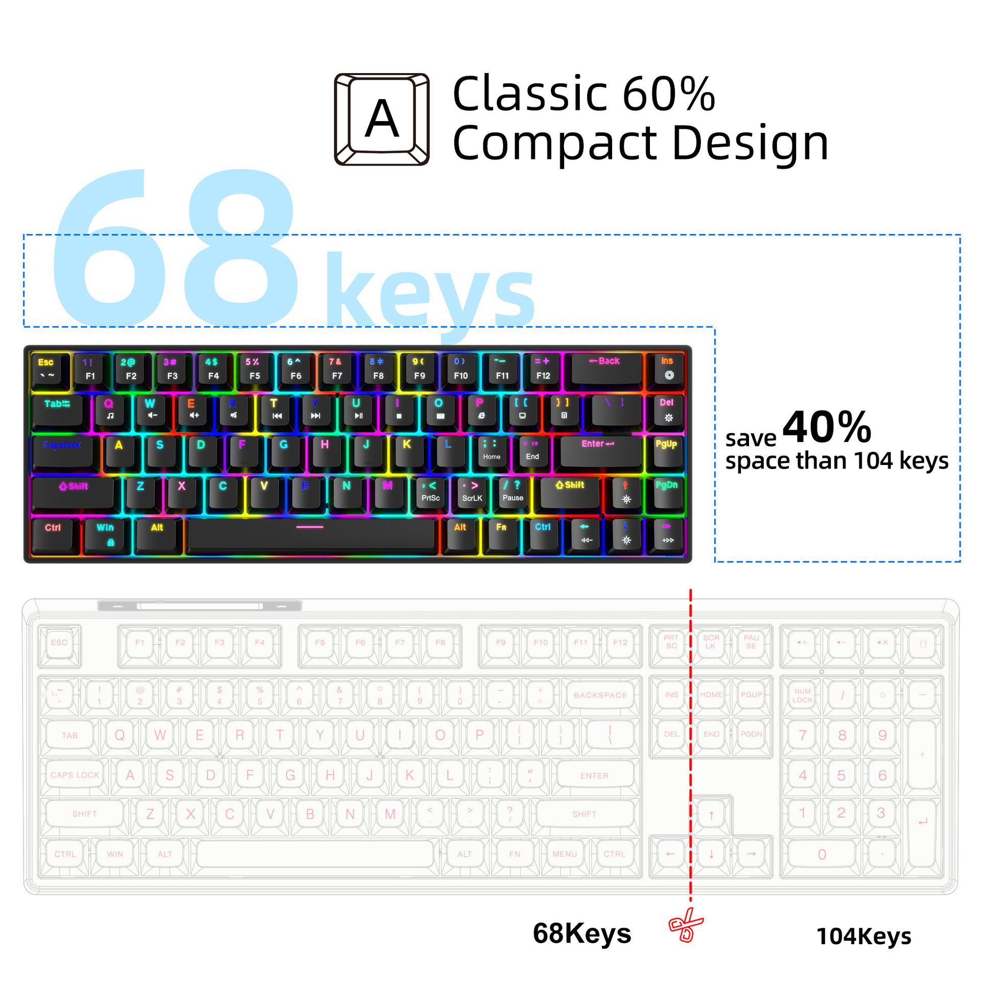 5. Multi-system compatibility and portability: The 68-key keyboard is compatible with various computer systems, including Windows, Mac IOS, and Linux. It also has a compact and portable design, making it easy to carry and use.