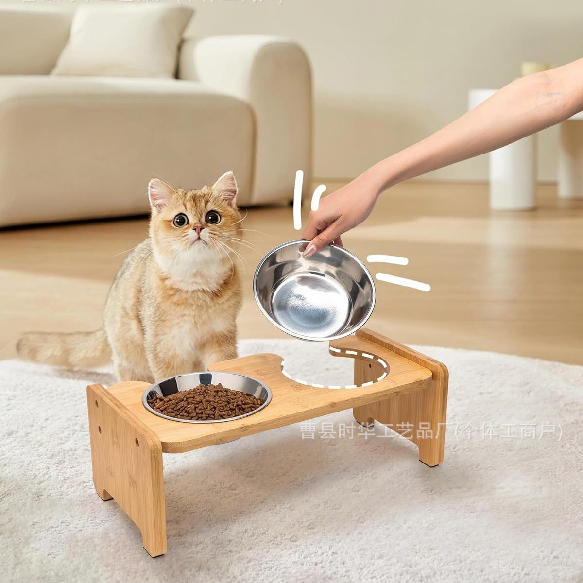 대나무 나무 애완 동물 개밥 더블 그릇 홀더 먹이 랙 고양이 그릇 홀더 피더 애완 동물 그릇 스테인레스 스틸 식사 랙