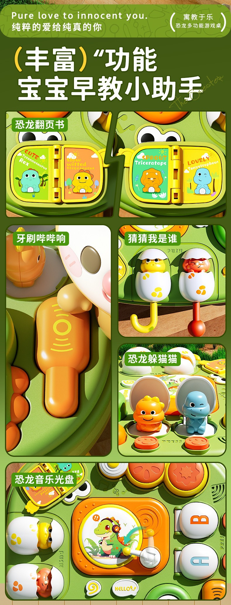 亮点:多功能玩具:1.小恐龙钢琴,可拆卸,可切换四种模式。2.刷子按压发出声音。3.躲猫猫功能按下弹出恐龙。4.手拍鼓功能。5.翻书页。6.抽拉露出恐龙。7.光盘播放音乐。