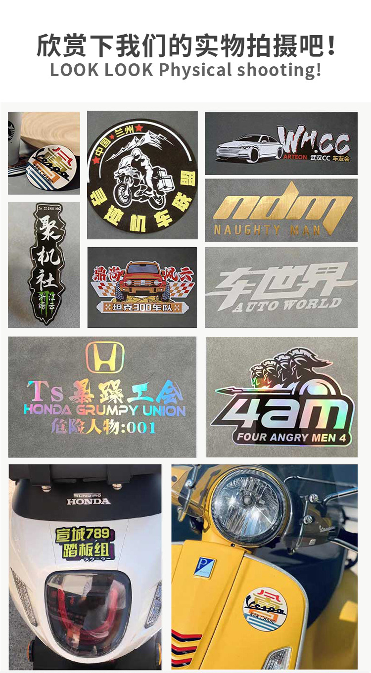 공장 도매 PVC 자동차 스티커 사용자 정의 방수 및 태양 보호 팀 엠블럼 자동차 스티커 텍스트 중공 반사 스티커 레이저 스티커 이동식스토어 가기