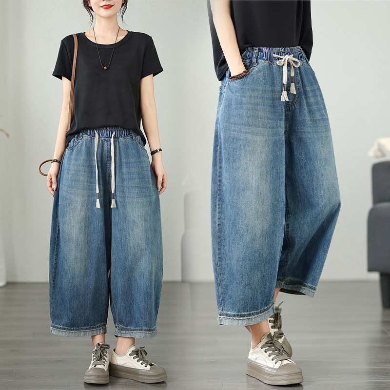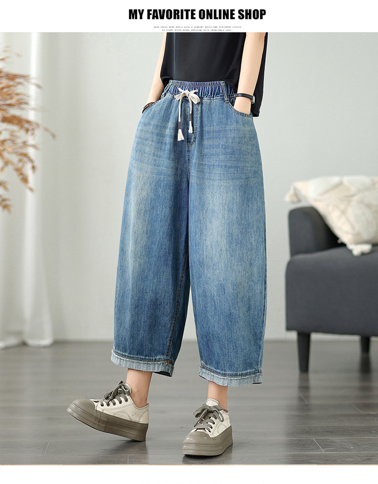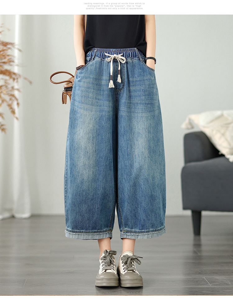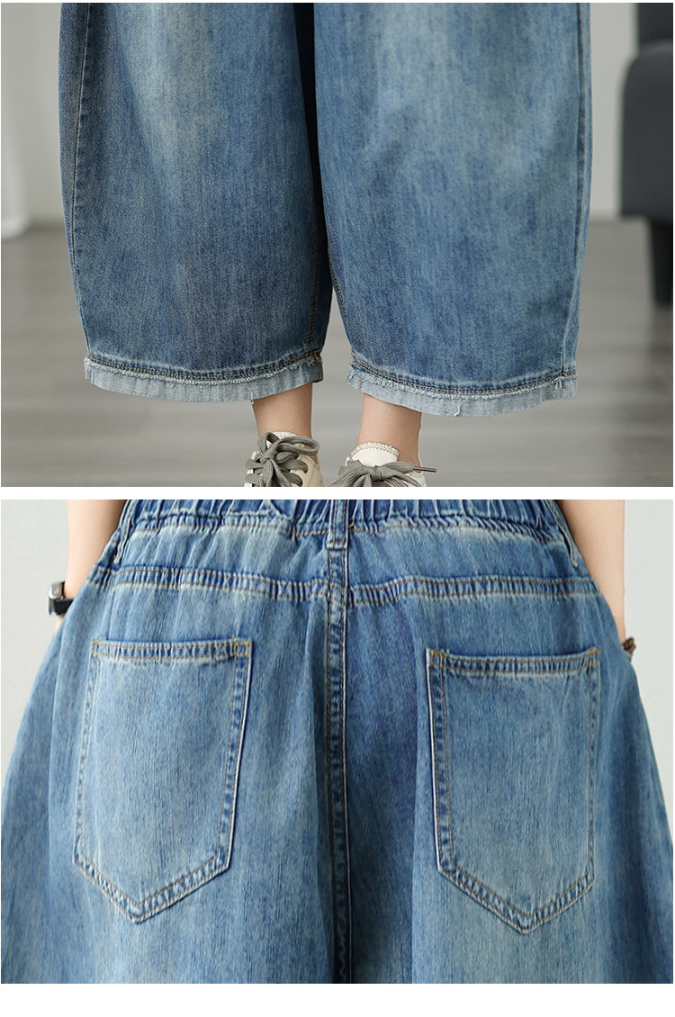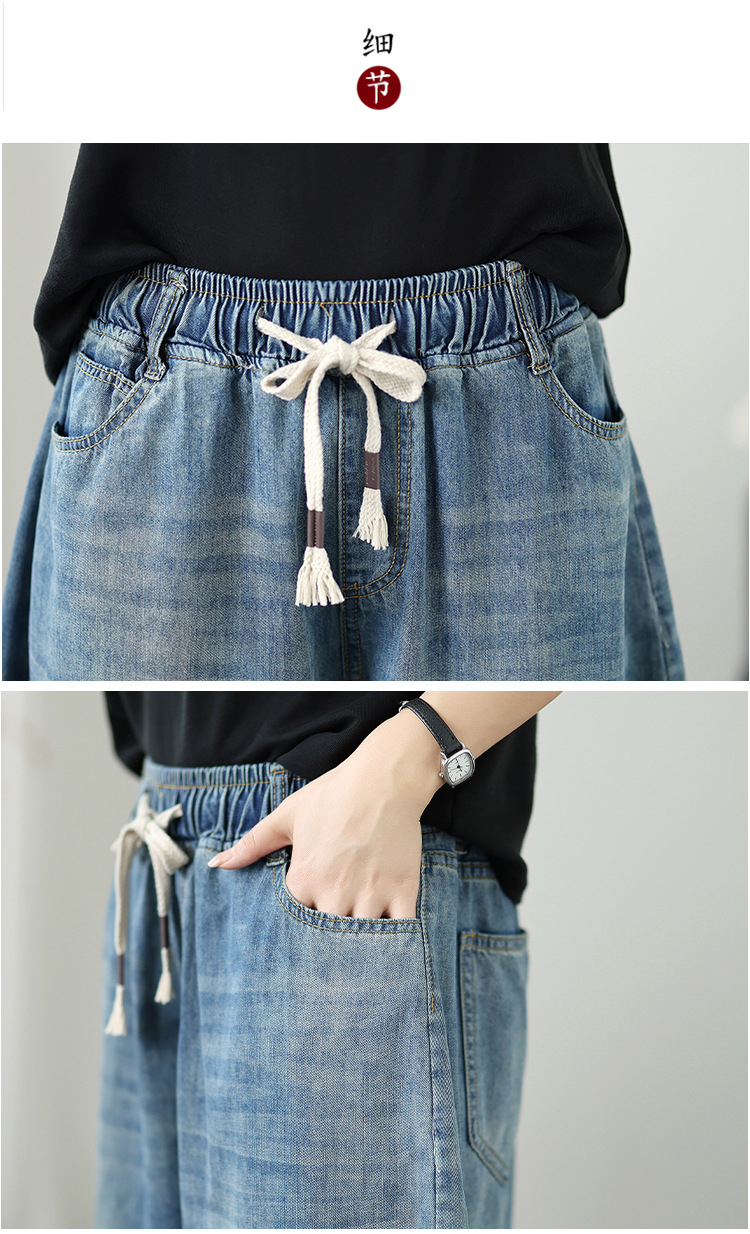 여성용 리얼샷 데님 블루머, 신축성 있는 허리, 캐주얼, 다용도, 루즈, 슬리밍, 여름용 얇은 여성용 와이드 레그 9부 팬츠스토어 가기