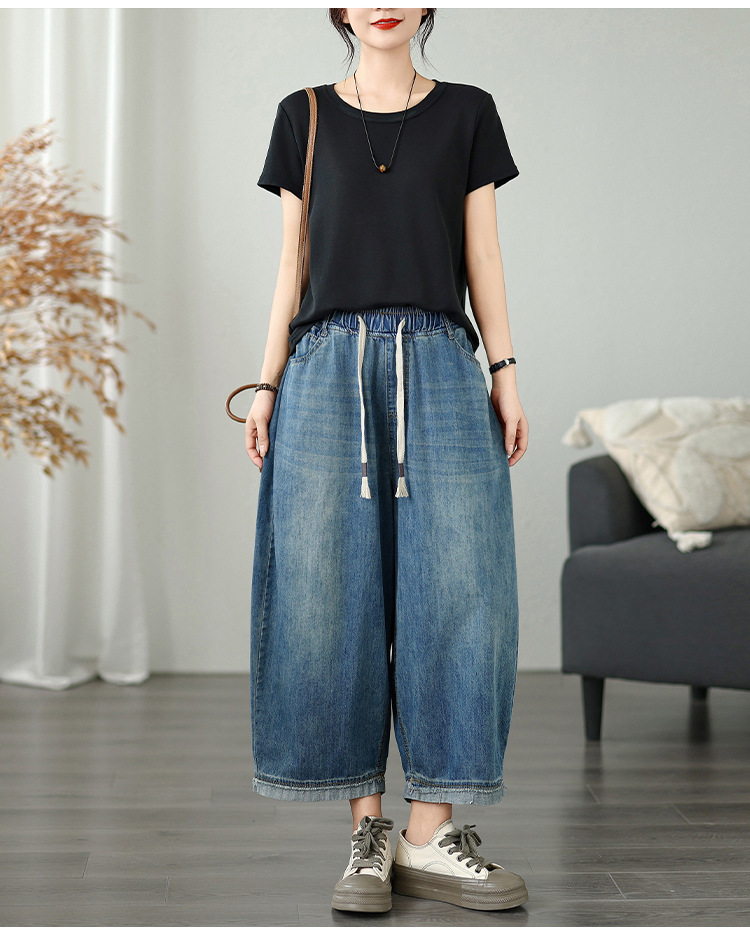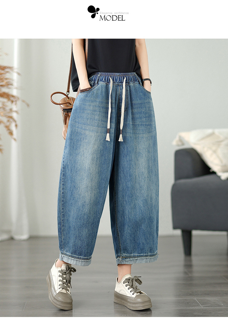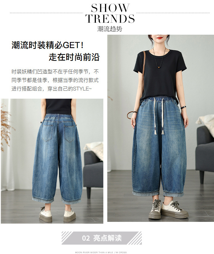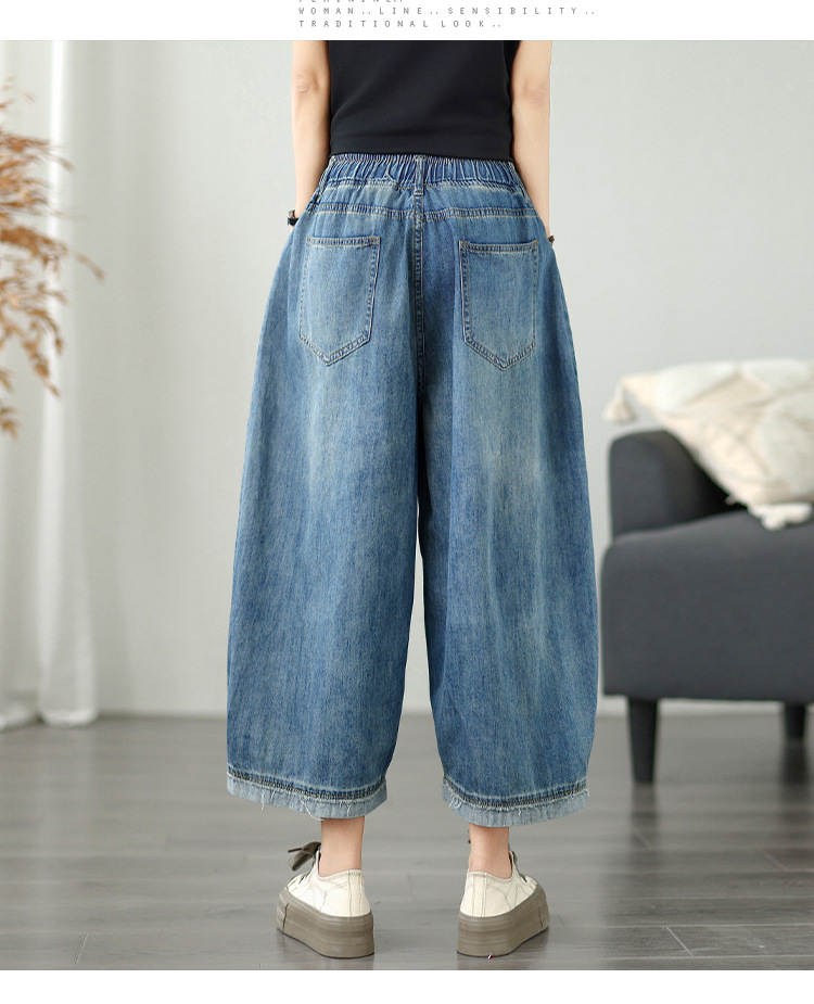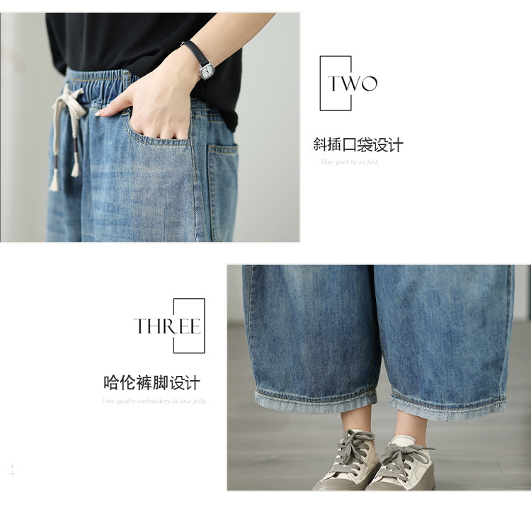 여성용 리얼샷 데님 블루머, 신축성 있는 허리, 캐주얼, 다용도, 루즈, 슬리밍, 여름용 얇은 여성용 와이드 레그 9부 팬츠스토어 가기