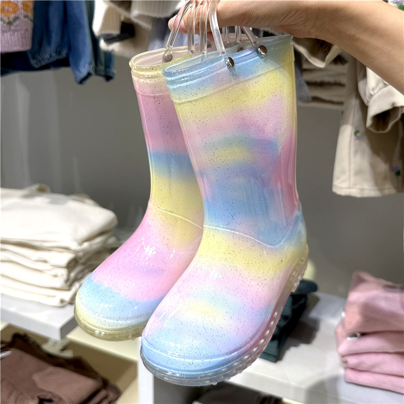 부모-자식 수출 무지개 어린이 장화 초등학생 소녀 유치원 미끄럼 방지 중간 튜브 장화 무지개 사계절 워터 슈즈