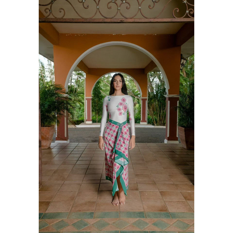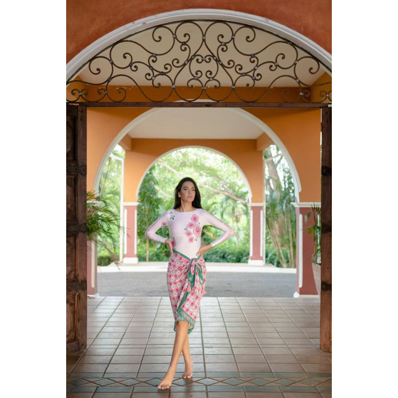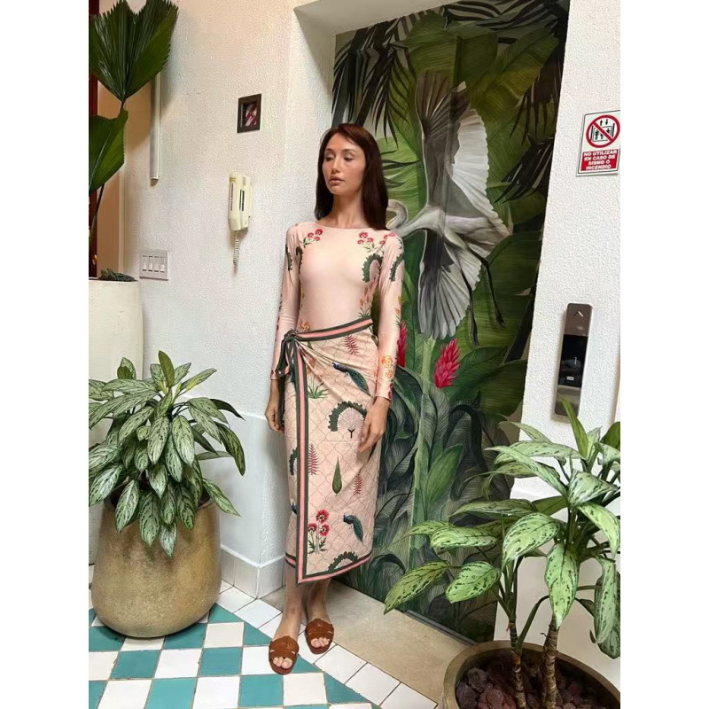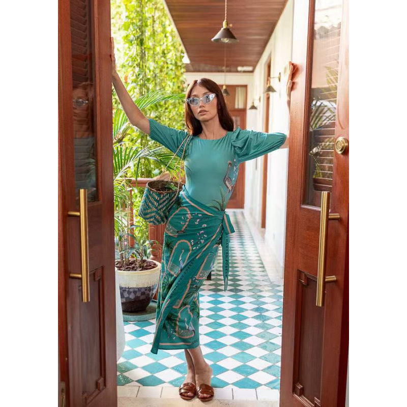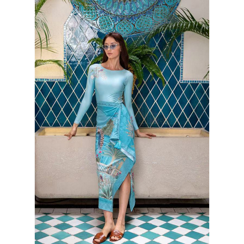 유럽과 미국의 프린트 긴팔 비키니 자외선 차단 비치 스커트 세트 비키니 크로스보더 아마존 보수적인 원피스 수영복스토어 가기