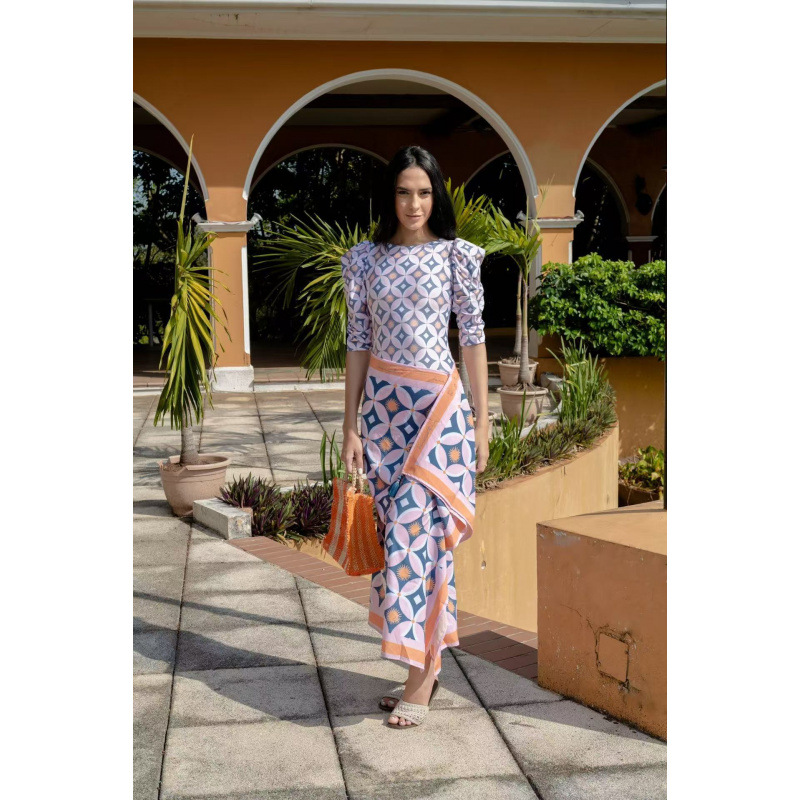 유럽과 미국의 프린트 긴팔 비키니 자외선 차단 비치 스커트 세트 비키니 크로스보더 아마존 보수적인 원피스 수영복