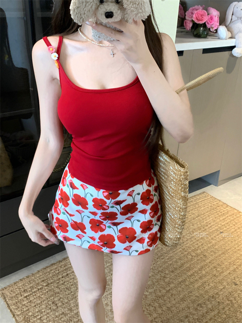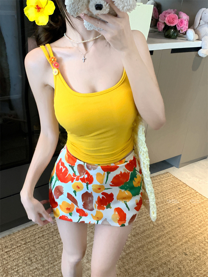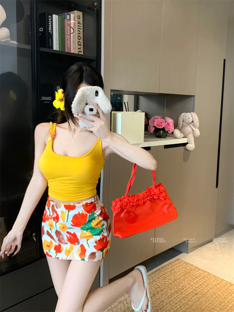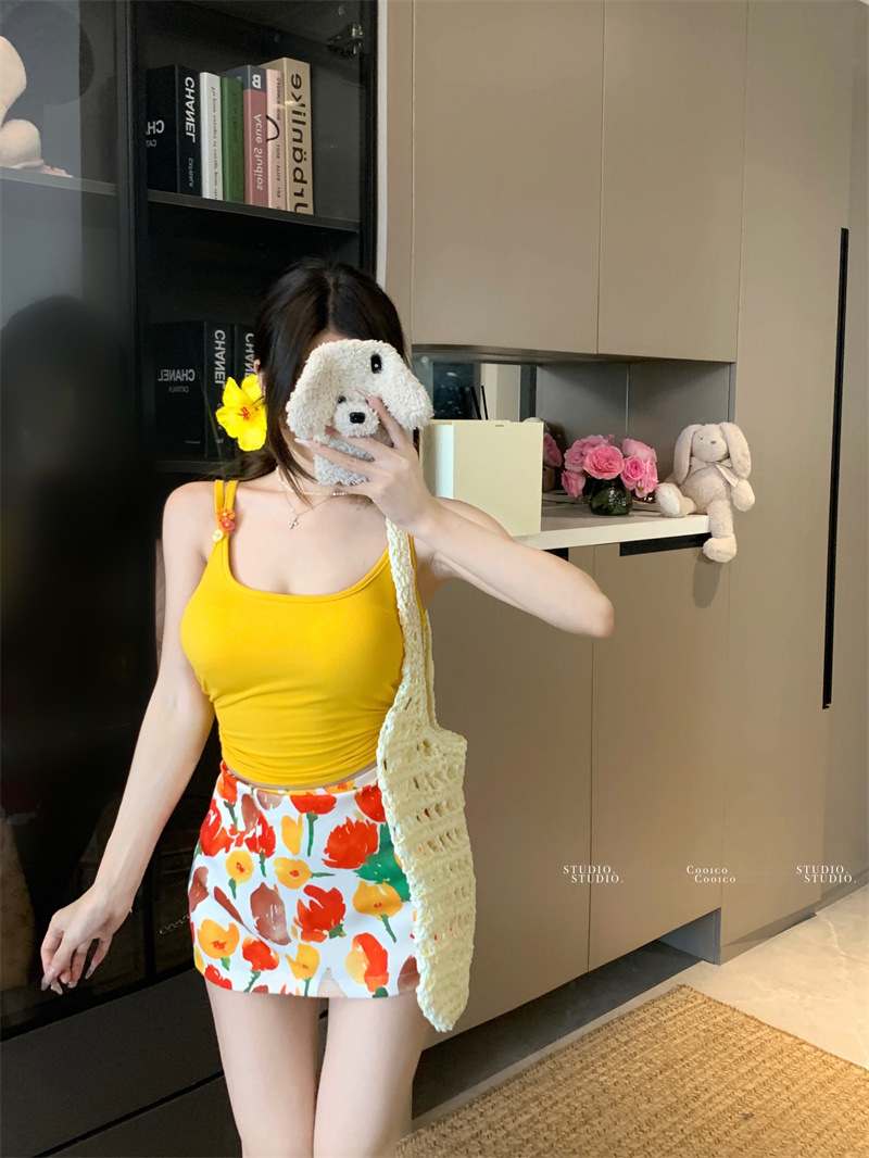 해변 의류 세트, 시크한 캐미솔 여성 여름 하이웨이스트 프린트 스커트, 힙 커버 스커트 투피스 세트