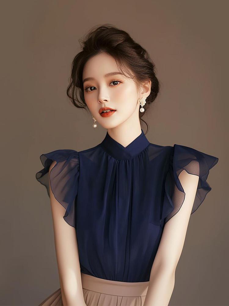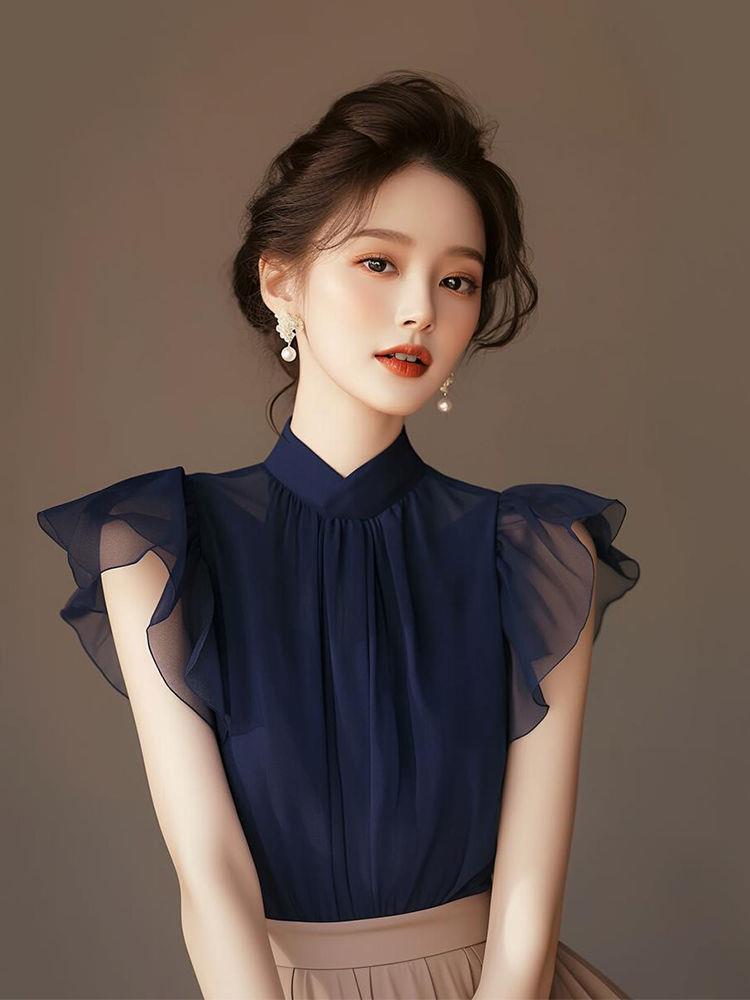 여성을위한 프랑스 독특한 블루 쉬폰 작은 플라잉 슬리브 탑 여름 새로운 아름다운 셔츠 라이트 럭셔리 시크 스탠드 업 칼라 셔츠스토어 가기