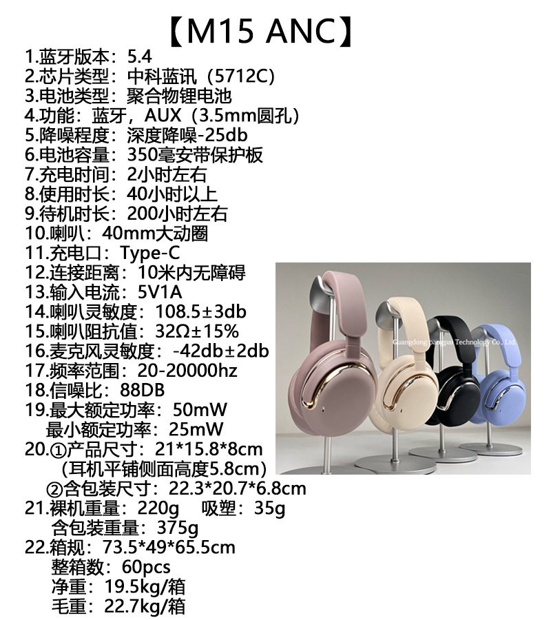 국경을 넘는 신제품 M15 능동 소음 감소 헤드셋 블루투스 무선 스포츠 장시간 배터리 휴대폰 이어폰 공장