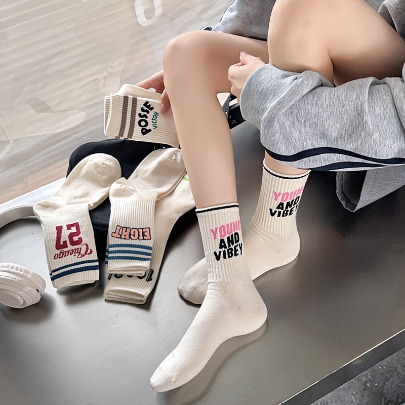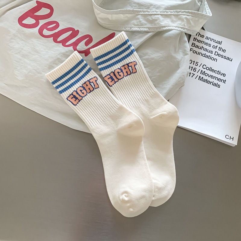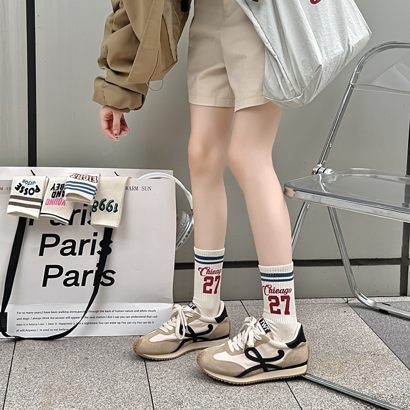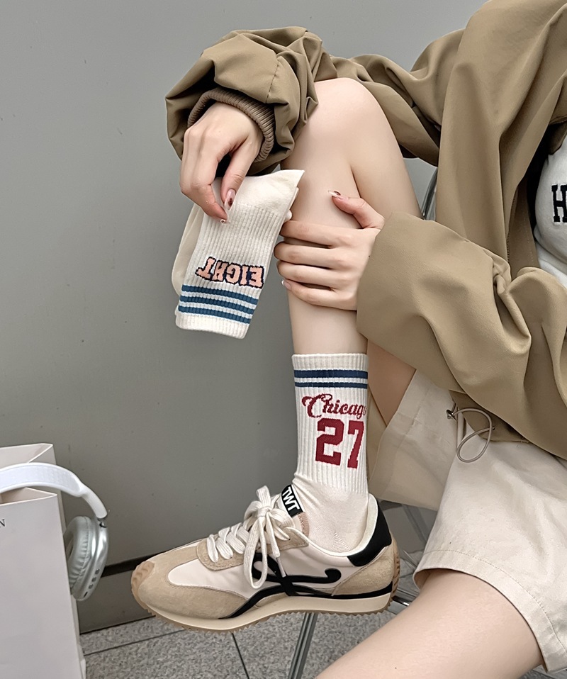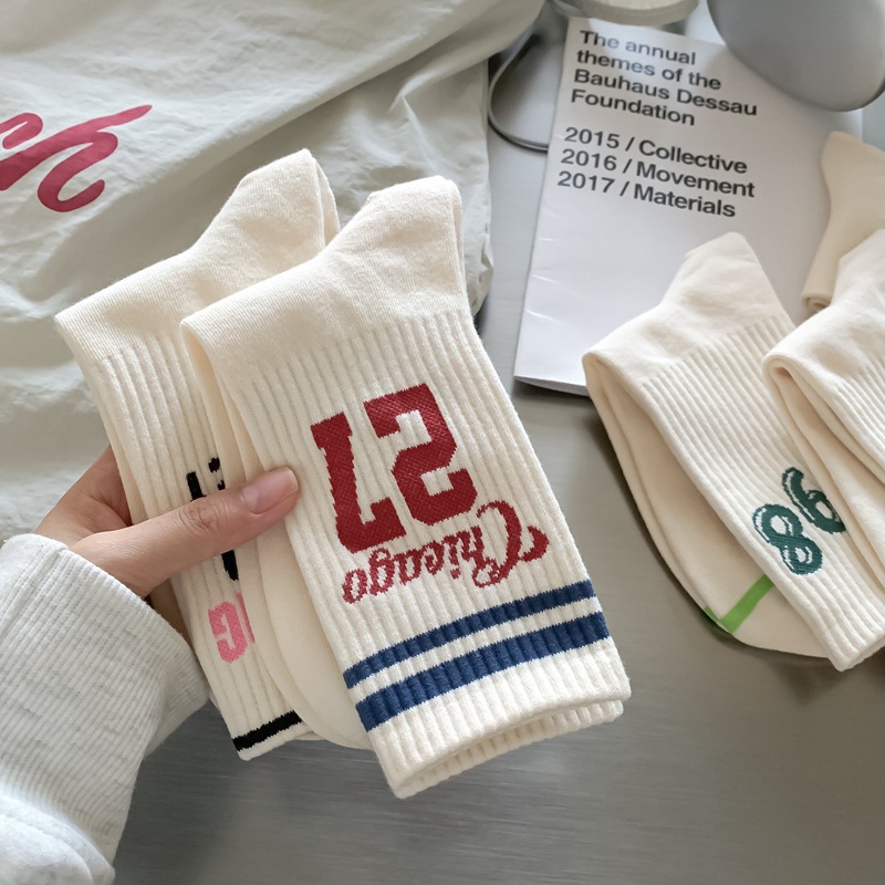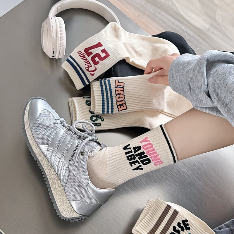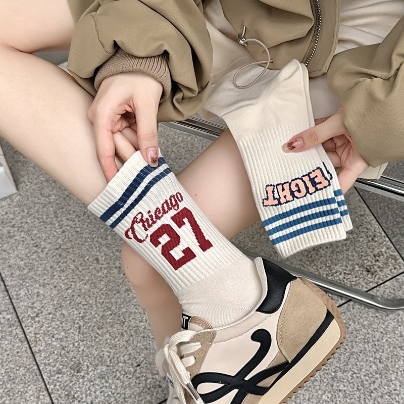 Zhuji 양말 여성 봄, 가을 순수 코튼 미드 튜브 양말 복고풍 유행 땀 흡수 및 탈취제 문자 줄무늬면 양말 스포츠 여성 양말스토어 가기