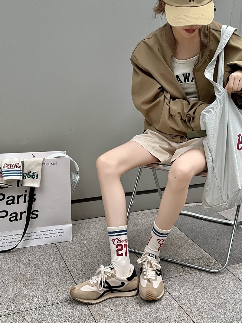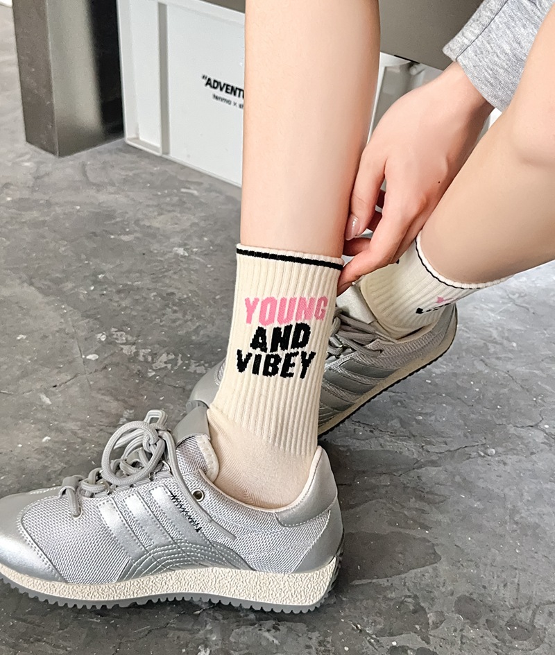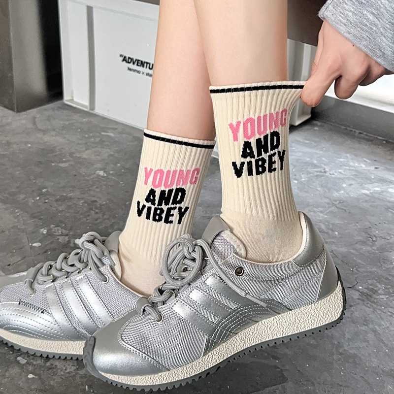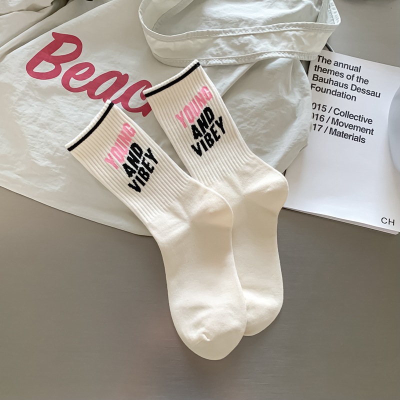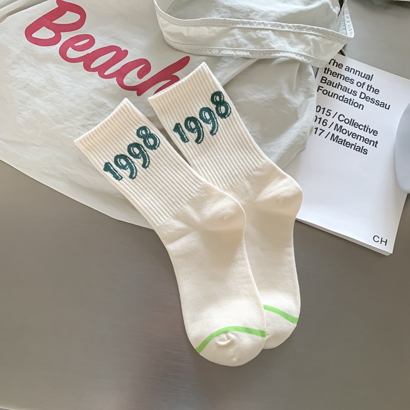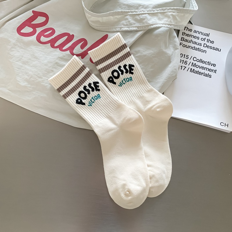 Zhuji 양말 여성 봄, 가을 순수 코튼 미드 튜브 양말 복고풍 유행 땀 흡수 및 탈취제 문자 줄무늬면 양말 스포츠 여성 양말스토어 가기