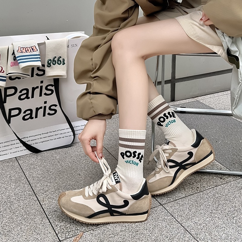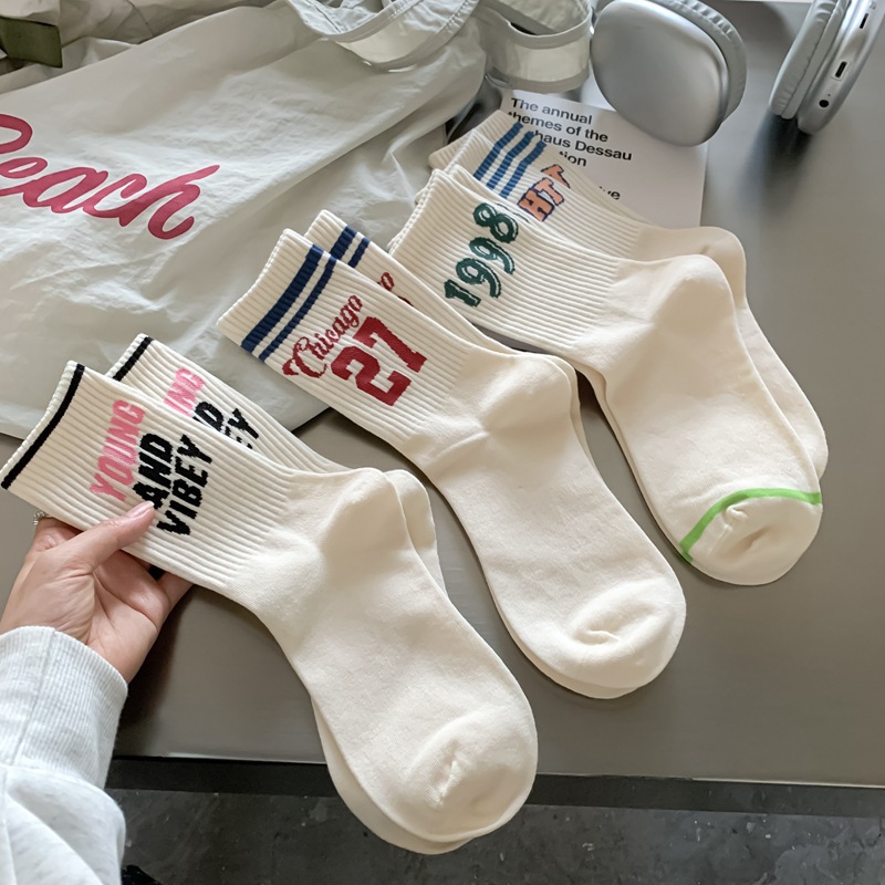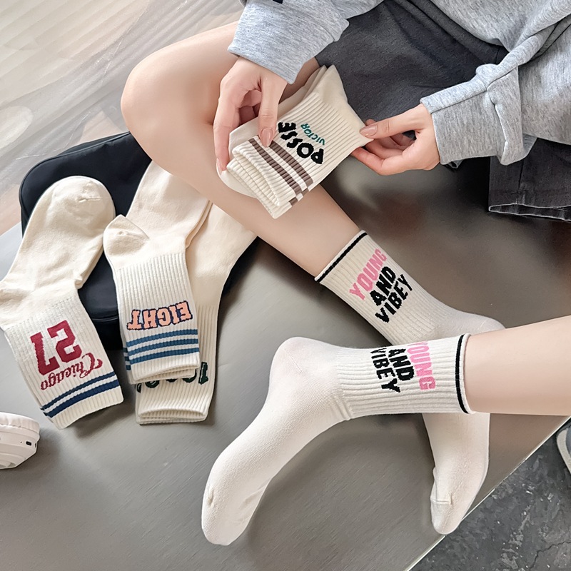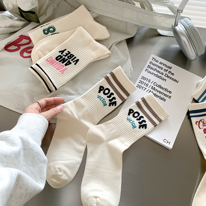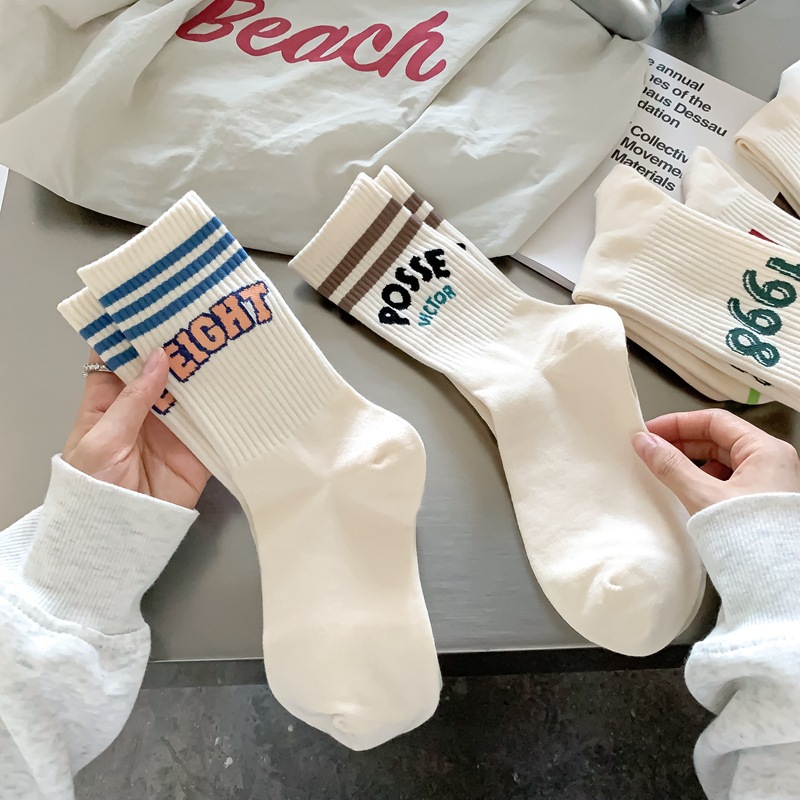 Zhuji 양말 여성 봄, 가을 순수 코튼 미드 튜브 양말 복고풍 유행 땀 흡수 및 탈취제 문자 줄무늬면 양말 스포츠 여성 양말