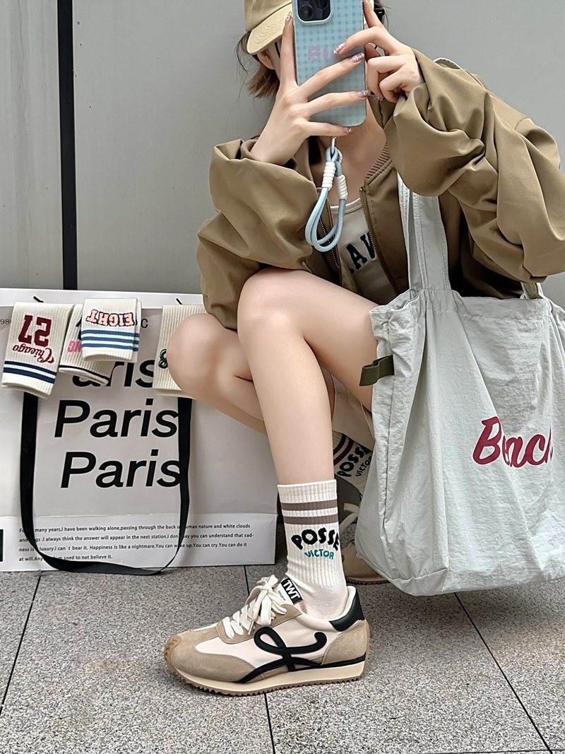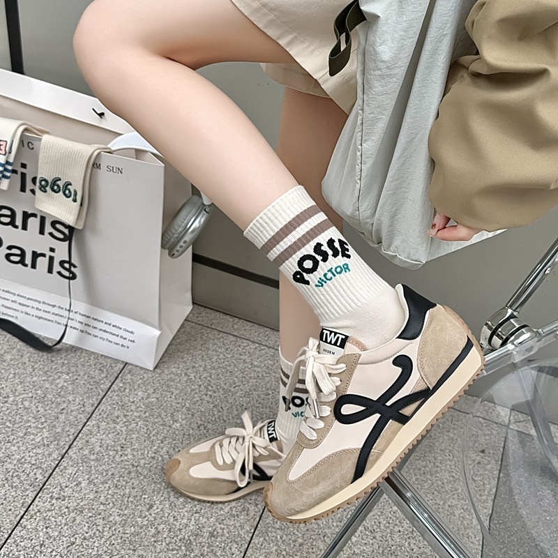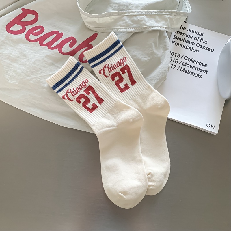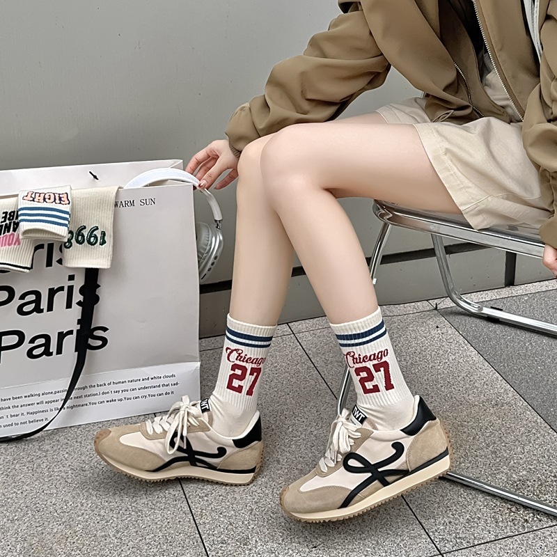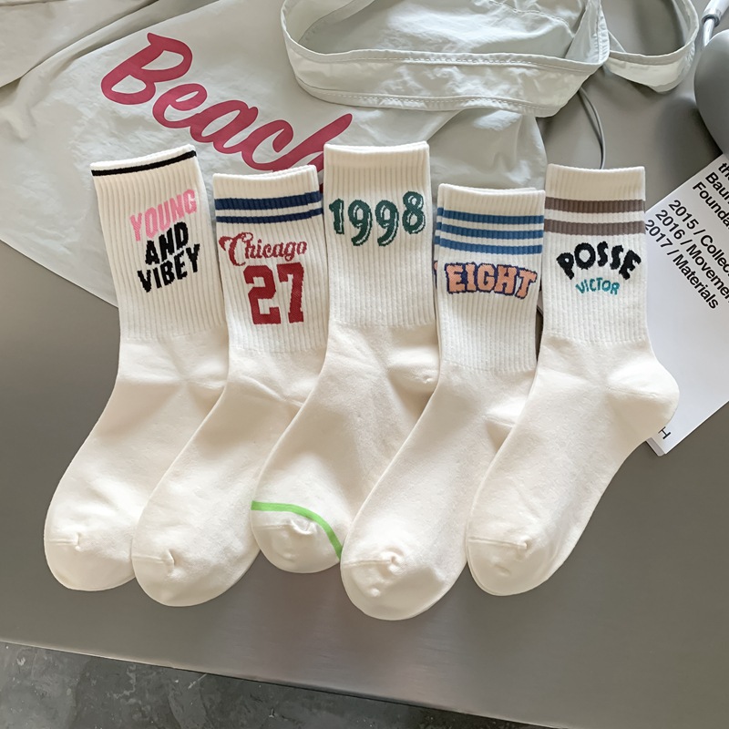 Zhuji 양말 여성 봄, 가을 순수 코튼 미드 튜브 양말 복고풍 유행 땀 흡수 및 탈취제 문자 줄무늬면 양말 스포츠 여성 양말