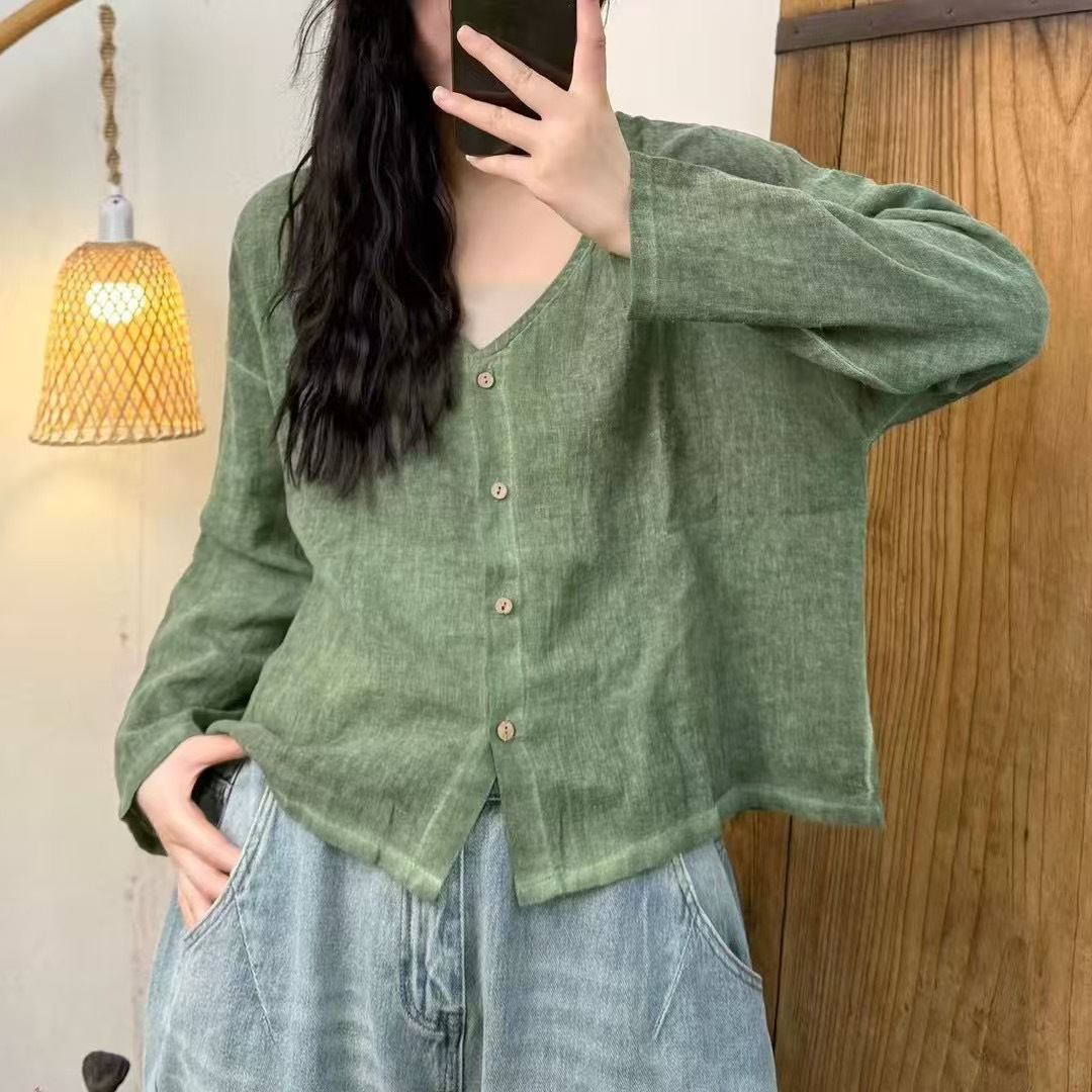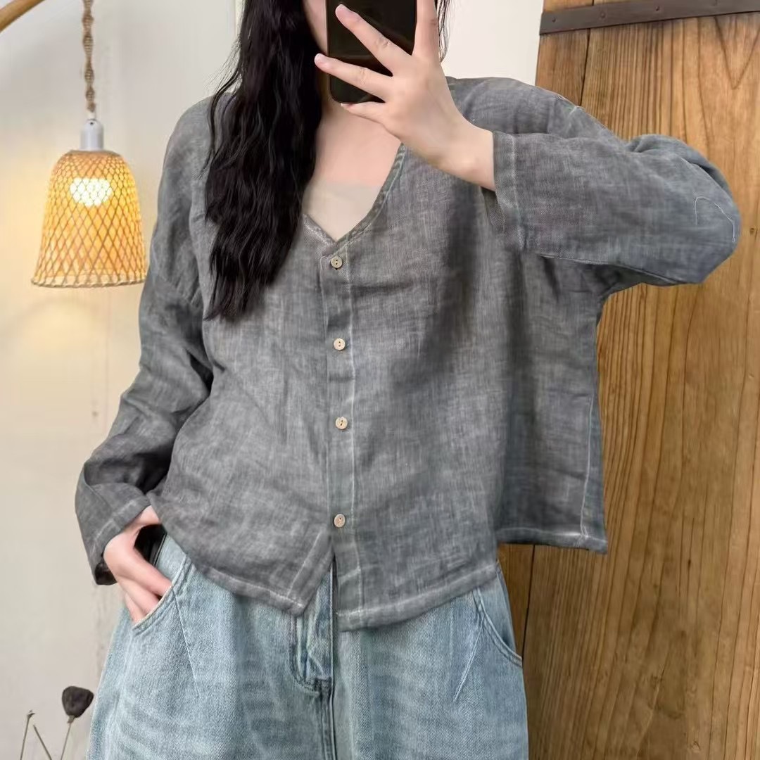 튀긴 모시 셔츠 2025 봄 여름 신작 레트로 디스트레스드 브이넥 긴팔 가디건 루즈하고 활용도가 높은 여성 상의